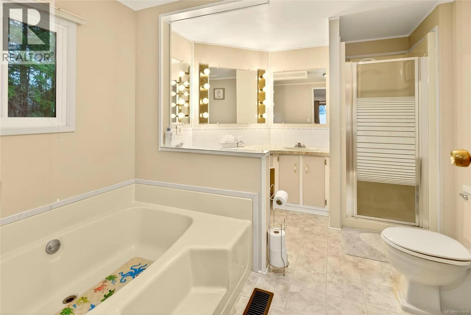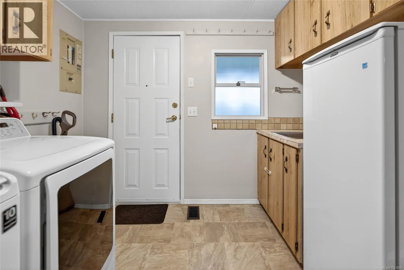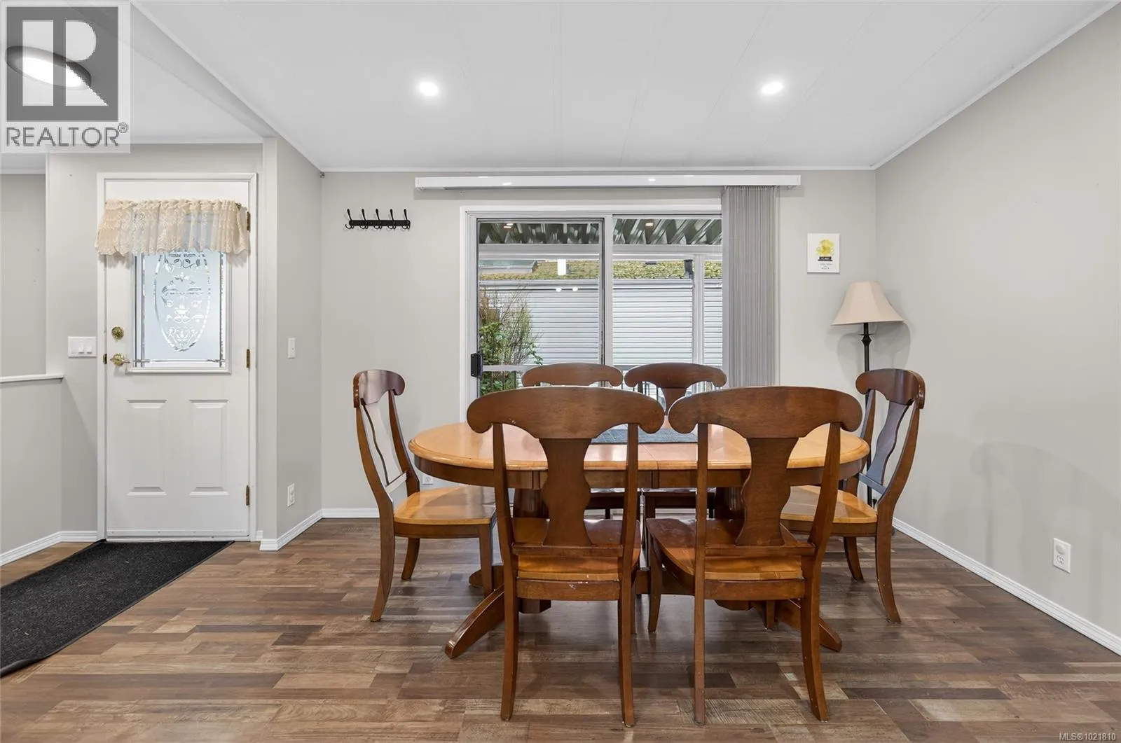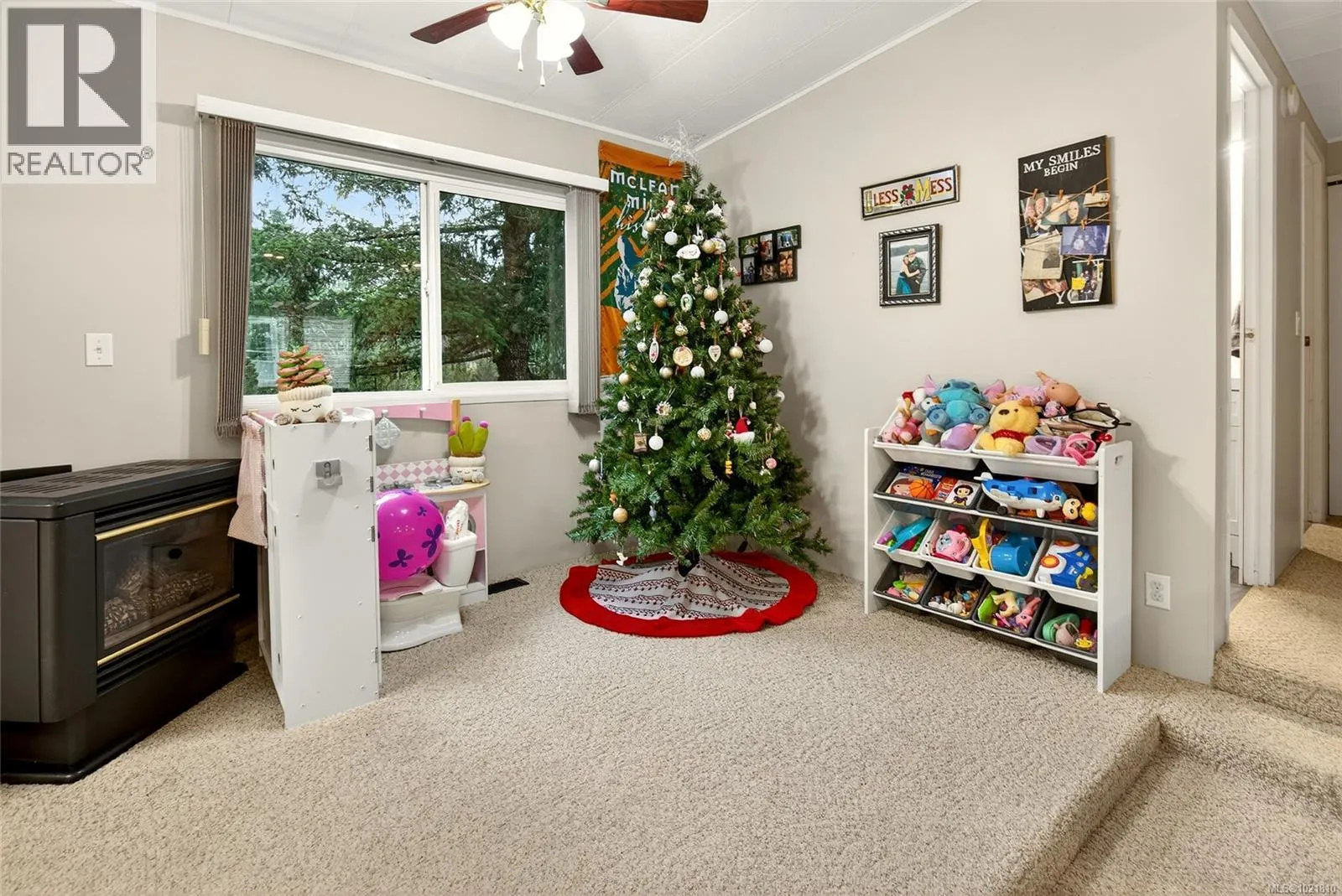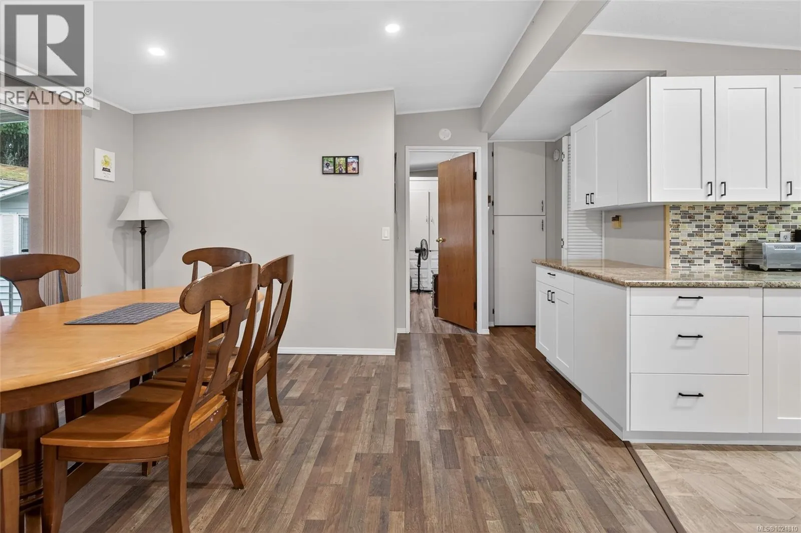 Great location! This double-wide manufactured home sits at the end of a quiet no-thru road in one of the Alberni Valleyâs most sought-after family friendly parks. Inside, the home offers a bright and inviting layout featuring a modern kitchen with a breakfast bar, a spacious living room with vaulted ceilings, a dedicated dining area with sliding glass doors to one of the two covered decks, a primary bedroom with a 5-piece ensuite, accompanied by two additional bedrooms, an updated modern bathroom, and a laundry room with access to the large covered back deck. A 14' x 18' detached workshop adds excellent space for projects, storage, or hobbies. Year-round comfort is provided by the updated heat pump(2024). This is a well-kept home in an excellent location, an opportunity you wonât want to miss. (id:27476)