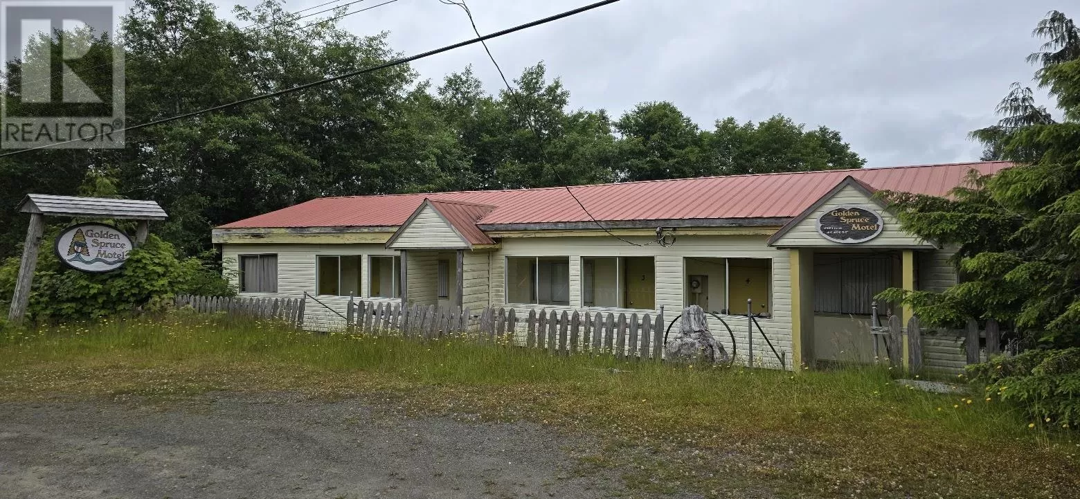 Incredible opportunity to revive a once-thriving 12-unit motel with restaurant, commercial kitchen, and a spacious two-bedroom owner's residence above. The Golden Spruce has a great location and big potential-currently not operating but ready to be re-launched with again as a motel or short term rentals. Zoned C-2 (Commercial Service), allowing for motels, contractor housing, restaurants, retail, and more. Ideal for a boutique lodge, staff housing, or a self-check-in Airbnb setup -- demand for accommodations on Haida Gwaii remains high year-round. Some units are functional, BRING YOUR HANDYMAN!. Facility Includes a laundry facility, commercial kitchen, owners residence and courtyard. Restaurant area could be leased separately for income. Priced to sell at this price. Shown by appointment only -- bring your vision and breathe new life into this Haida Gwaii landmark. (id:27476)