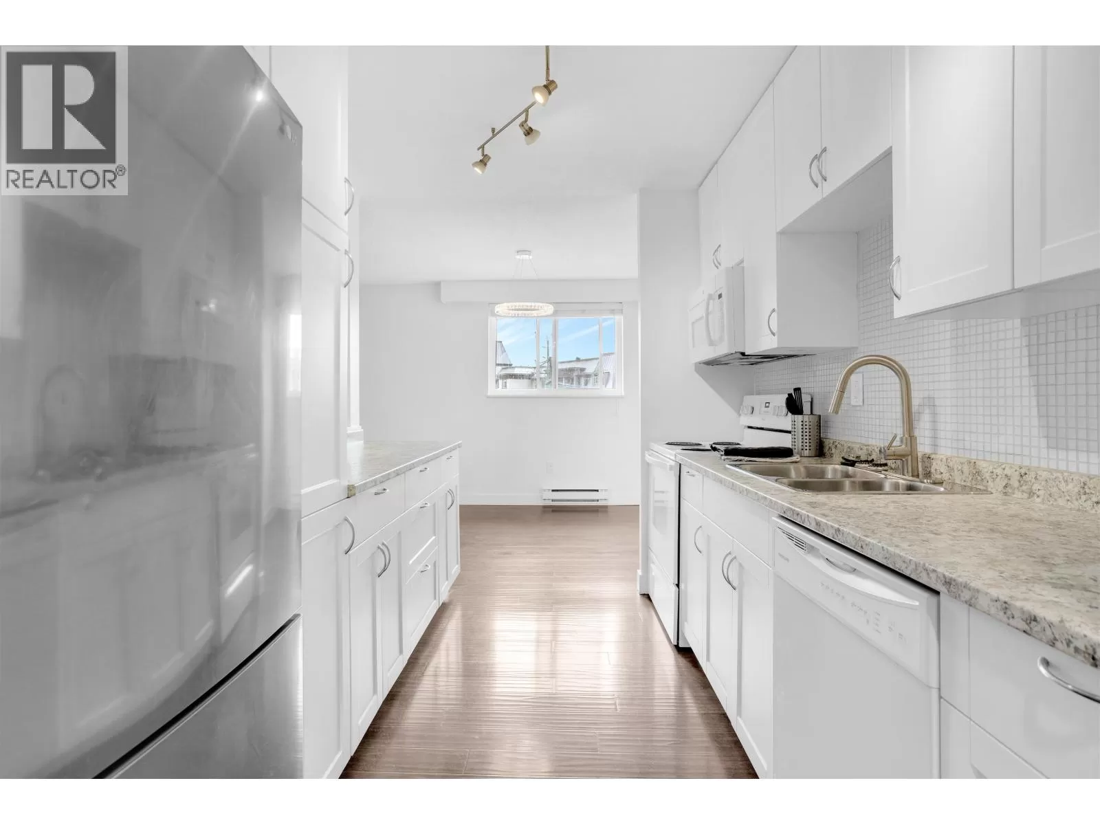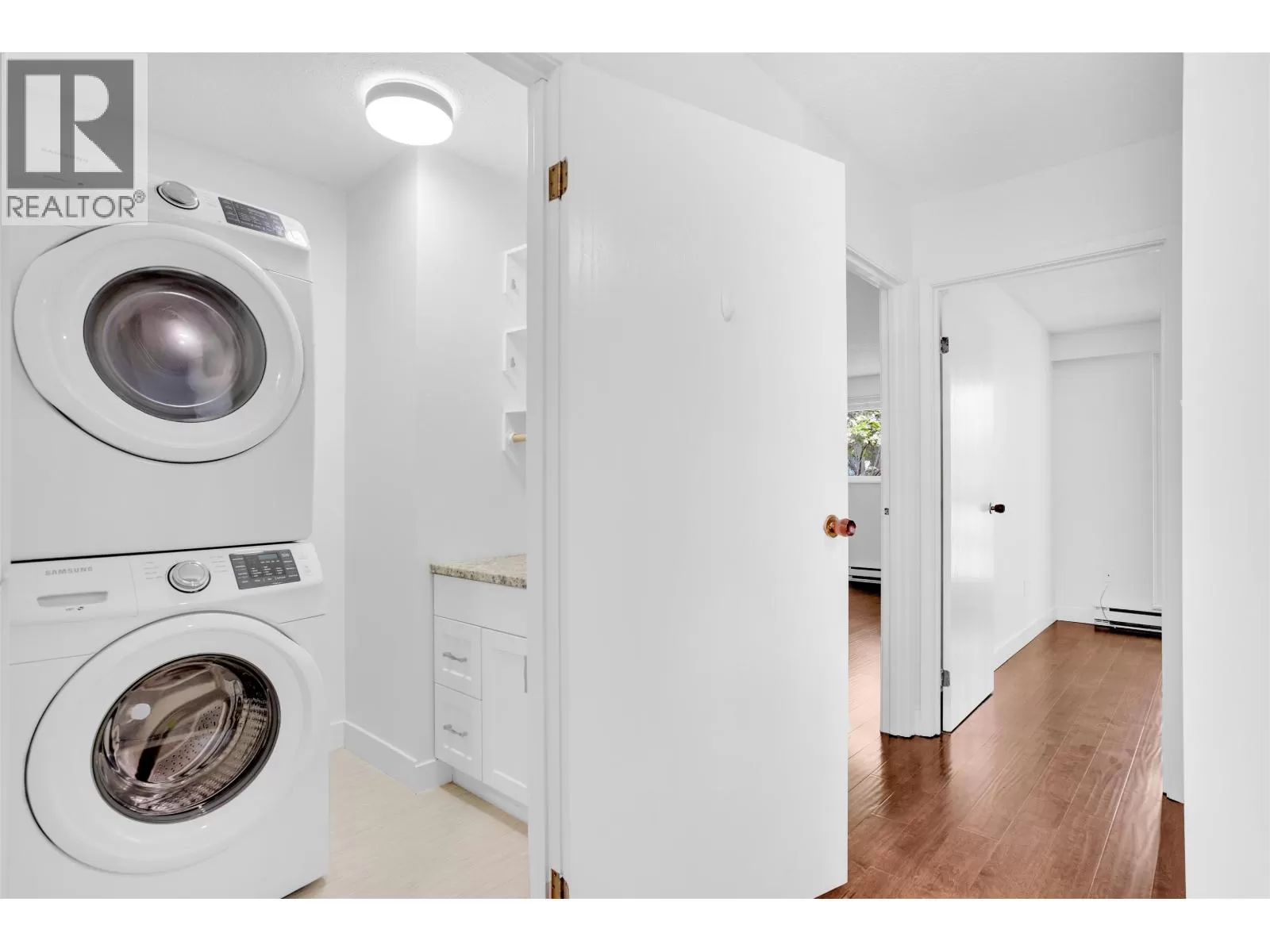 Move in ready! This bright TOP CORNER two bedroom condo is waiting for its new owner. Bright home faces South East and has lots of natural light. The layout works well with two spacious bedrooms and large living/dining space. The primary bedroom has a cheater door through a walk in closet and into your bathroom. Bonus laundry room with storage is a real plus! Freshly painted, built in closets and renovated kitchen and bathroom makes it easy to just move in without the stress of having to do renos. One parking and one locker. Very well maintained strata and great building! No pets allowed. Book your private showing today! (id:27476)