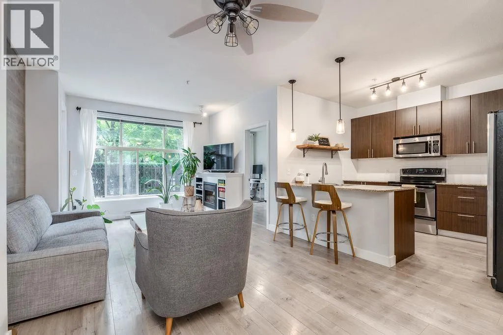 Welcome to your new home! This ideally situated ground floor 2 bedroom 2 bathroom unit with private entrance is immaculate and won´t last! It's a perfect starter, downsizer or investment property with recent upgrades including laminate flooring throughout, granite counters, custom lighting, custom electric fireplace, custom dining room wall feature, paint and more! The ground floor location offers a huge gated balcony with private street entrance just half a block to the newly refurbished Gates Park and all the shopping, recreation, restaurants and transit Downtown Port Coquitlam has to offer. Comes with 1 underground parking spot plus gym and a theatre room! Excellent quality building, very well run strata, everything you need in one convenient location! Book your private showing today! (id:27476)