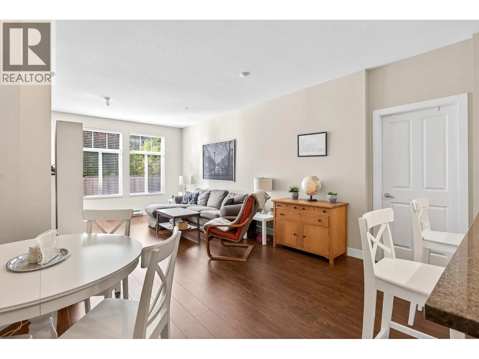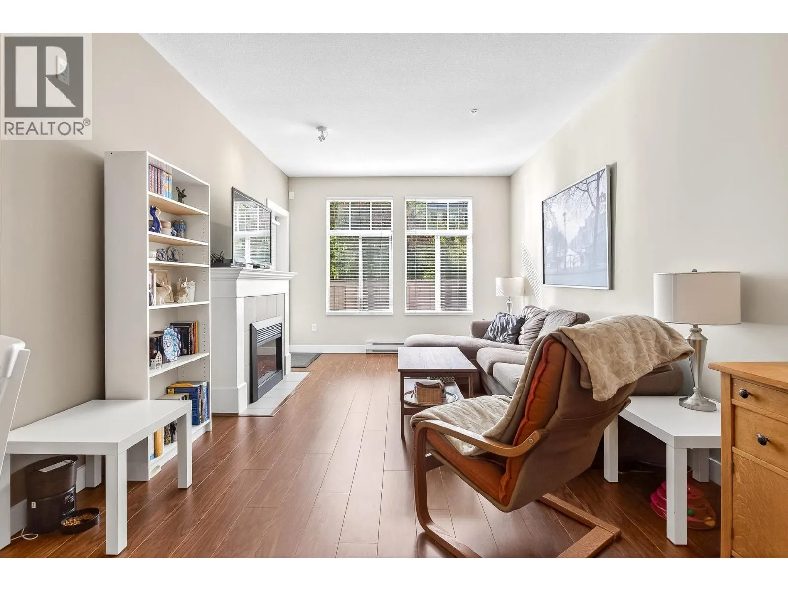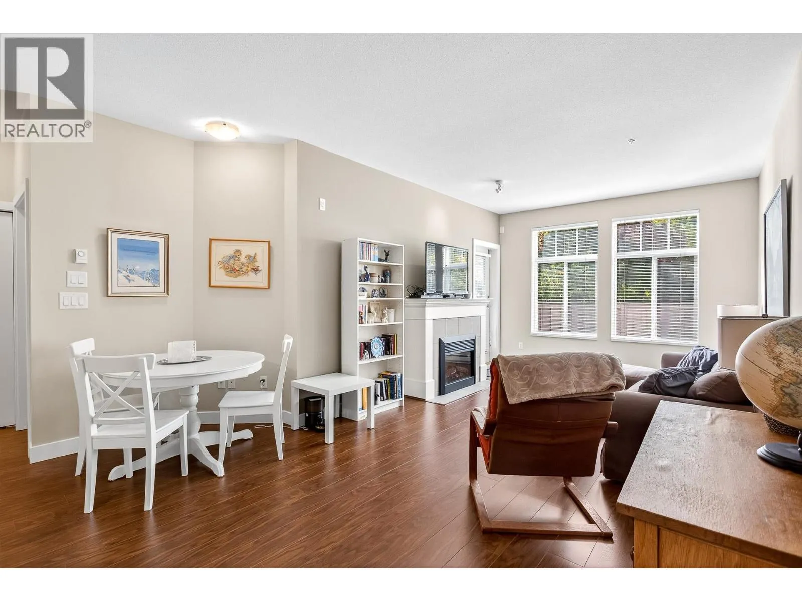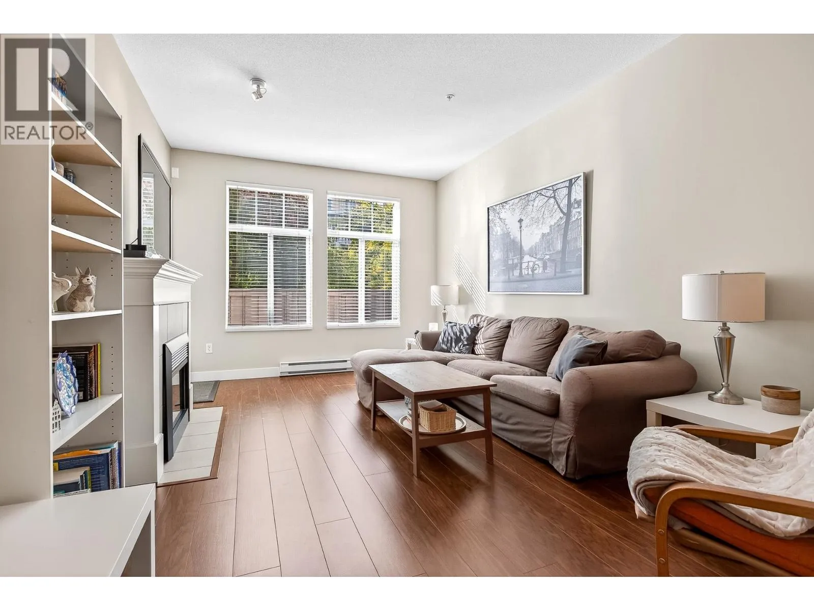 Charming ground-floor two-bedroom, two-bathroom home with its own private entrance and expansive patio - perfect for morning coffee or evening relaxation! Enjoy the open-concept layout featuring a spacious kitchen with a large island and generous overhang for casual dining. The dedicated eating area flows seamlessly into the cozy living room, complete with a fireplace & bright south-facing windows that fill the space with natural light. The primary bedroom offers a walk-in closet and full ensuite bath, while 9-foot ceilings throughout add a sense of airiness and comfort. Includes one parking stall and a storage locker. (Extra parking available through strata.) Just steps from shopping, PoCo Trail, rec. centre, and transit - this home offers convenience & comfort in one ideal package! (id:27476)