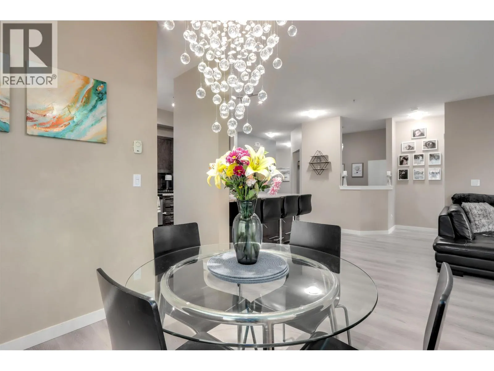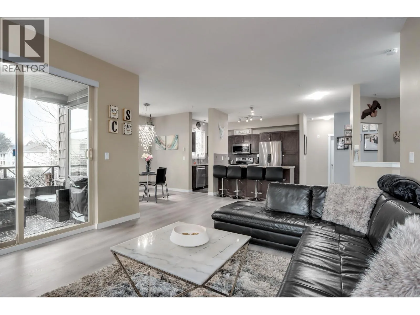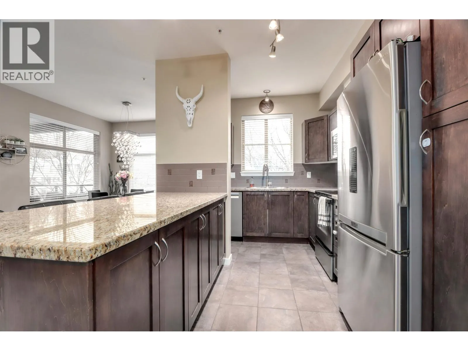 Largest home in the building! Stunning 1,214 sq.ft. NW corner condo surrounded by greenery and natural light. 9' ceilings and an open, modern layout create a bright, airy feel. Stylish kitchen with large island flows into spacious living & dining areas-perfect for entertaining. 2 bedrooms plus den offer ideal space for living, working & relaxing. Updated with vinyl flooring, fresh paint, lighting, washer/dryer, fridge, dishwasher & microwave. 1 parking, insuite storage, guest suite, proactive strata. 2 pets ok (dogs under 20kg, no bully breeds). Prime downtown Port Coquitlam location-steps to shops, cafes, and trails along Coquitlam River. A rare find when nature & convenience meet! (id:27476)