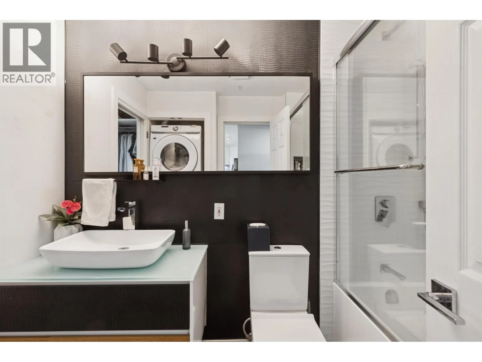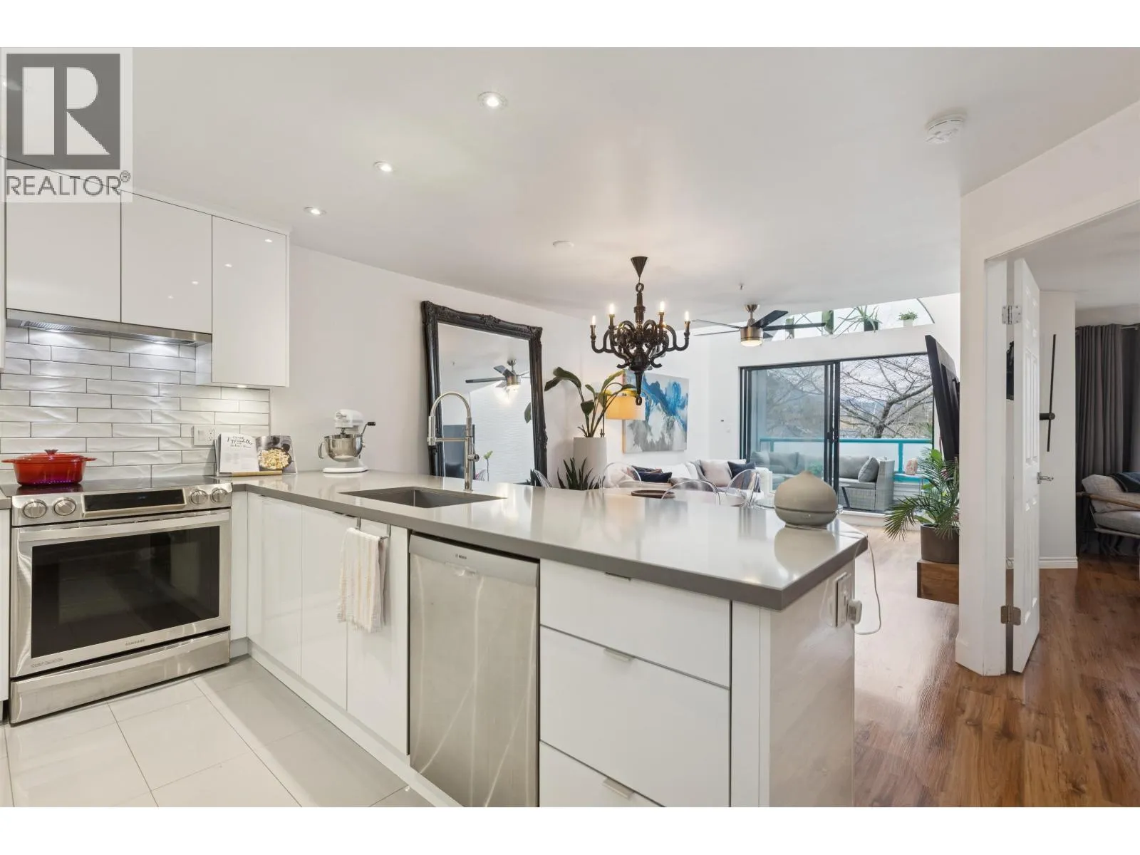 Beautifully updated TOP LEVEL home at Portica West! Enjoy custom high-gloss cabinetry, quartz countertops, porcelain tile flooring and high-end appliances. A 12-ft kitchen peninsula offers ideal bar seating. The bathroom features upgraded tile, rain shower, body spray, deep soaking tub, modern vanity, new toilet and faucets. Fresh paint, updated lighting, new baseboards, new hardwood floors, and skylights complete the home. Amenities include a lounge, rooftop patio, exercise room and sauna. Close to transit, schools, shopping and restaurants! Check out virtual tour https://pixies.et/YLSeAje8 (id:27476)