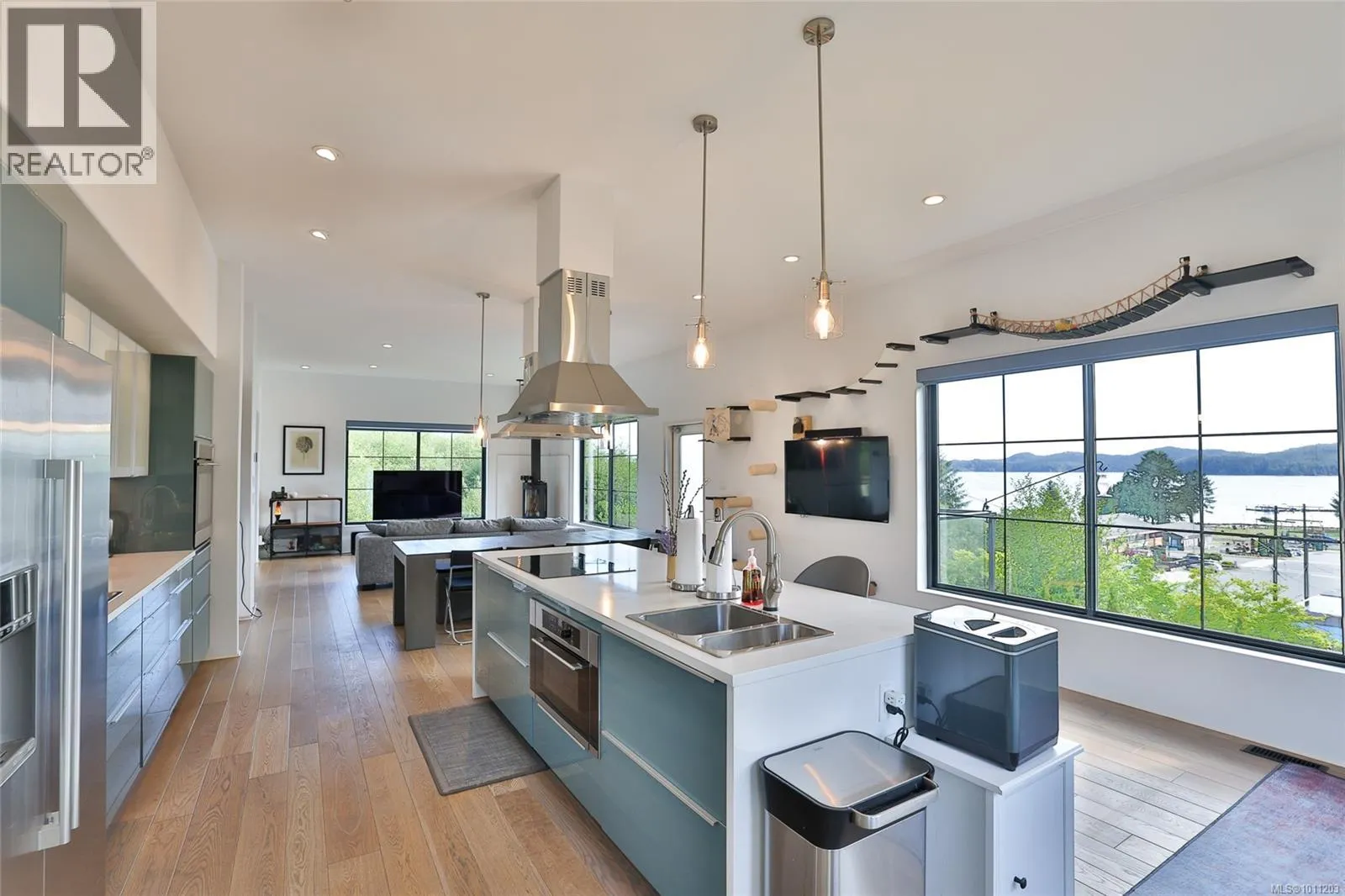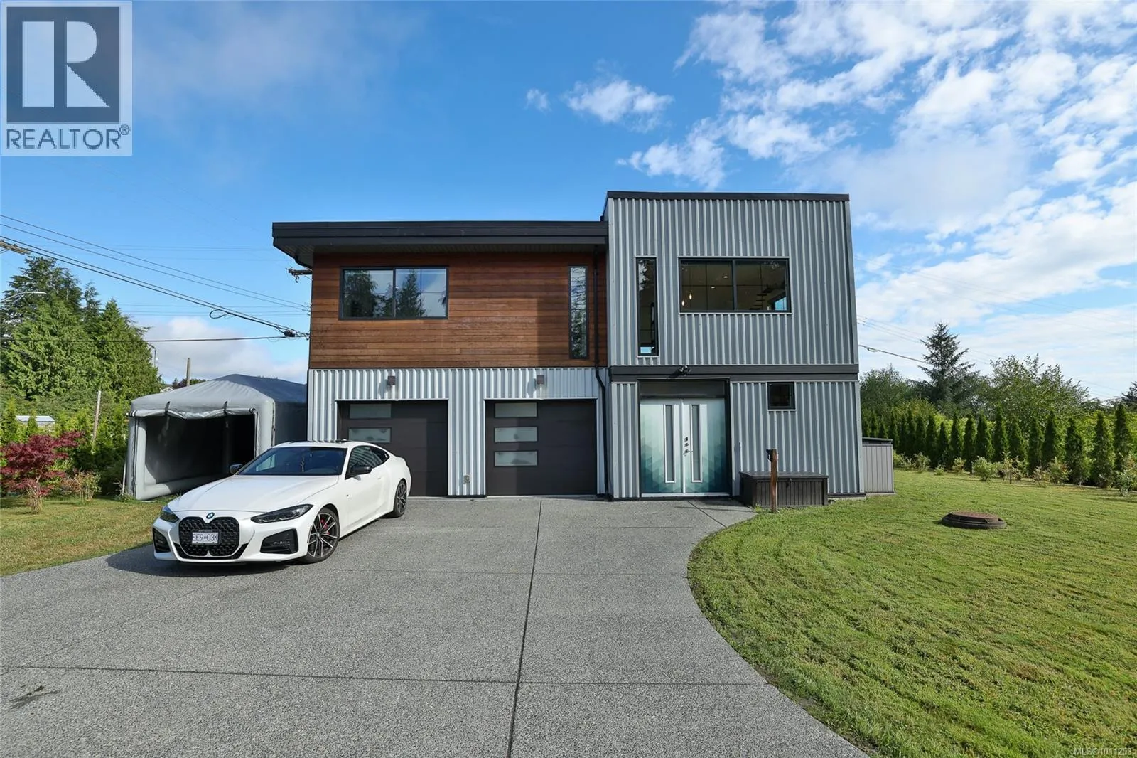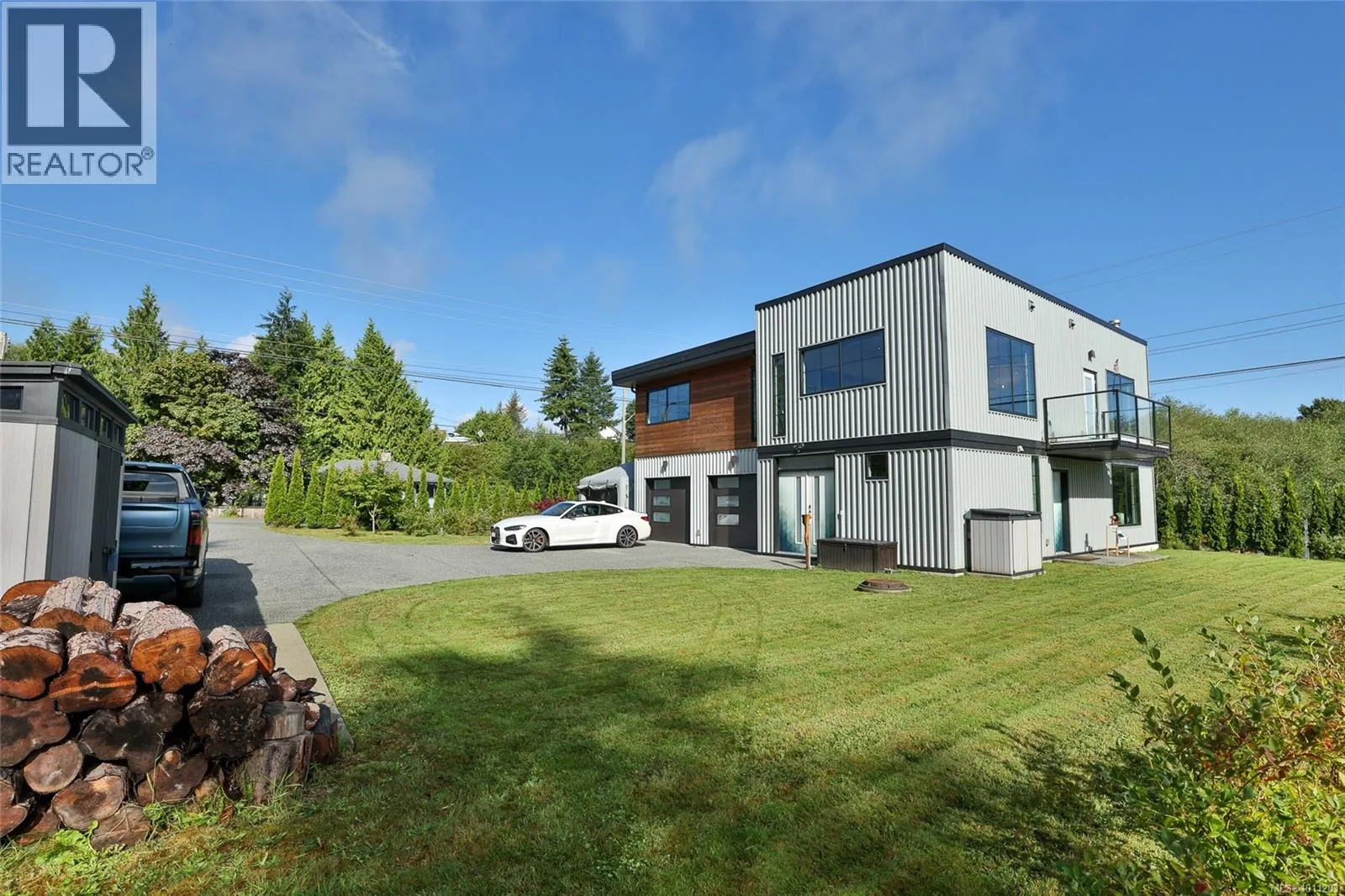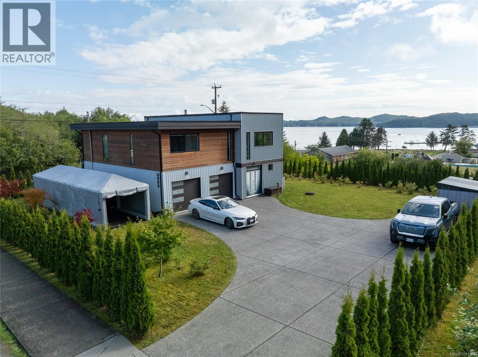 Perched on the top of Pelzer's hill is this fully furnished, ultra modern ocean view home in walking distance to everything downtown Port Hardy. 3 years remaining on home warranty for this 2 bedroom plus den, 3 bathroom, 3 car garage Aspire Custom Design home. The lot below is included in this sale, to ensure your privacy and unobstructed view remains. Welcome your guests into the large entrance on ground level with beautiful epoxy painted concrete. The ground level also offers a pantry, entrance to the garage and maintenance room, home gym (equipment included), bathroom, bedroom area with murphy bed and access to the yard. Come on upstairs to the very open area concept living, kitchen and dining - all with a great view. Wake up to the amazing sunrises right from the comfort of your bed. The main bedroom has a large walk in closet and beautiful ensuite. The second bedroom on this level is at the opposite end of the house with it's own ensuite as well. Many nifty, chic and smart surprises in this home including remote blinds & lights, heated/wash/dry toilet seats. Generator, garden shed (for wood) and the ultimate wall mounted cat obstacle course for that spoiled furry friend. The yard is fully enclosed with privacy hedge and a galore of blueberry bushes. Call your Realtor today to check out this very contemporary abode with more surprises to discover on your tour. (id:27476)