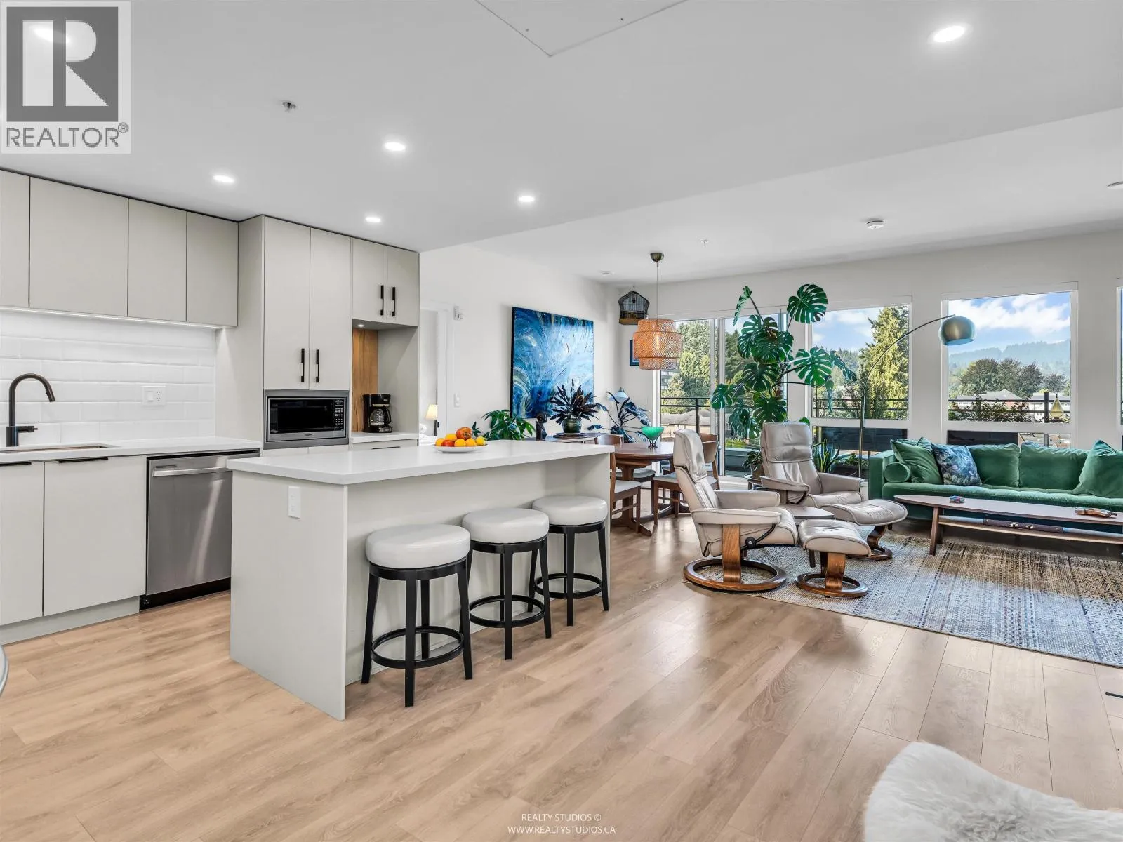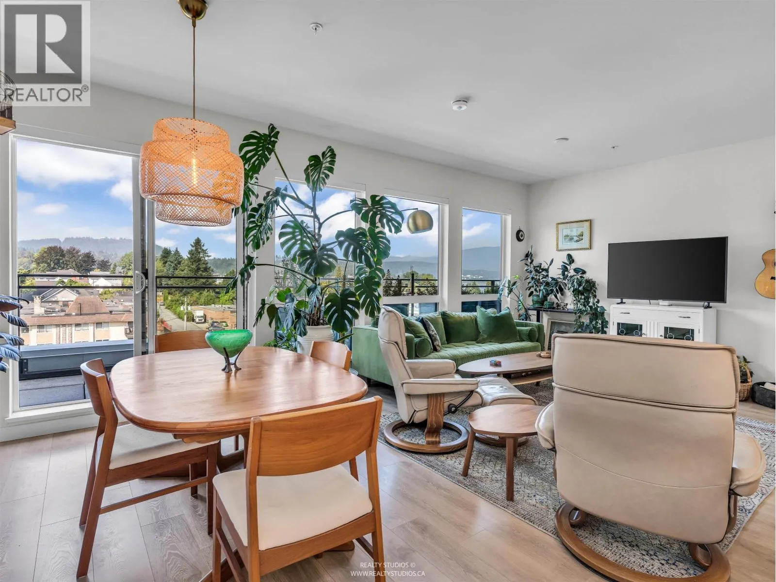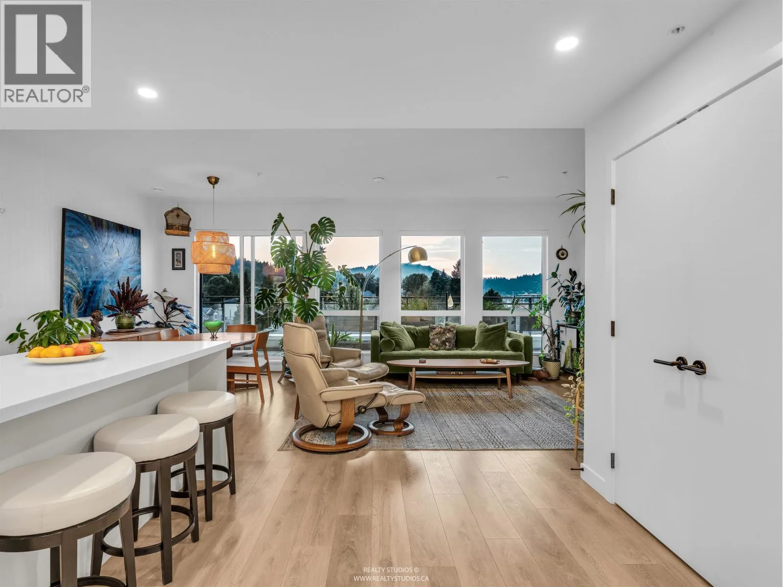 Spacious 2 bed, 2 bath penthouse condo in the George by Marcon in Port Moody. Enjoy the spectacular sunsets and Mountain views ( partial ocean views) from the large balcony. Open floorplan with high ceilings and great light! Air conditioned. Full sized stainless steel appliances including a gas stove. Tons of storage! Motorized roller blinds throughout. Blond oak laminate flooring. Both bedrooms are large enough for a king sized bed and have spacious walk in closets. Primary bedroom is ensuite with radiant in-floor heating and double vanities. Laundry room has side by side washer and dryer. Two parking stalls and a large private storage room. Located just 5 minutes away from both Moody Centre SkyTrain Station and the West Coast Express. Balance of new home warranty. Pet friendly building. Open House Saturday and Sunday Oct 4+5 2PM-4PM (id:27476)