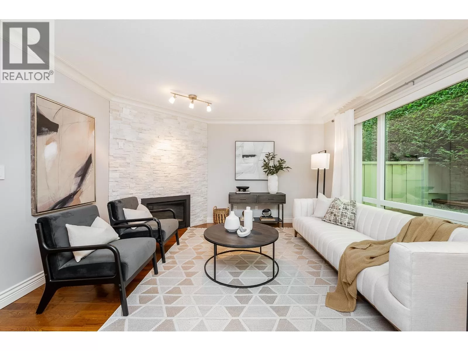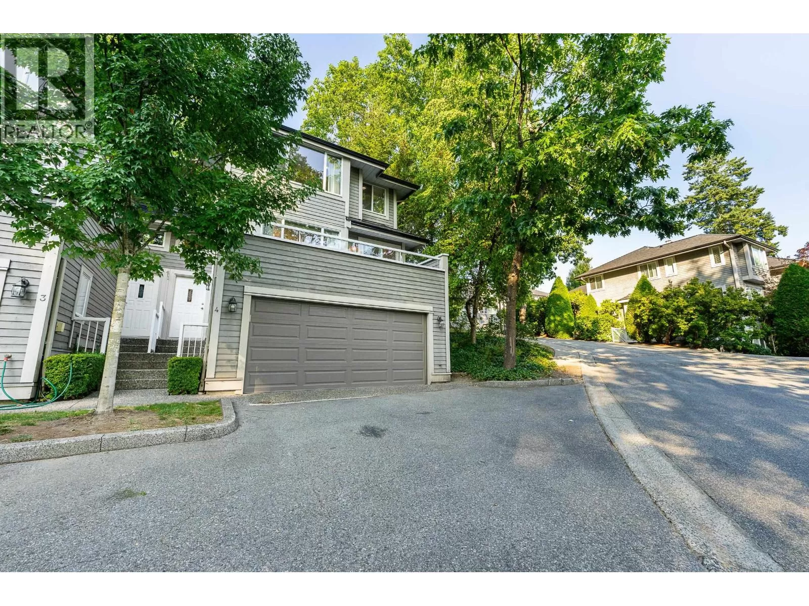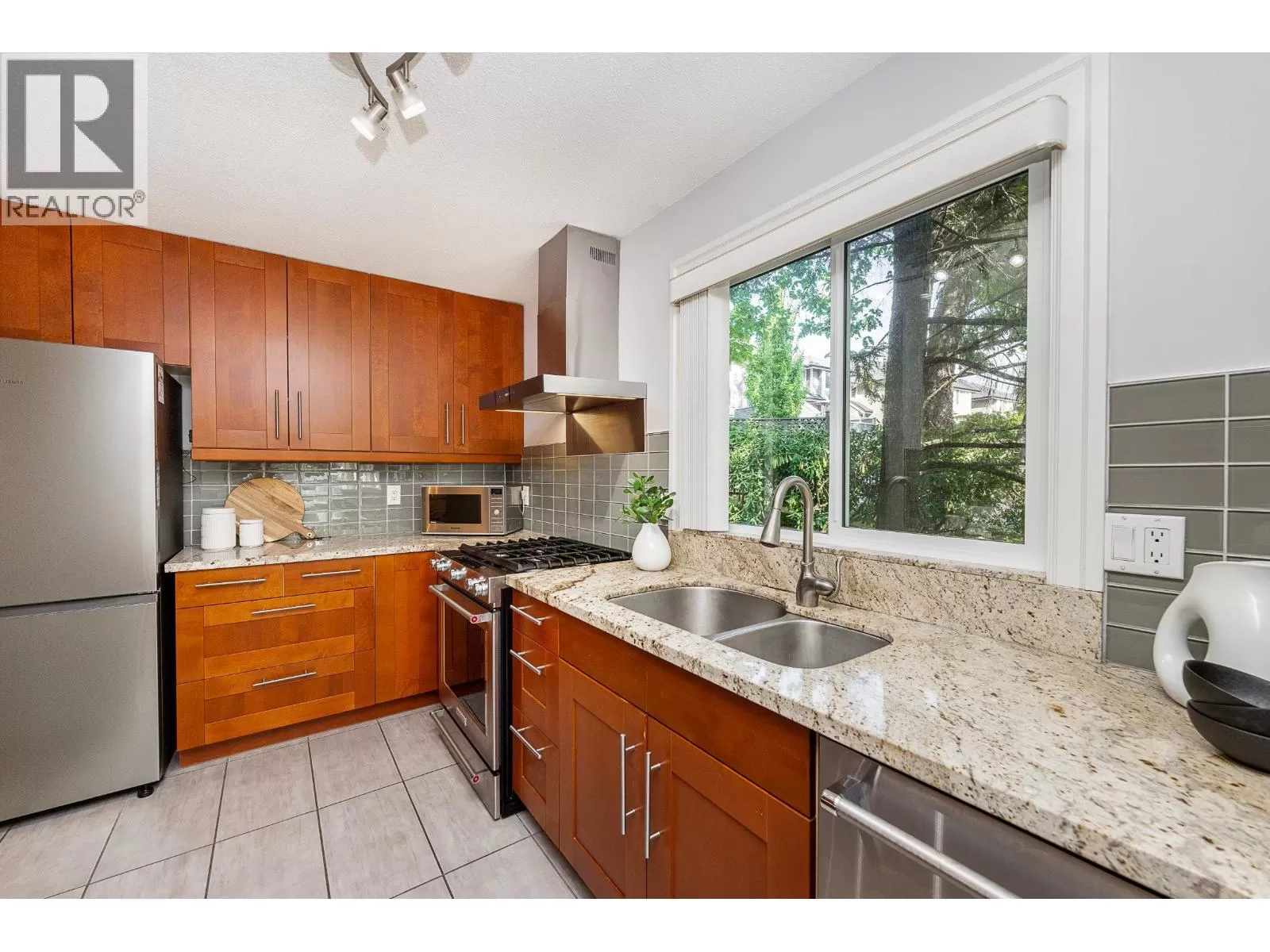 Beautiful END-unit townhome with AIR CONDITIONING! This 2,471 square ft home offers a spacious, family-friendly layout in a private setting, with 3 beds + 3 renovated baths. The main features a bright kitchen w/granite counters, S/S appliances, gas cooktop and new fridge, seamlessly connected to the family room and eating area w/access to a sunny, South-facing balcony. Formal living and dining area w/gas FP and updated surround opens to a serene patio spanning the width of the home. Upstairs are 3 generous bedrooms, including a primary with walk-in closet + 4-piece ensuite. The lower level offers a large rec room with window, den, ample storage, and double car garage. New windows + balcony, and rough-in for 4th bath. Located in a sought-after catchment, including Heritage Woods Secondary. (id:27476)