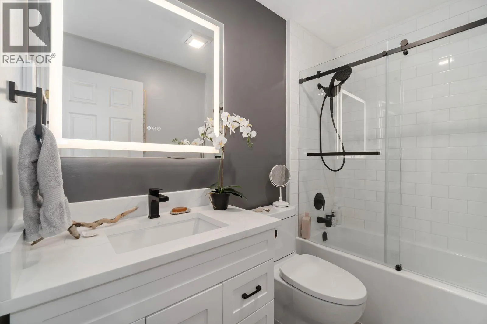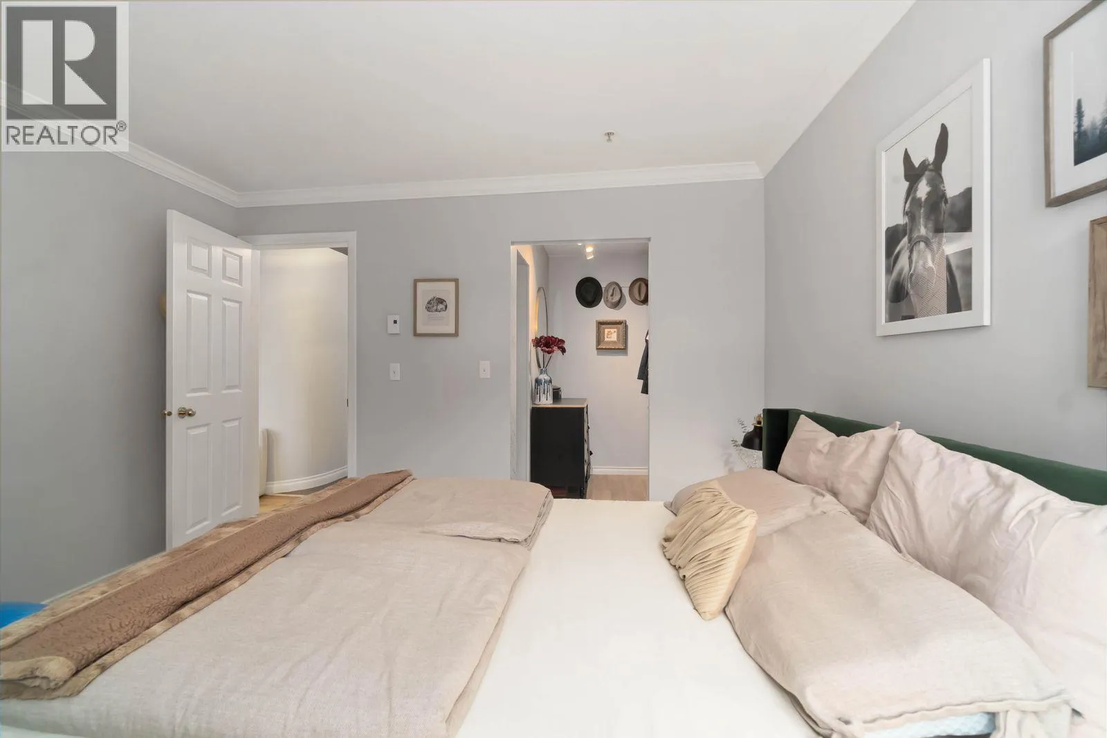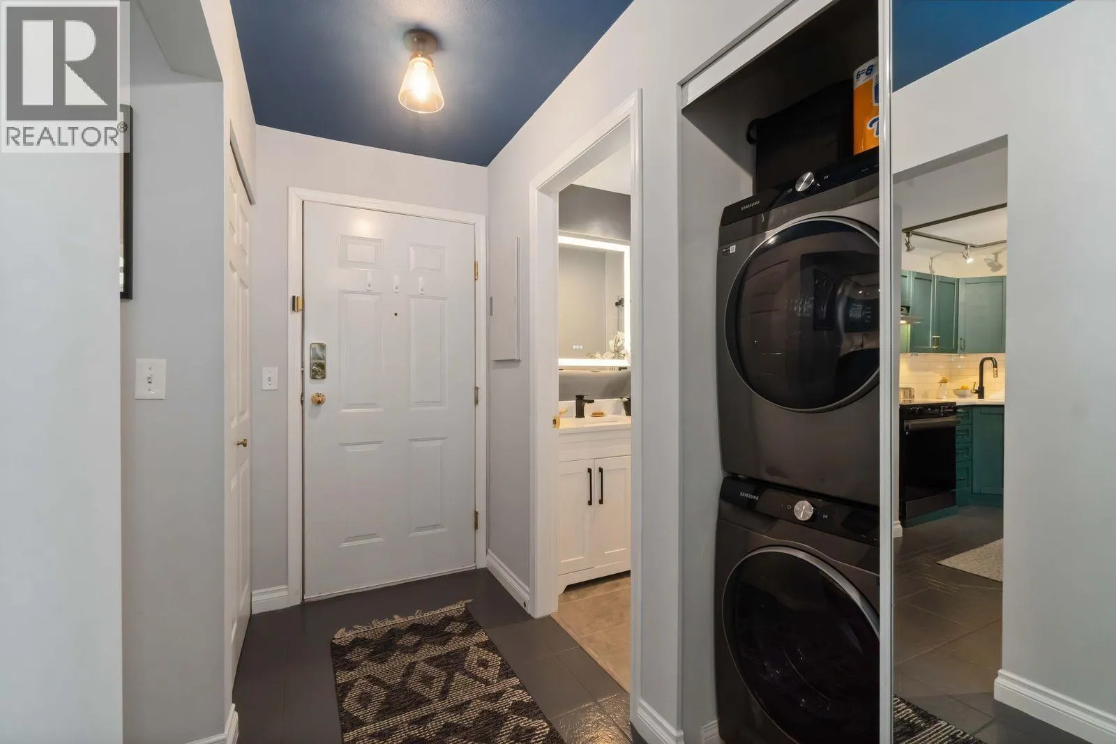 Welcome to HERITAGE GRAND at Newport Village. Experience top-floor living in this beautifully updated 2 bed 1 bath home located in the heart of Port Moody. Featuring 12' ceilings in main living area, open concept layout cozy gas fireplace creates a perfect space for relaxing & entertaining. The kitchen shines with new quartz counters, s/s appliances, backsplash, sink & faucet & a breakfast bar. Enjoy the large NW-facing balcony. The primary bed offers a generous w/i closet & 2nd bed overlooks the peaceful inner courtyard. New 4 pc bath. New hot water tank & new paint throughout - making this home move-in ready. Well maintained bldg., pet friendly. 2 Parking! Walk to Rec Centre, Library, Rocky Point Park, Brewer's Row, Skytrain, Suterbrook & Newport Village. Immaculate! OPEN HOUSE SUN NOV 16, 1-3. (id:27476)