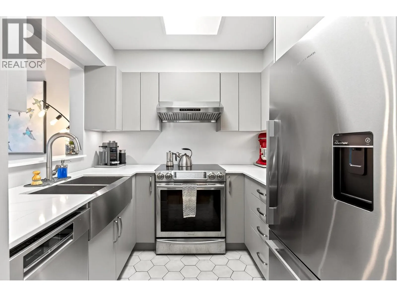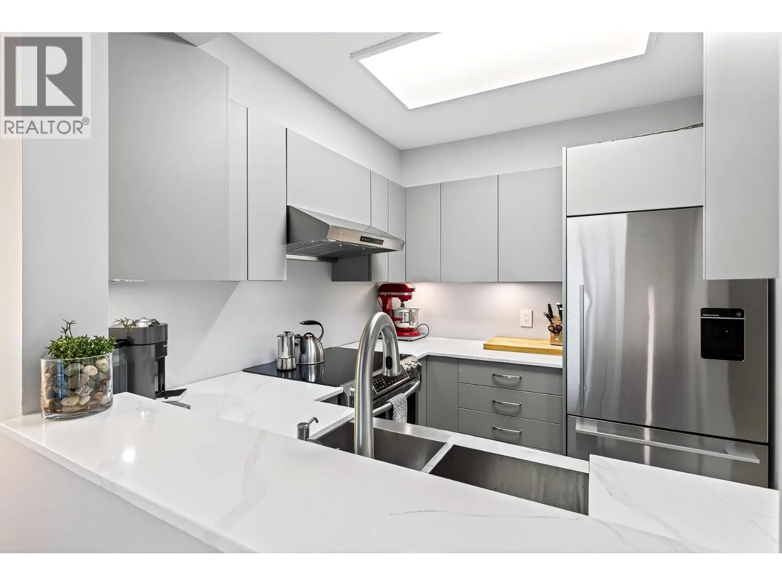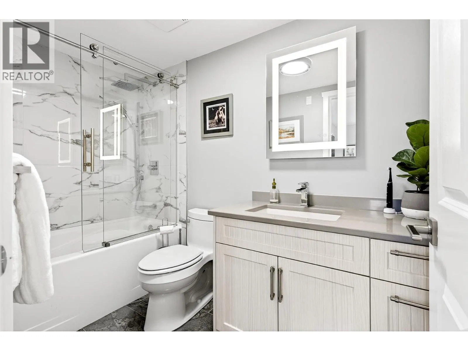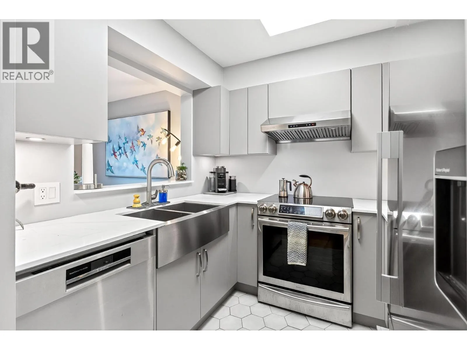 Penthouse-style living in the heart of Newport Village! This spacious 1-bed + den/or dining room offers a bright, open feel with tasteful updates throughout, including engineered H/W flooring. The renovated kitchen features new cabinets and s/s appliances (2020). A proper foyer and fully renovated 2-pc powder room enhance the great layout. The living room includes a cozy gas fireplace with new tile surround and sliders to a deck where you can enjoy the lively Village atmosphere. The large primary suite offers a WIC with built-ins, new carpet, and a remodelled ensuite featuring a soaker tub with marble surround, updated vanity, and new flooring. Fresh paint throughout. 1 parking (add´l rentals available) + storage. Steps to shops, dining, Inlet trails, and SkyTrain! (id:27476)