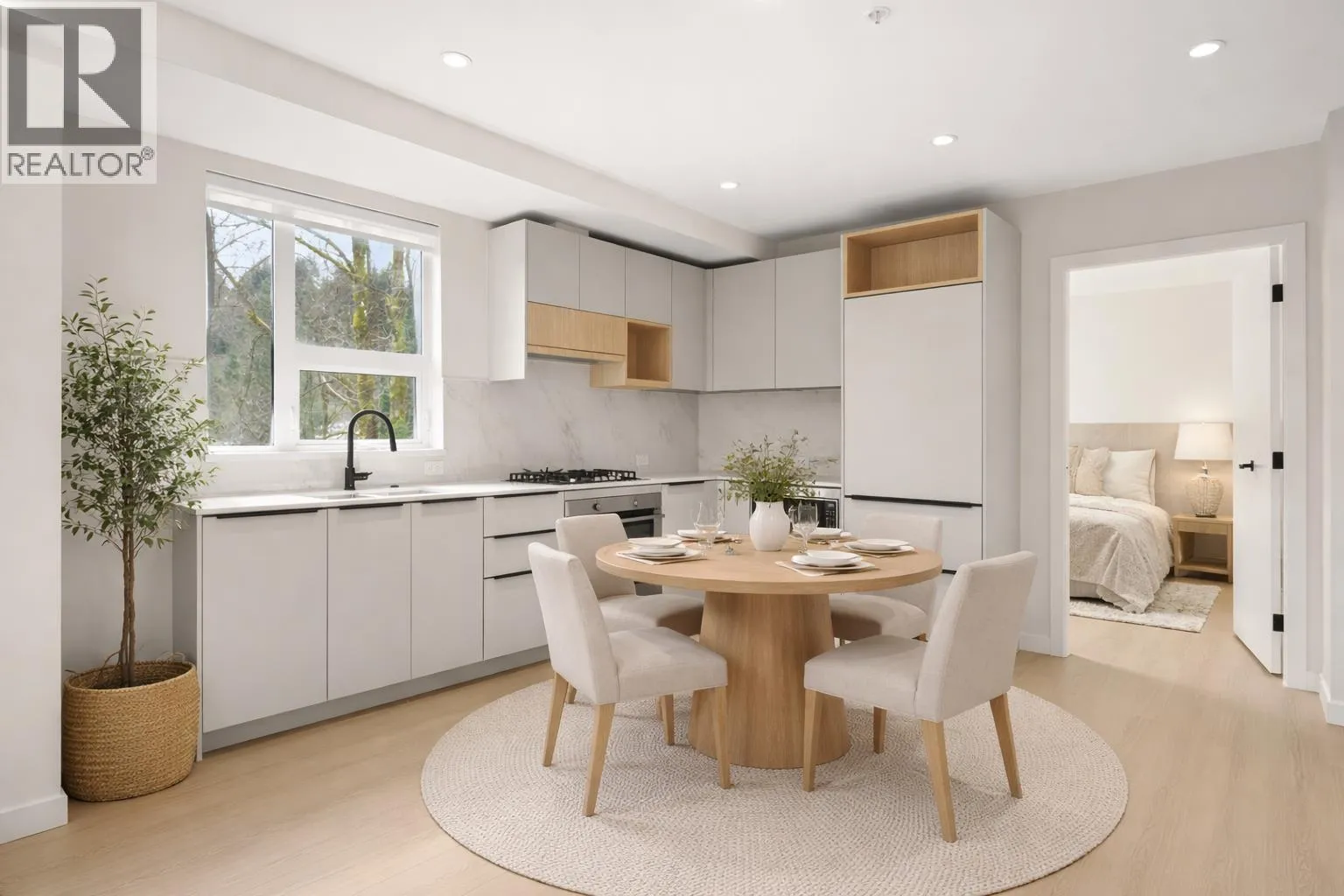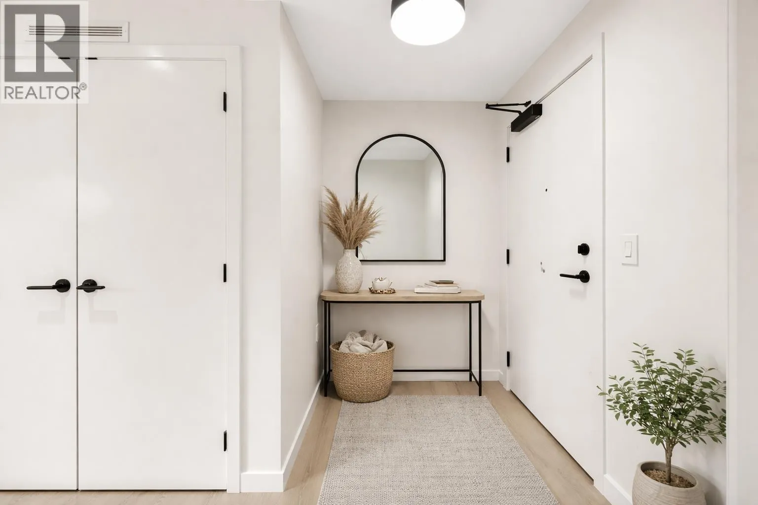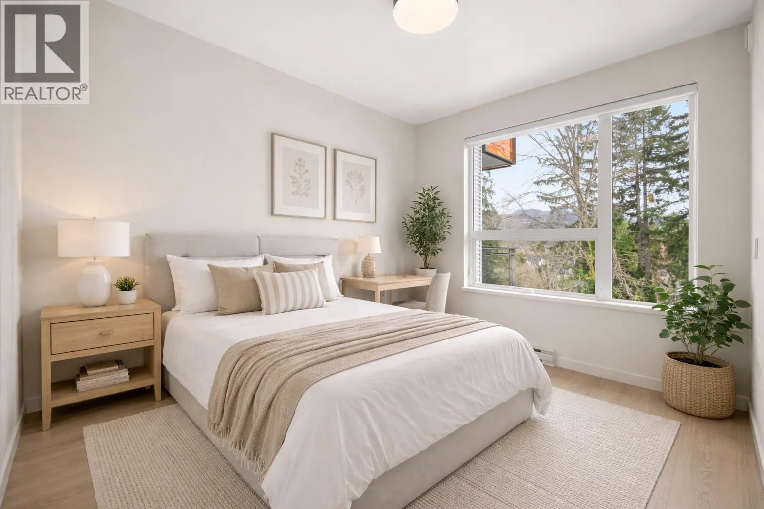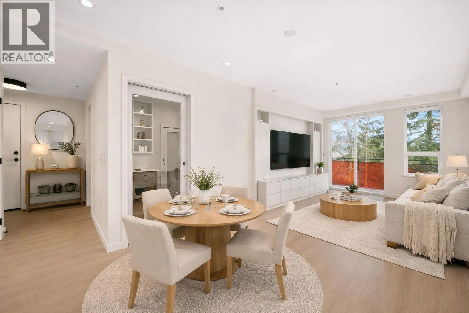 CORNER UNIT | WRAP-AROUND PATIO | CUSTOM MILLWORK | 2 BED + DEN / 2 BATH | This spacious 2 bed / 2 bath + den home features an abundance of windows, flooding the interior with natural light. Well-designed layout with custom TV millwork, added pantry & extra storage throughout. The enclosed den is ideal for a home office. Modern kitchen showcases European-style flat-panel cabinetry with integrated appliances, including a 30" Liebherr fridge, 30" AEG 5-burner gas cooktop, and 24" Fulgor dishwasher. 2 large bedrooms accommodate king-size beds with plenty of storage. Primary includes a walk-in closet & private double vanity ensuite. Enjoy scenic Mountain & River views on your private, oversized patio. Walking distance to all local amenities, the perfect condo does exist! (id:27476)