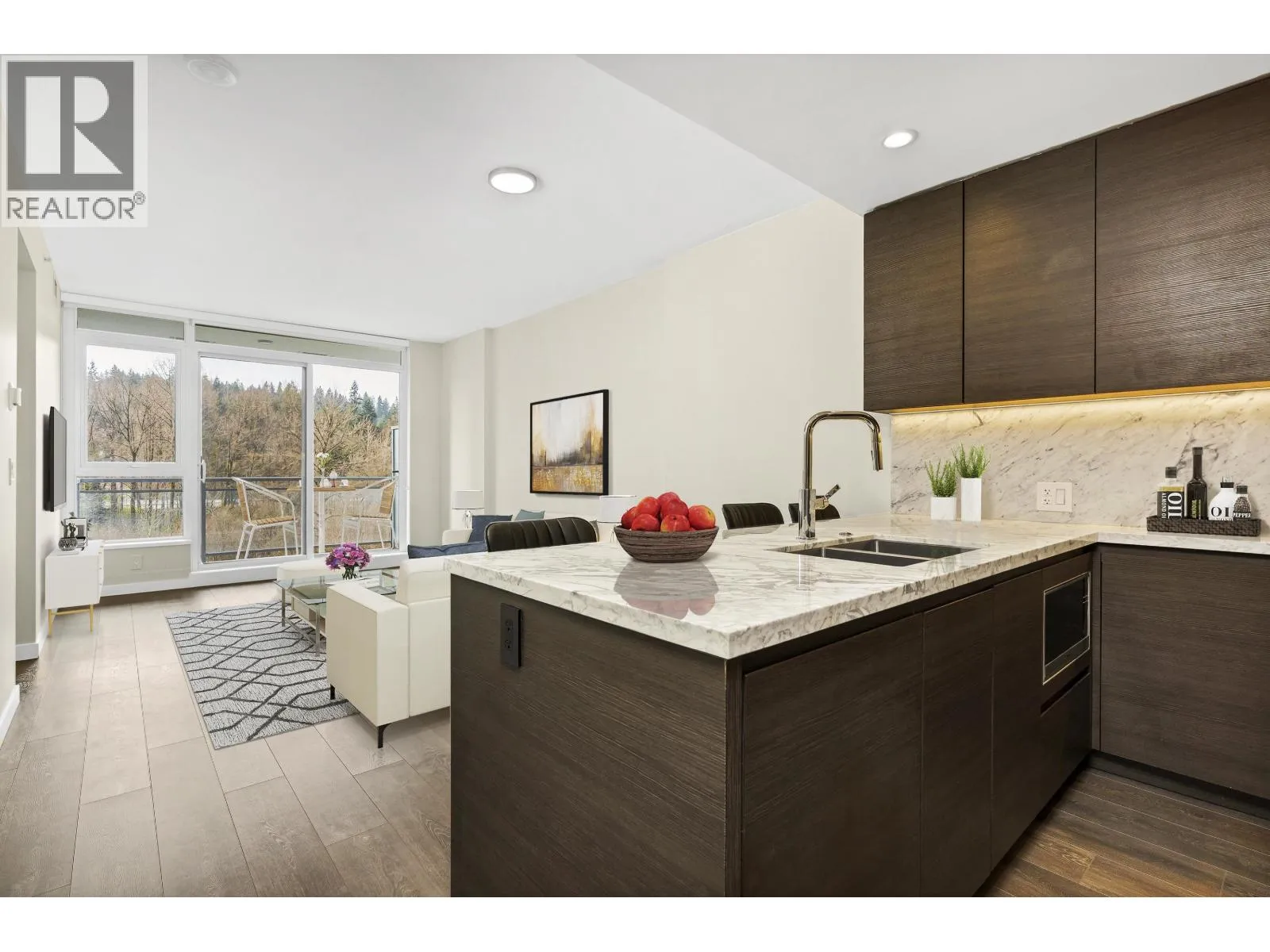 The Grande at Suter Brook Village, a sophisticated residence offering A/C, high ceiling & elegant stone counter tops. The gourmet Kitchen features premium appliances, gas range, large fridge with water dispenser and elegant cabinetry, Built-in organizers in closets and a spa-inspired bathroom with in-floor heating add everyday comfort. This immaculate, move-in ready suite boasts a bright, south-facing balcony with a peaceful, tree-lined outlook. Enjoy resort-style amenities including concierge, fitness centre, lounge, guest suites, golf simulator, outdoor pool, theatre, BBQ area, and children's play areas -all with a low strata fee. Steps to SkyTrain, shops, Thrifty Foods, and scenic trails. Includes 1 parking, 1 storage locker, and 1 bike locker. Open house 4/18(Sat) 2-4 & 4/19 (Sun) 10-12N (id:27476)