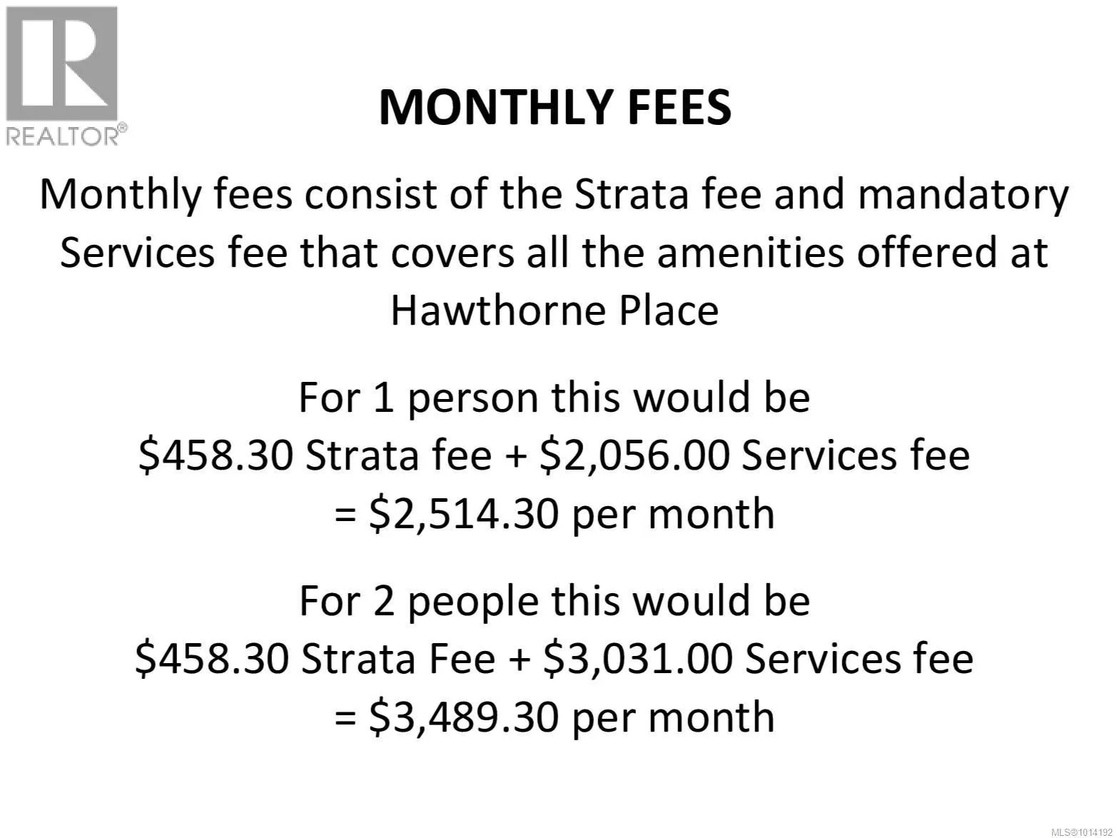 Walk to shops & amenities, Hawthorne Place Independent Senior Living in downtown Qualicum Beach offers a relaxed lifestyle & nurturing community. The suite is well located next to the elevator, laundry room, stairwell and recycling and has a tranquil garden outlook. One of the few suites with a patio it is perfect for those who like container gardening, have a little furry friend or just like to sit back and enjoy some fresh air. You can spend your time in the privacy of your 2 bedroom, 2 bath home with a bright open plan kitchen & living area or take advantage of the many activities offered or just come down and socialize with your neighbors in the comfortable common lounge area on the main floor of the building. It provides a worry-free lifestyle with the security of professional support, 24 hours emergency response, caring staff trained in CPR and First Aid, nutritious evening meals, weekly housekeeping and laundry service, good morning checks and organized social activities all covered by the Mandatory Service Fee. (id:27476)