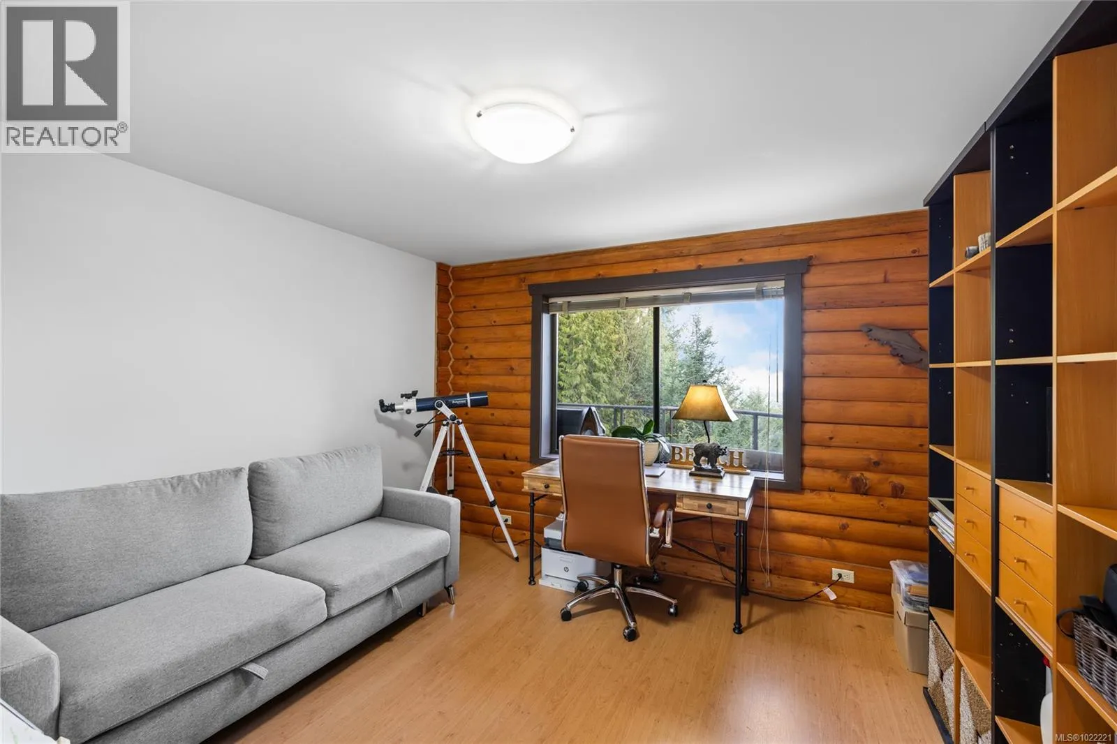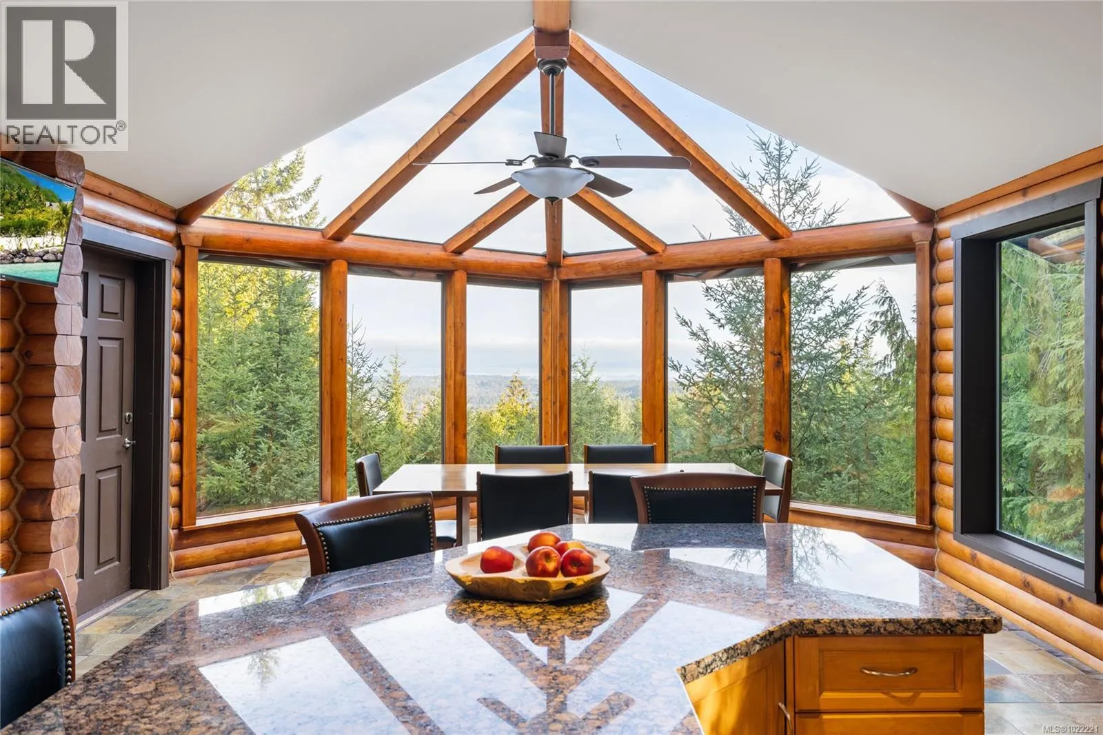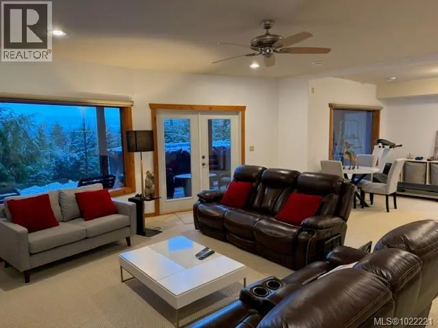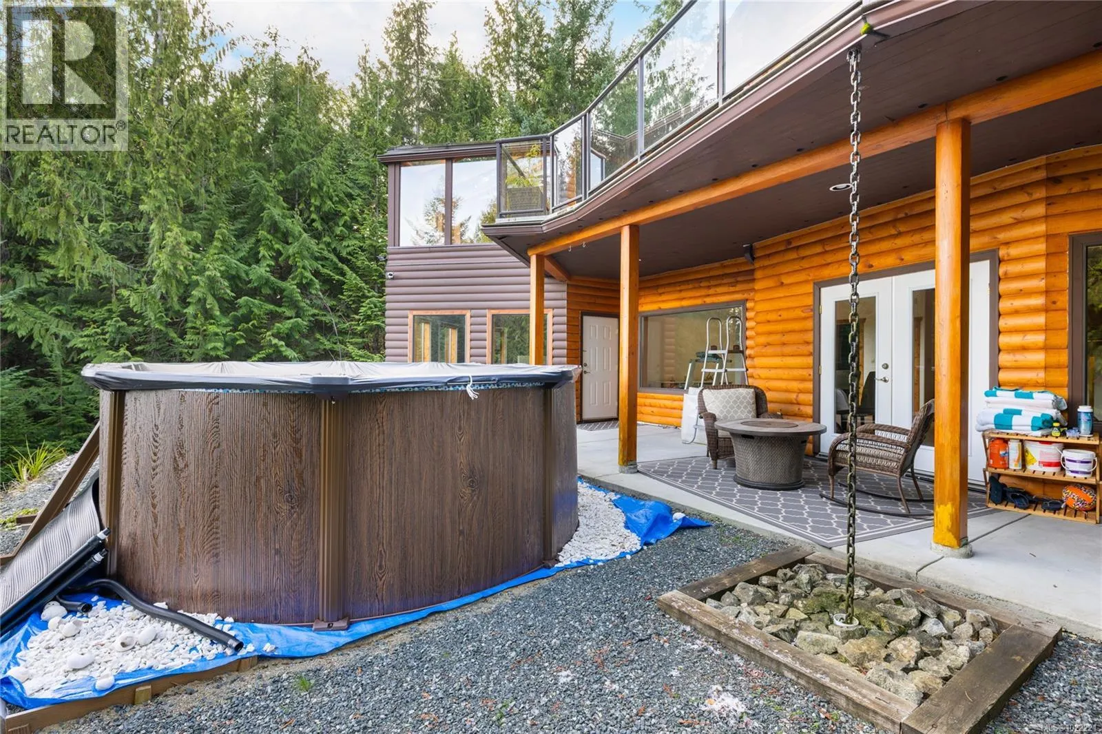 This ocean and mountain view log home in Little Qualicum River Village blends modern and rustic charm with machine-milled, kiln-dried log beams, custom stained glass, and large windows that capture stunning distant ocean views. The main level features a massive great room with a river rock wood-burning fireplace, a gourmet kitchen with granite counters and stainless steel appliances, a dining area, an office with a Murphy bed, and a laundry room. The spacious primary bedroom boasts a four-piece ensuite and a huge deck to enjoy the views and watch cruise ships sail by in summer. The walk-out lower level offers an oversized rec room perfect for a pool table, three bedrooms, a full bathroom, and ample storage. A newer hot tub and a new above-ground pool add to the outdoor fun. The home also includes two hot water tanks, slate tile floors, a newer heat pump, covered boat/RV storage, chicken coop with automatic doors and a fenced garden area. This all sits on a private 1.47-acre lot with fully paved driveway access and parking. Ideal for hosting guests or accommodating two generations under one roof, the interior paint has been extensively refreshed and features many recent updates throughout the home and property. (id:27476)