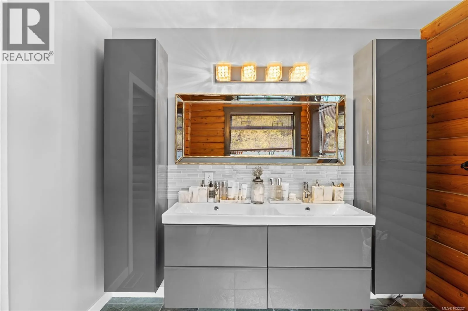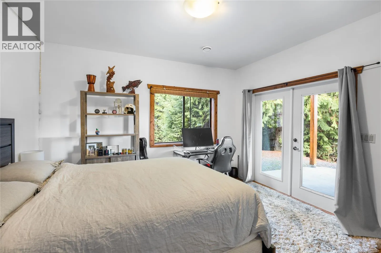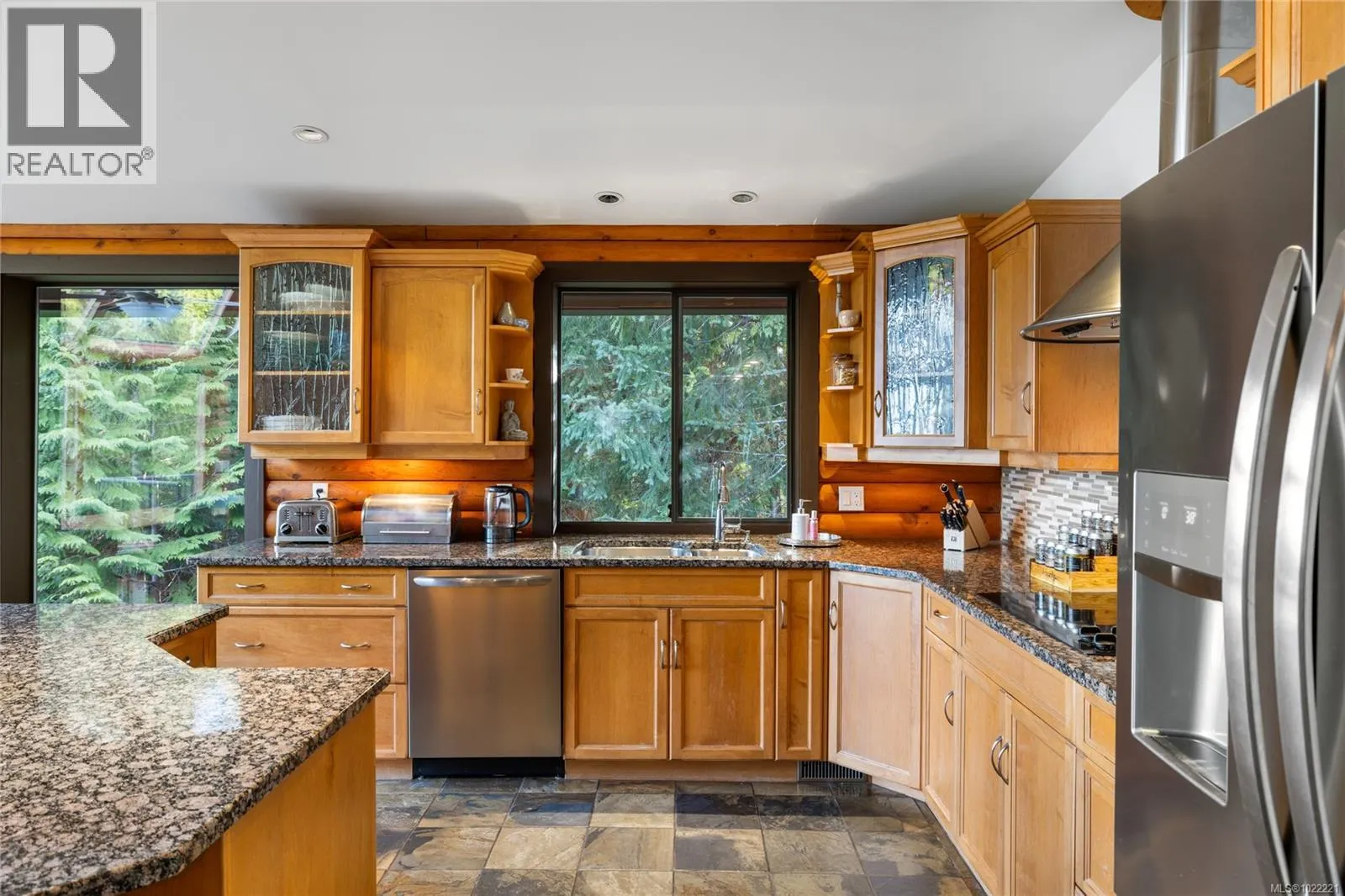 This ocean and mountain view log home in Little Qualicum River Village blends modern and rustic charm with machine-milled, kiln-dried log beams, custom stained glass, and large windows that capture stunning distant ocean views. The main level features a massive great room with a river rock wood-burning fireplace, a gourmet kitchen with granite counters and stainless steel appliances, a dining area, an office with a Murphy bed, and a laundry room. The spacious primary bedroom boasts a four-piece ensuite and a huge deck to enjoy the views and watch cruise ships sail by in summer. The walk-out lower level offers an oversized rec room perfect for a pool table, three bedrooms, a full bathroom, and ample storage. A newer hot tub and a new above-ground pool add to the outdoor fun. The home also includes two hot water tanks, slate tile floors, a newer heat pump, covered boat/RV storage, chicken coop with automatic doors and a fenced garden area. This all sits on a private 1.47-acre lot with fully paved driveway access and parking. Ideal for hosting guests or accommodating two generations under one roof, the interior paint has been extensively refreshed and features many recent updates throughout the home and property. (id:27476)