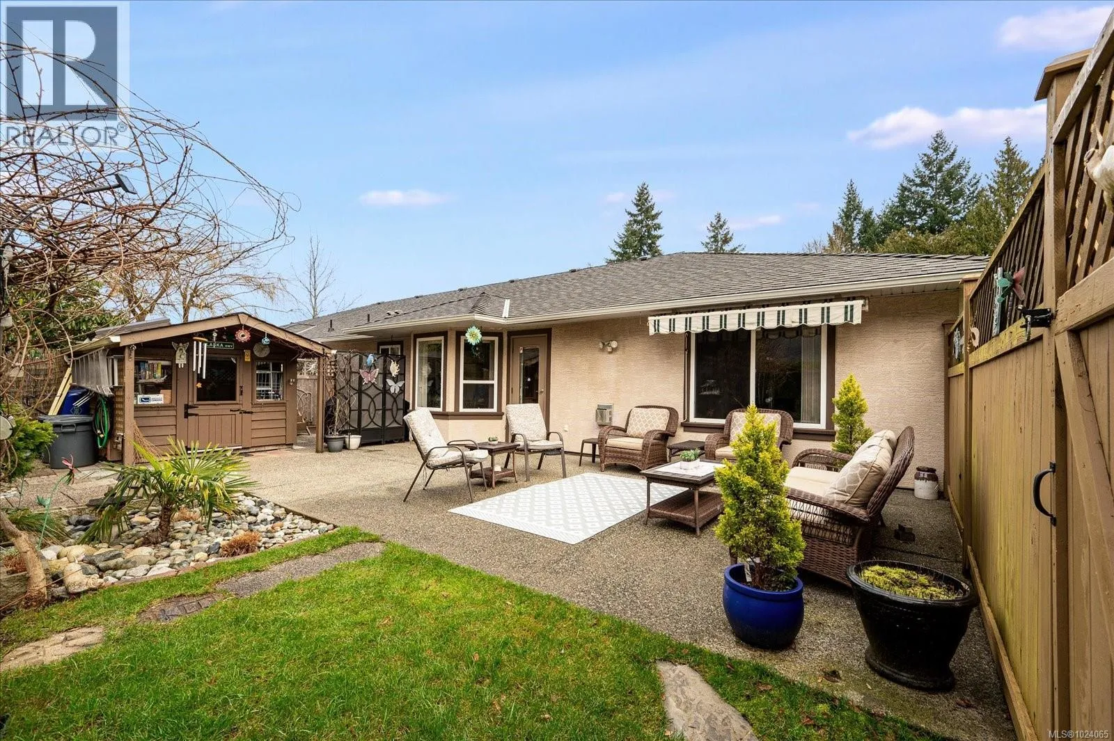 Beautifully updated 55+ patio home in a quiet, well-maintained 12-unit strata, offering the perfect balance of downsizing and comfortable living space. This thoughtfully cared-for home features 2 bedrooms and 2 bathrooms, along with a double car garage, with generous storage above, ideal for those who still want room for hobbies or seasonal items. Recent upgrades include a new roof, skylights, and gutters (2019), fresh interior paint, new bedroom carpeting, blackout blinds throughout, and a new fireplace in the den. The southwest-facing backyard is a true highlight and has been completely redone with irrigation, excellent privacy, a rear patio area, and a full-length awning extends all the way out to provide shade and comfort, perfect for relaxing or entertaining. The garage is exceptionally functional, featuring a workshop area, additional to the workshop/storage in the shed, rebuilt garage door mechanics with new springs, and upper storage with plywood flooring. A newer Murphy bed is included. Located close to walking trails and outdoor amenities, this well-run strata allows one pet with no size restriction, allows rentals, and maintains non-smoking common and limited common property areas, contributing to a peaceful, community-oriented setting. (id:27476)