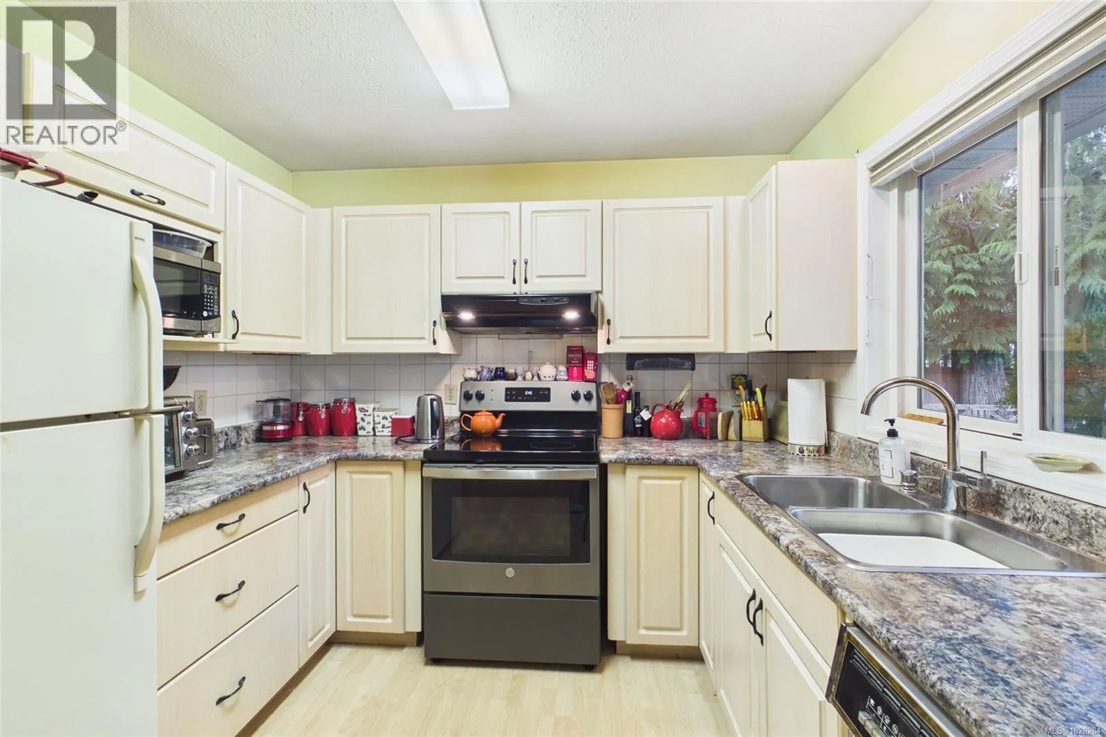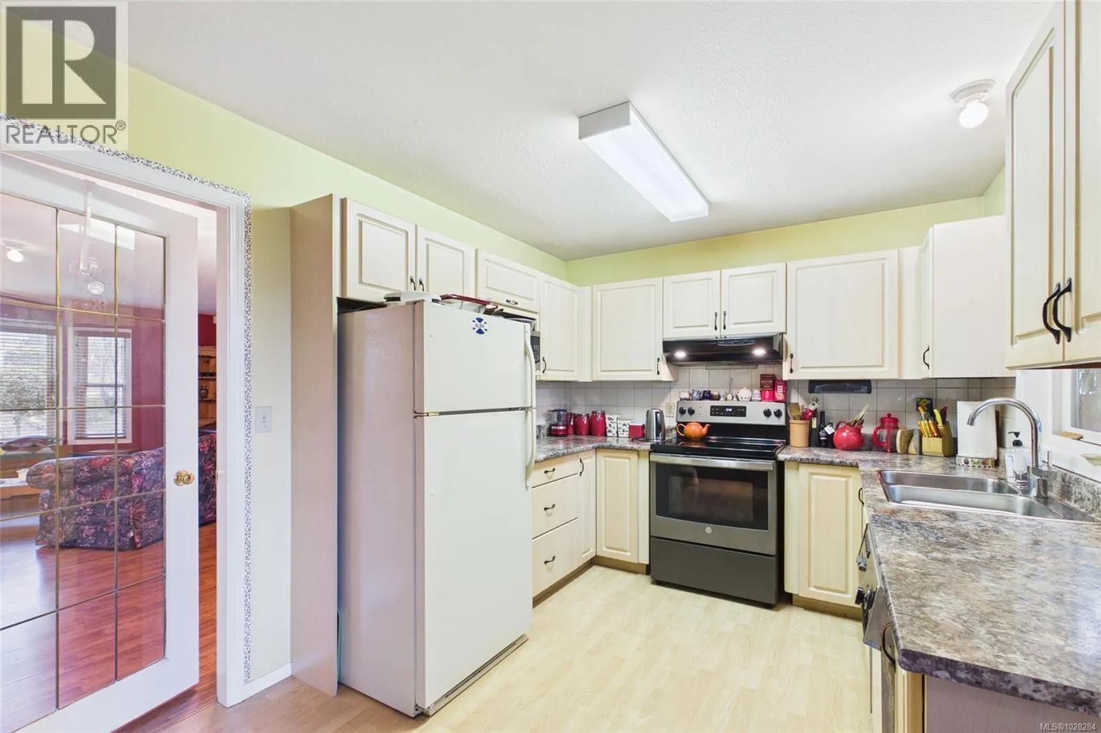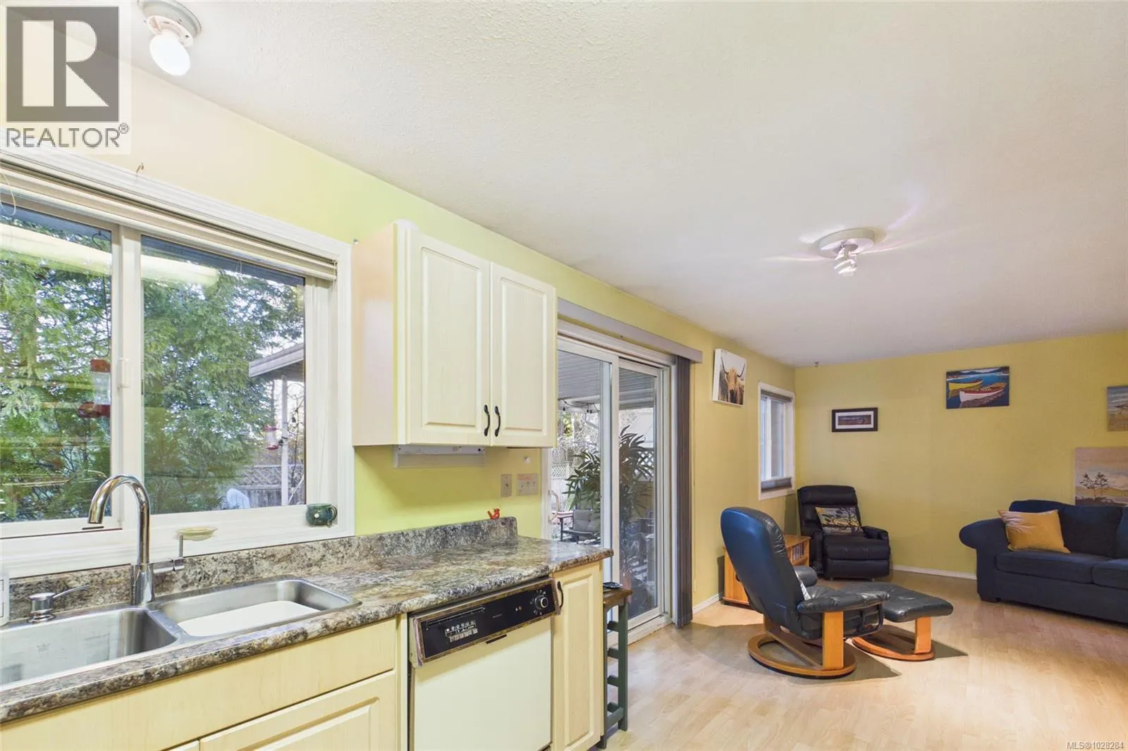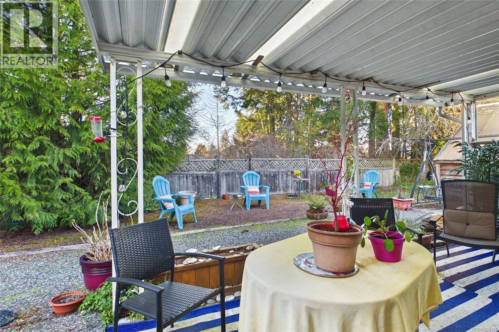 Located in the highly sought-after Hermitage Park neighborhood just minutes from the heart of Qualicum Beach, this charming 2-bedroom, 2-bathroom rancher offers comfortable one-level living in a peaceful, well-established community. Set on a desirable corner lot backing onto a small park, the home enjoys added privacy and a lovely green outlook. Inside, vinyl plank flooring runs through the main living areas, while the spacious living and dining room provides a welcoming space for everyday living or entertaining. The kitchen opens to a cozy den area, creating a functional open-concept layout perfect for relaxed Island living. Sliding doors lead to a covered patio where you can enjoy the outdoors year-round, along with a second covered side patio for additional outdoor space. The primary bedroom features a convenient 2-piece ensuite, while the main 3-piece bathroom includes a skylight that fills the space with natural light. Practical updates include a stove approximately three years old and a washer and dryer about six years old. The extra-wide single garage offers great storage and features a newer garage door. Outside, gardeners will appreciate the greenhouse and garden shed, along with plenty of space to personalize the yar. Hermitage Park is a favorite Qualicum Beach neighborhood known for its easy walkability to the Village center, local shops, restaurants, grocery stores, and community amenities including the nearby pool. This is a wonderful opportunity to enjoy easy-care living in one of Qualicum Beach's most desirable locations. (id:27476)