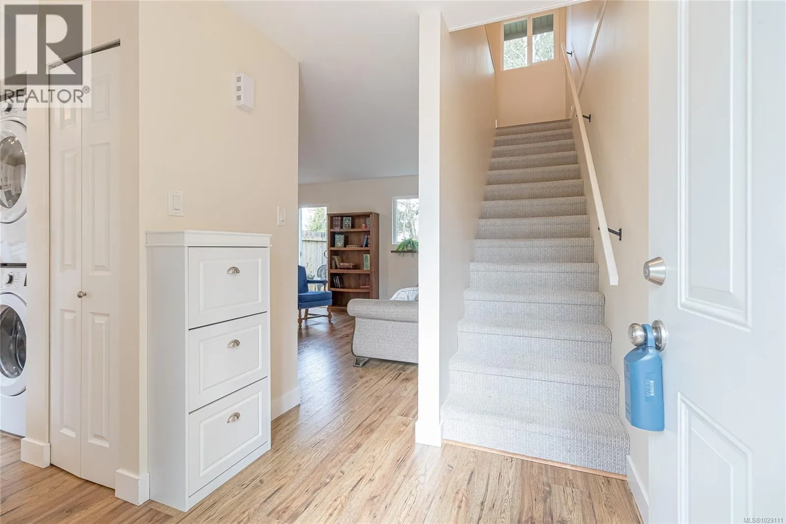 Charming 2-bedroom, 1.5-bathroom townhouse in sought after Qualicum Beach, ideal starter home or investment. This bright, two-level unit features updates done in the last few years, new laminate flooring, stair carpeting, renovated bathrooms, kitchen counter tops and newer appliances including washer and dryer. The main living room/dining room area opens to a fully fenced backyard with patio and raised garden beds perfect for summer planting and outdoor relaxing. Upstairs offers two generously sized bedrooms and the main bathroom. Walk to the beach, parks, trails, and the village centre; close to schools and downtown amenities. Comfortable, low maintenance living in a prime location. (id:27476)