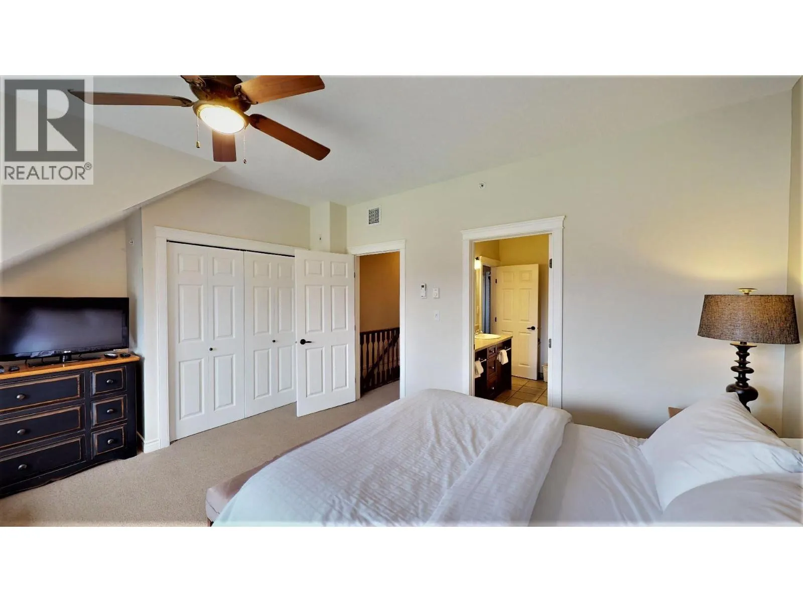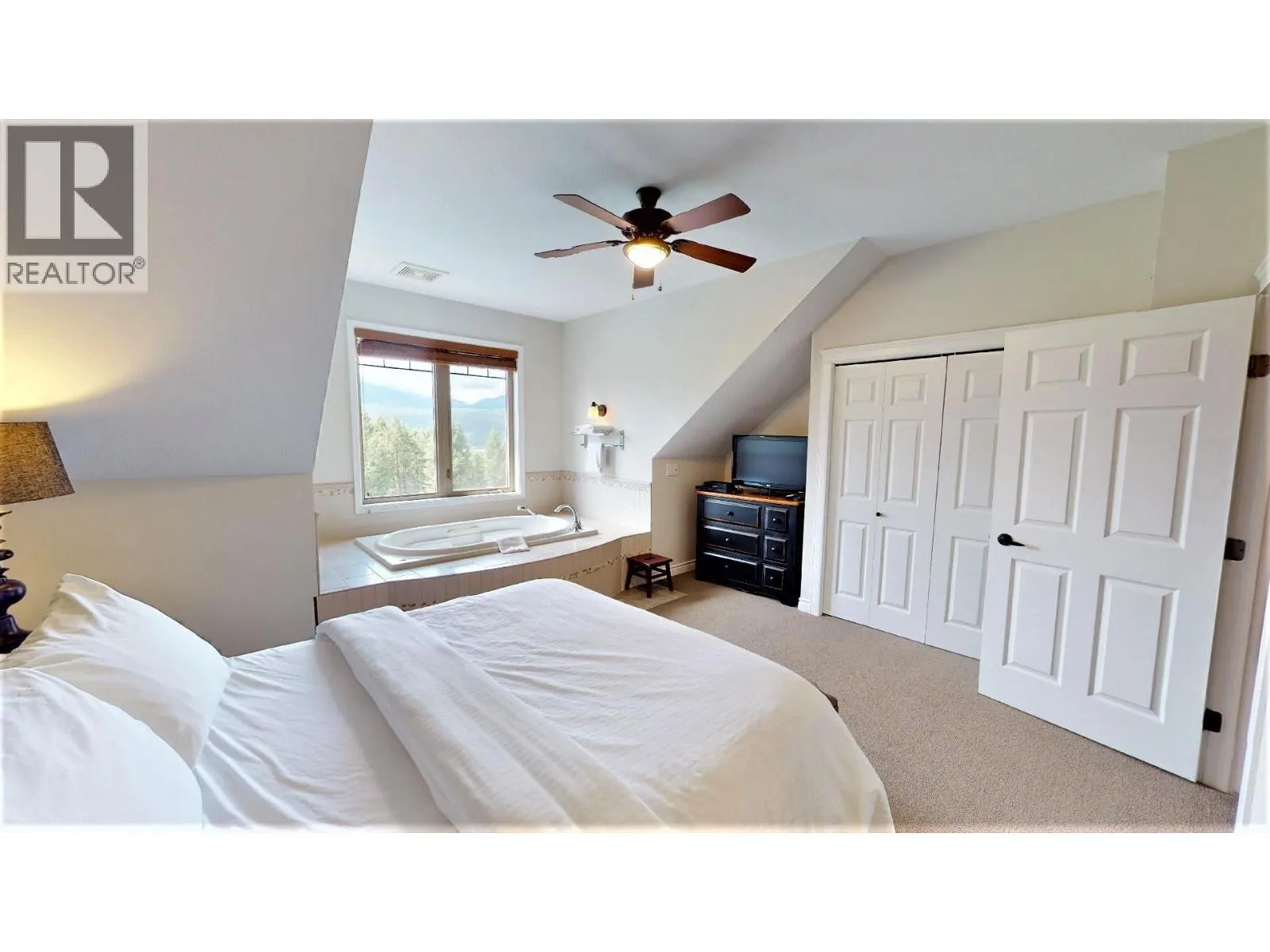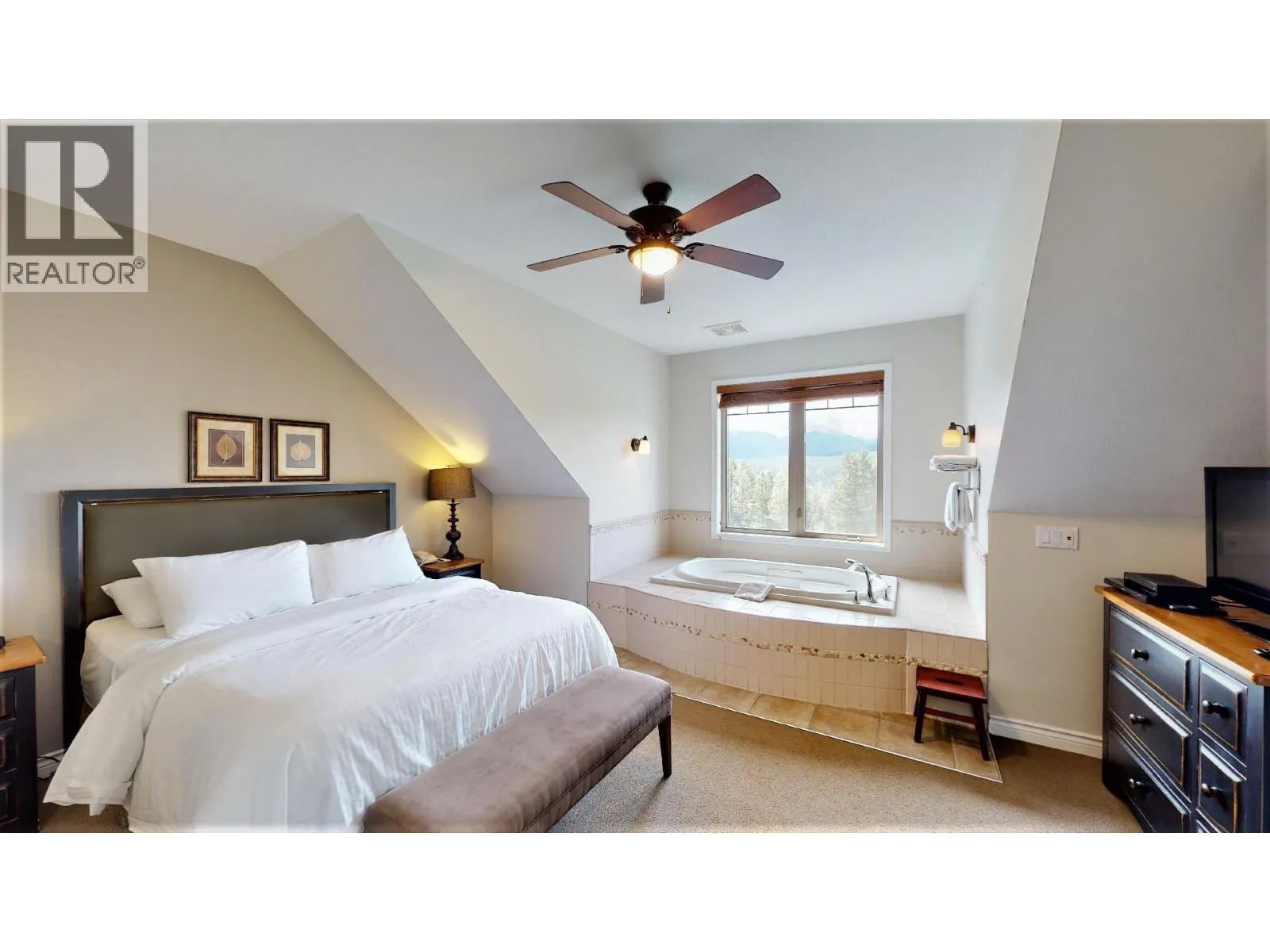Enjoy 12â13 weeks of hassle-free vacation living every year with a fully titled 1/4 ownership (Rotation B) of this top-floor, two-storey, 2 bed, 1.5 bath condo at Bighorn Meadows Resort in the heart of Radium Hot Springs, BC. Overlooking the lake on the 9th hole of the renowned Springs Golf Course, this fully furnished, turn-key unit offers luxury, comfort and unbeatable views with sunsets over the Purcell Mountains and sunrises above the Rockies. Stylishly appointed with granite countertops, tile floors, high-end furnishings and designer fixtures, this spacious retreat also features two private balconies, in-suite laundry, electric fireplace, BBQ and patio furniture. Owners enjoy access to a wide range of on-site amenities on the beautifully landscaped 9-acre property, including: Heated outdoor pool & two hot tubs, gym, change rooms and showers, ownerâs lounge & childrenâs playground. Beyond the resort, you're in the heart of the Columbia Valley and minutes from hiking, biking, golfing, skiing, fishing, watersports and soaking in the world-famous Radium Hot Springs. Monthly fees cover all typical expenses including strata fees, property taxes, utilities, cable, internet & phone. Can't always use your condo? No problem. The on-site professional management team can handle rentals for you. You can also trade your time through Interval International and enjoy other premium resorts worldwide. Click the Play/3D Showcase Icon for a 3D tour & More Photos Icon for the Amenity Centre. (id:27476)