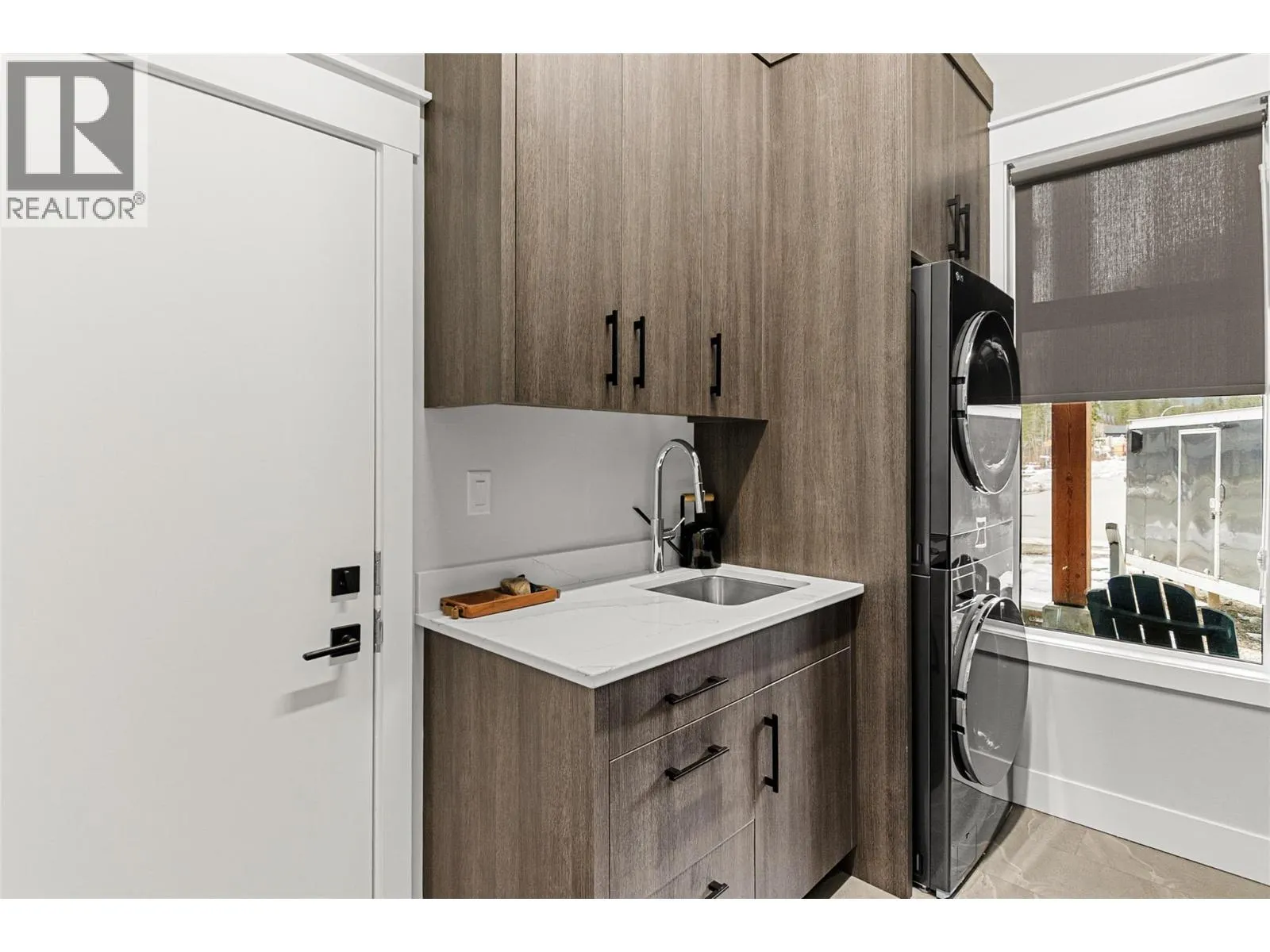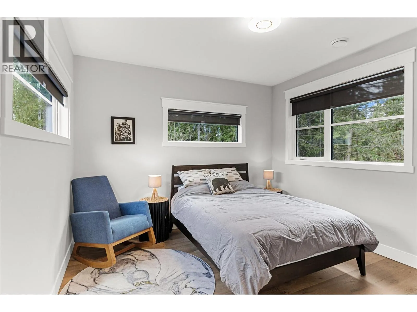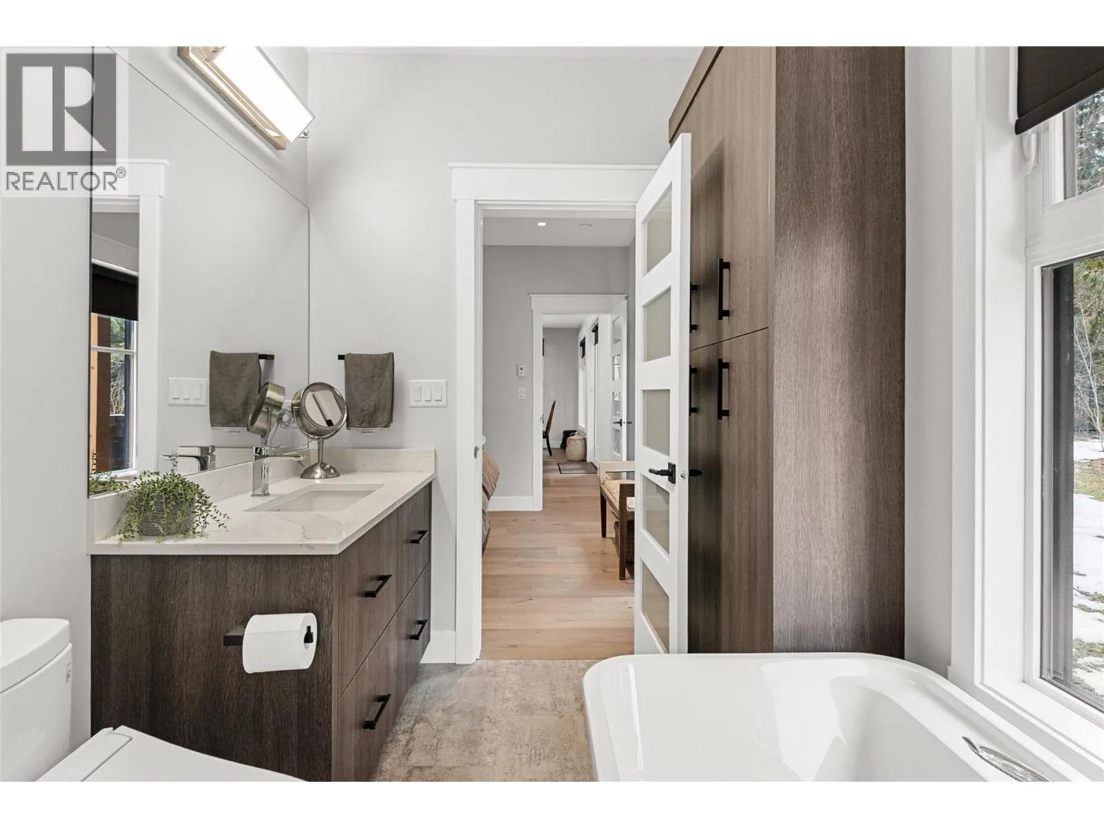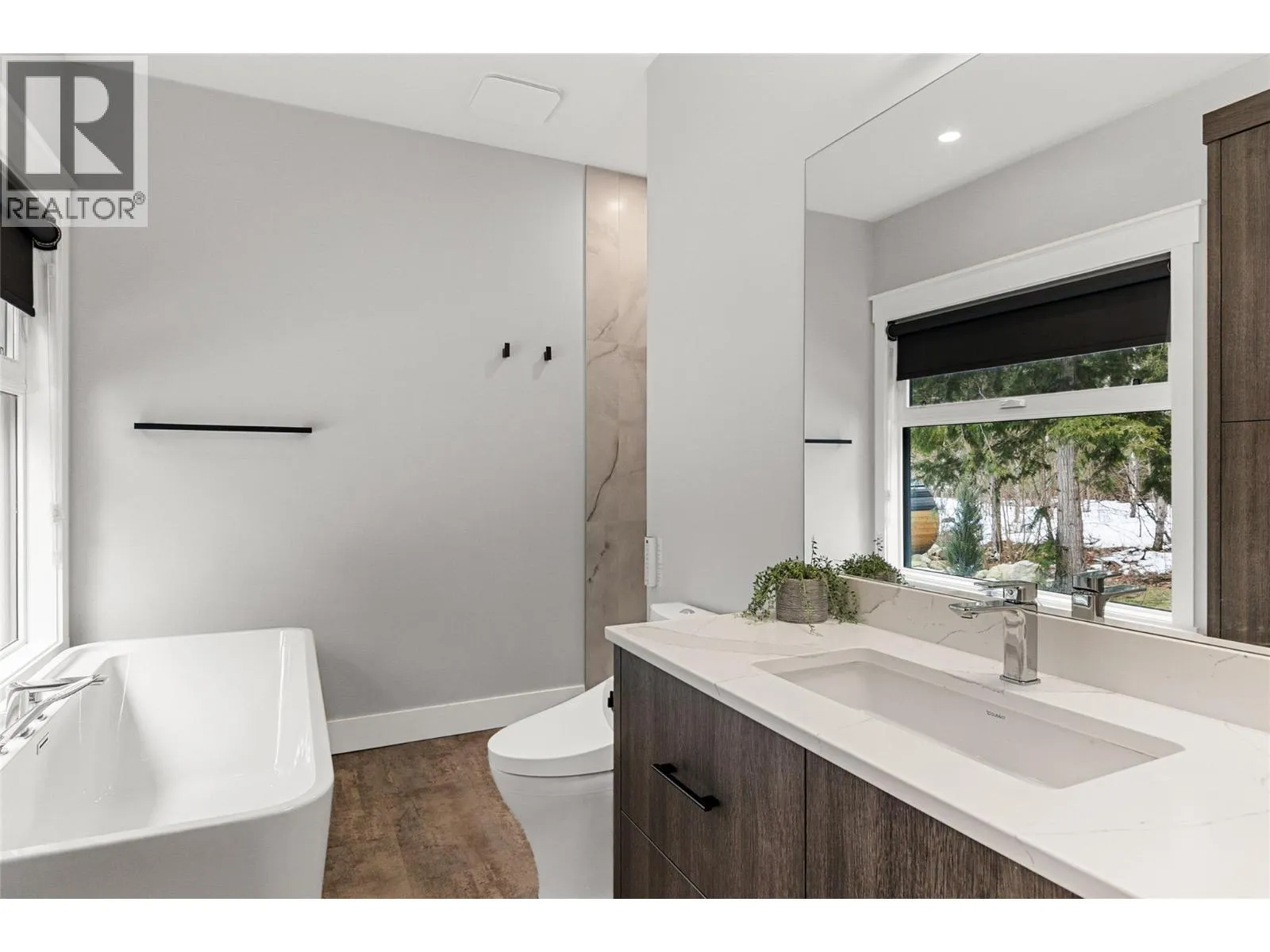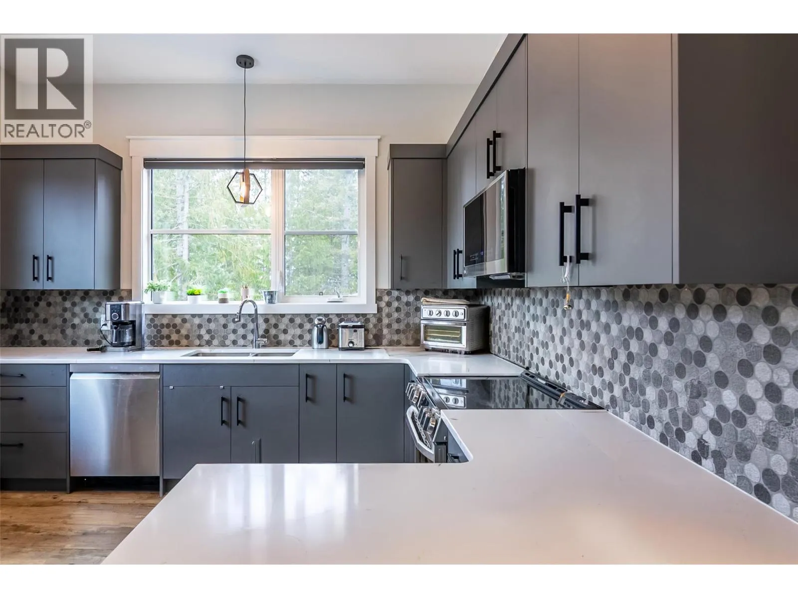 High-end custom 4 bedroom / 4 bathroom Arrow Heights home with a legal 2 bedroom suite now available. Completed in 2024 in Revelstoke's coveted Cashato Bench area, this spectacular modern property is surrounded by new builds and backs onto a forested parkland providing an upscale yet natural feel. The open concept main living area is perfect for entertaining where high ceilings and expansive windows welcome natural light. The main living area spills onto a large covered back patio complete with its own hot tub in a tranquil forest setting. The adjacent primary bedroom is a showstopper with a large walk-in closet and a modern ensuite complete with a gorgeous soaker tub with forest views. Upstairs you'll find 2 more bedrooms, a full bathroom and a bonus reading room with views of the forest. Downstairs you'll find a 4th bedroom, a full bath and one of the coolest rec rooms around - the ideal spot for the family or guests to spread out. The 2 bedroom suite offers many of the quality finishes found in the main home and also boasts vaulted ceilings and 2 large decks (1 with its own hot tub). Special features of this home are too many to list, but include abundant exterior timber framing, high-end millwork, in-floor heating, high efficiency heat pumps, engineered hard wood flooring and an underground irrigation system. And don't forget the epic 836 sq ft garage with in-floor heat - the perfect home for all your Revelstoke toys. Your dream mountain home awaits. Call for info today! (id:27476)