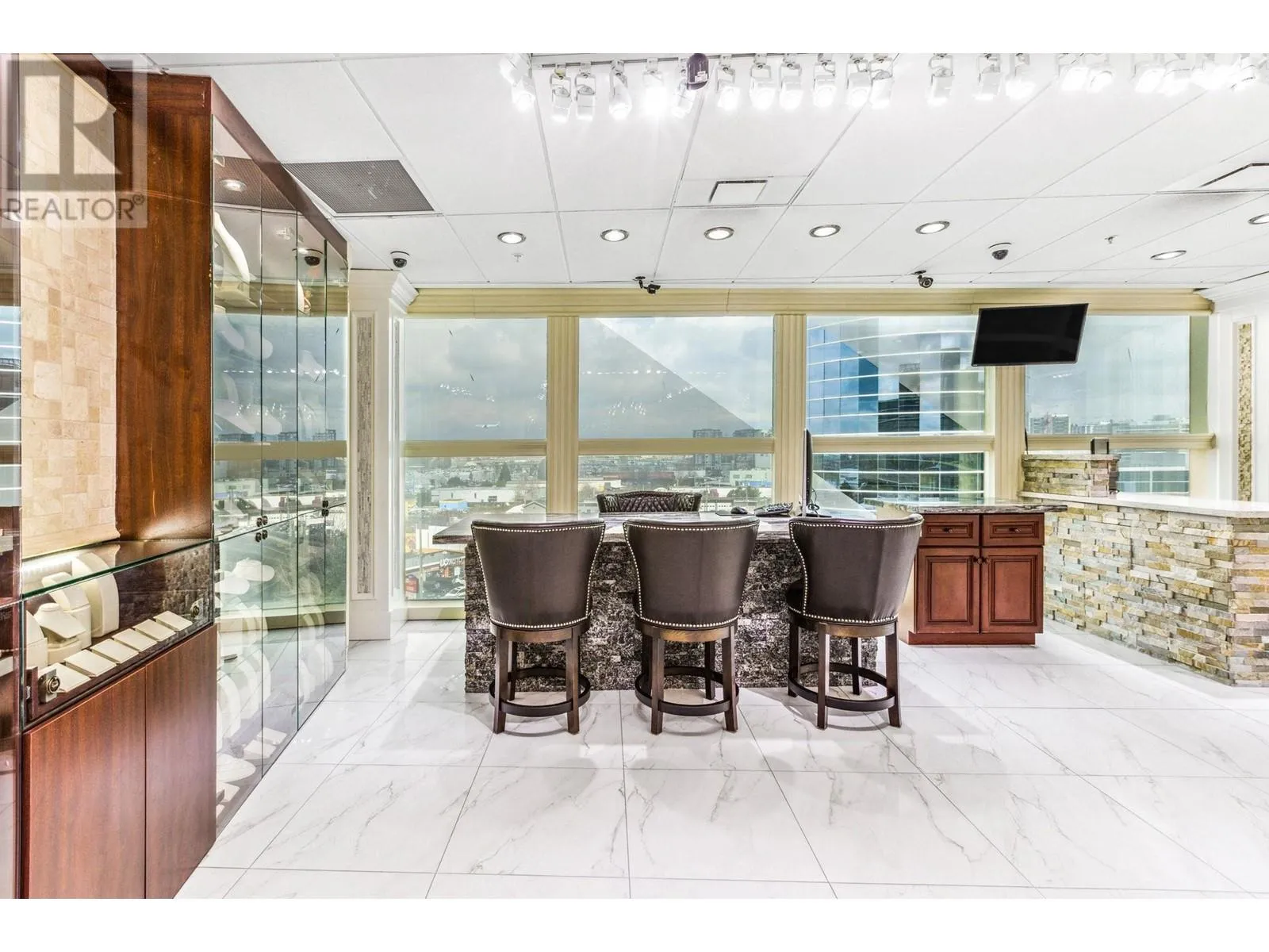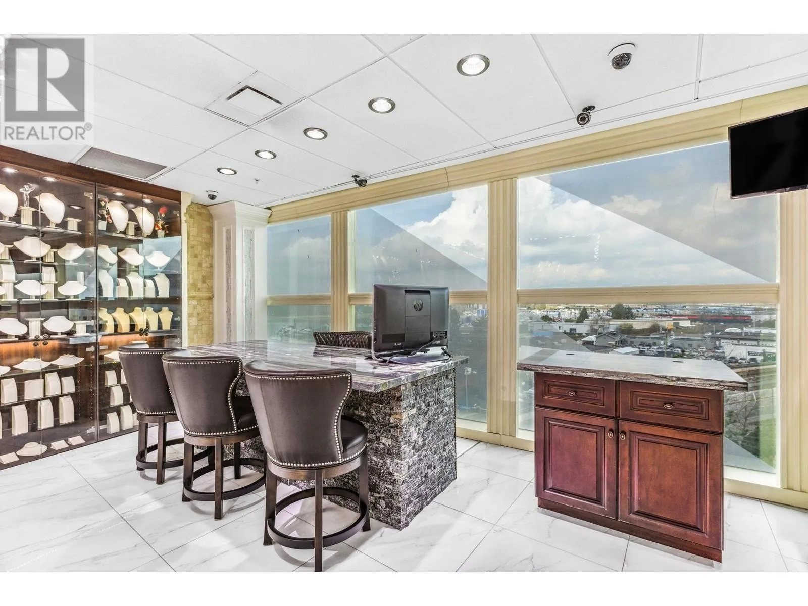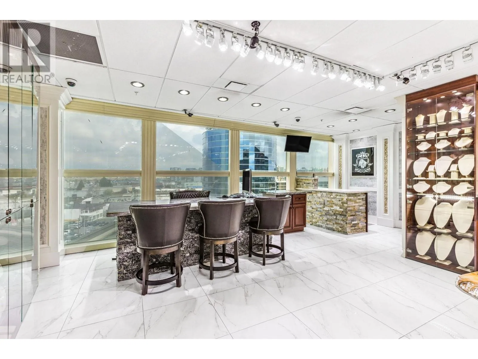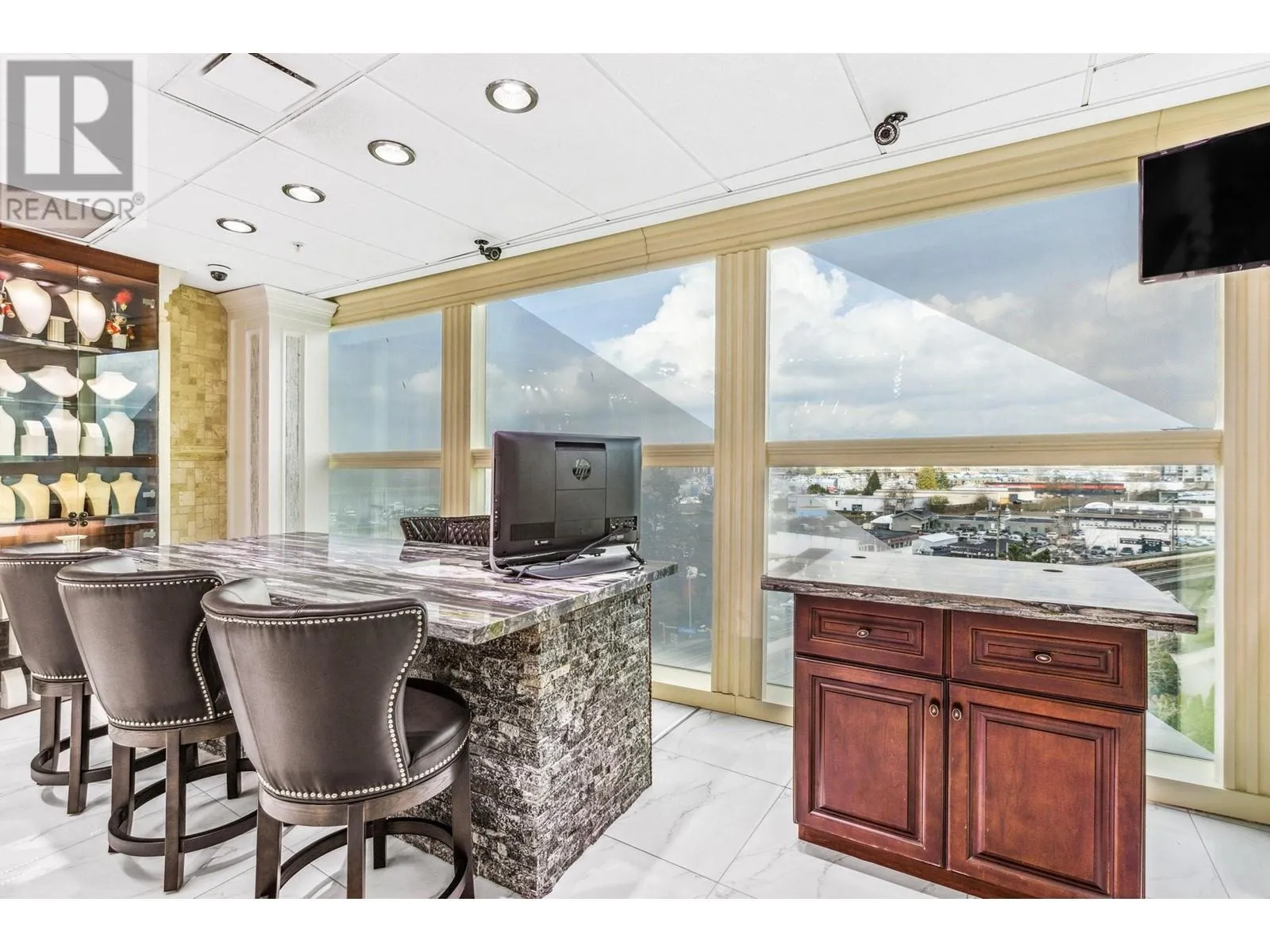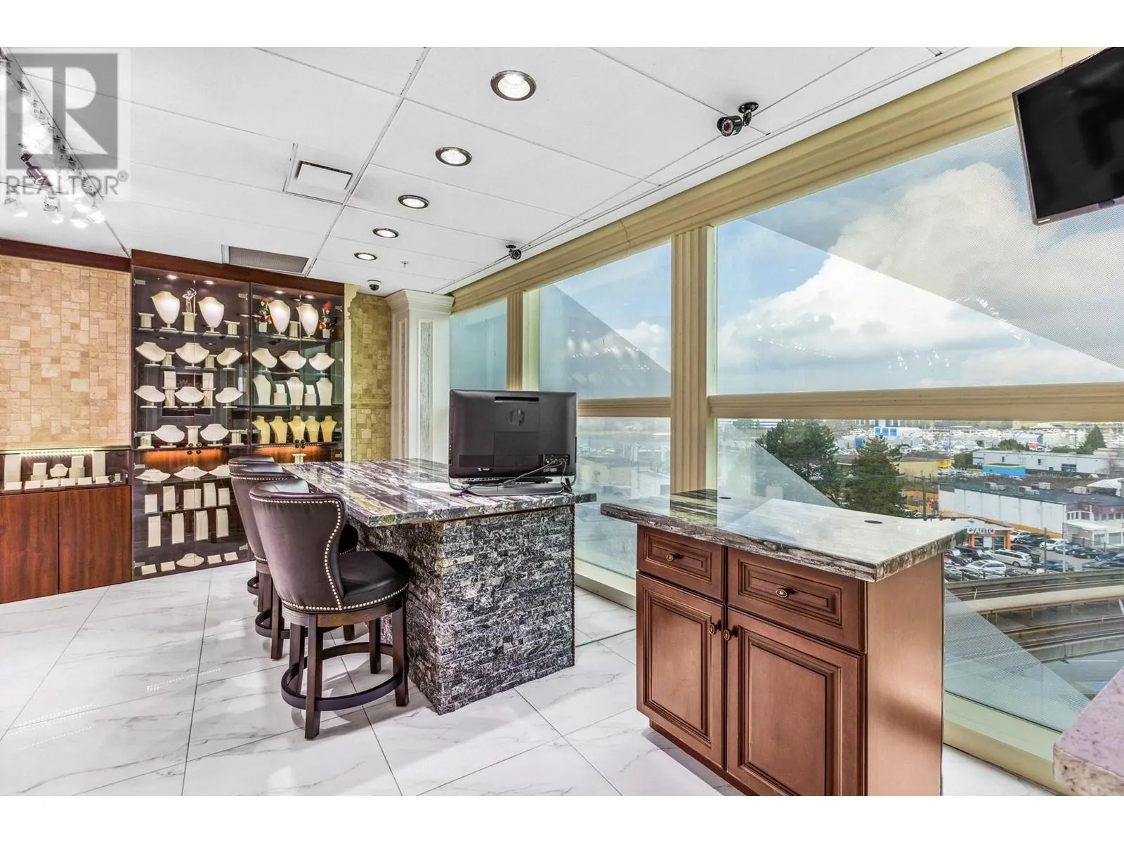 Best and most luxury office/retail space at Aberdeen Square! This exceptional unit offers unblocked panoramic views of the North Shore mountains, cityscape, and water. Meticulously renovated and decorated, it previously served as a customized jewelry showroom. For those seeking more space, an adjacent unit is also available, providing a total floor area of 1479 sq ft. Each unit includes a parking stall pass and enjoys 24-hour security and access to the on-site food court. Connected to Aberdeen SkyTrain station and the Aberdeen Shopping Center, only 2 units in the building has this exceptional view. Call for private viewing. (id:27476)
