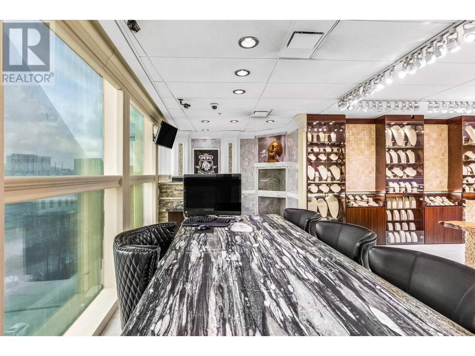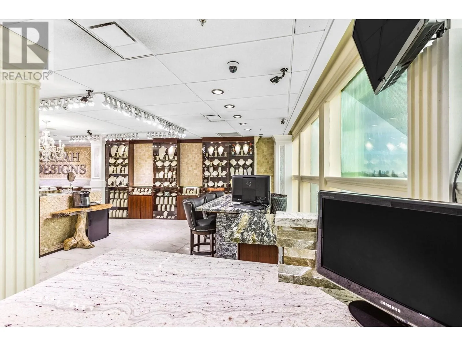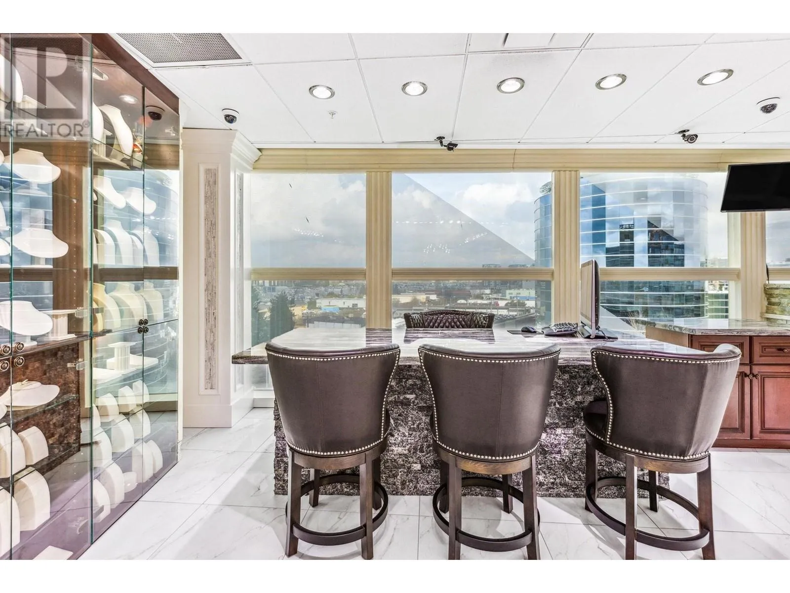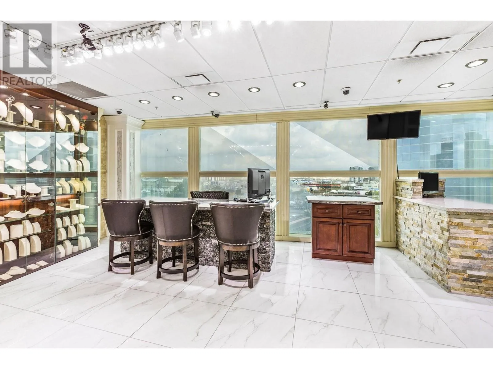 Best and most luxury office/retail space at Aberdeen Square! This exceptional unit offers unblocked panoramic views of the North Shore mountains, cityscape, and water. Meticulously renovated and decorated, it previously served as a customized jewelry showroom. For those seeking more space, an adjacent unit is also available, providing a total floor area of 1479 sq ft. Each unit includes a parking stall pass and enjoys 24-hour security and access to the on-site food court. Connected to Aberdeen SkyTrain station and the Aberdeen Shopping Center, only 2 units in the building has this exceptional view. Call for private viewing. (id:27476)
