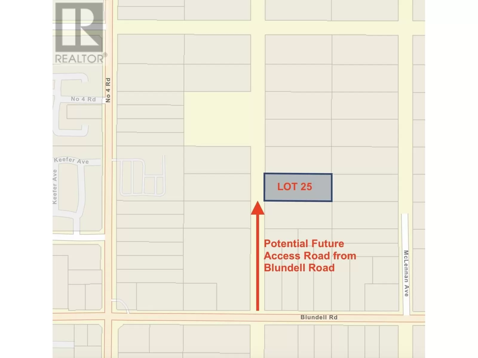 Excellent Holding Property with long term potential in McLennan area of Richmond! 0.886 acres AG1 zoned in Central Richmond. This lot is located very closed to main road (No.4 Rd and Blundell Rd). It will be great potential for future development ! Currently you can use as farm/agricultural purposes. Building/structure is not permitted at this moment. Currently there is already an existing service road to the south west corner of the lot. The service road is able to be extended if needed. ** There is not possible to have tour for LOT 25 because it is covered/view blocked by the trees, bushes and possibly wild blueberries. ** (id:27476)