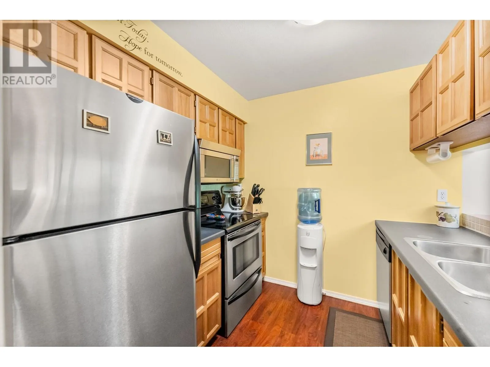 Rarely available hidden top-floor gem at Daniels Manor! Perfect for First Time Home Buyers or Downsizers. This spacious top floor unit offers ample space, with a homey house feel. Fully rain screened with Brick and metal exterior cladding, along with new windows, sliding doors, and heavy-duty blinds. Located in an incredibly quiet and convenient location, near Costco, Parks, Elementary Schools, and IKEA. Step into your spacious East facing living room dining area which has vaulted ceilings, wide skylight, bar top counter seating, large pantry, closets to the ceiling, central office nook, all kept in immaculate condition. The bedroom, large enough for a king-size bed, has a walk-in closet escape entrance to a beautiful pristine 3-piece bathroom. This well-maintained building, recently updated the Elevators and Boilers, also boasts oversized parking spaces with plenty of visitor and street parking (id:27476)