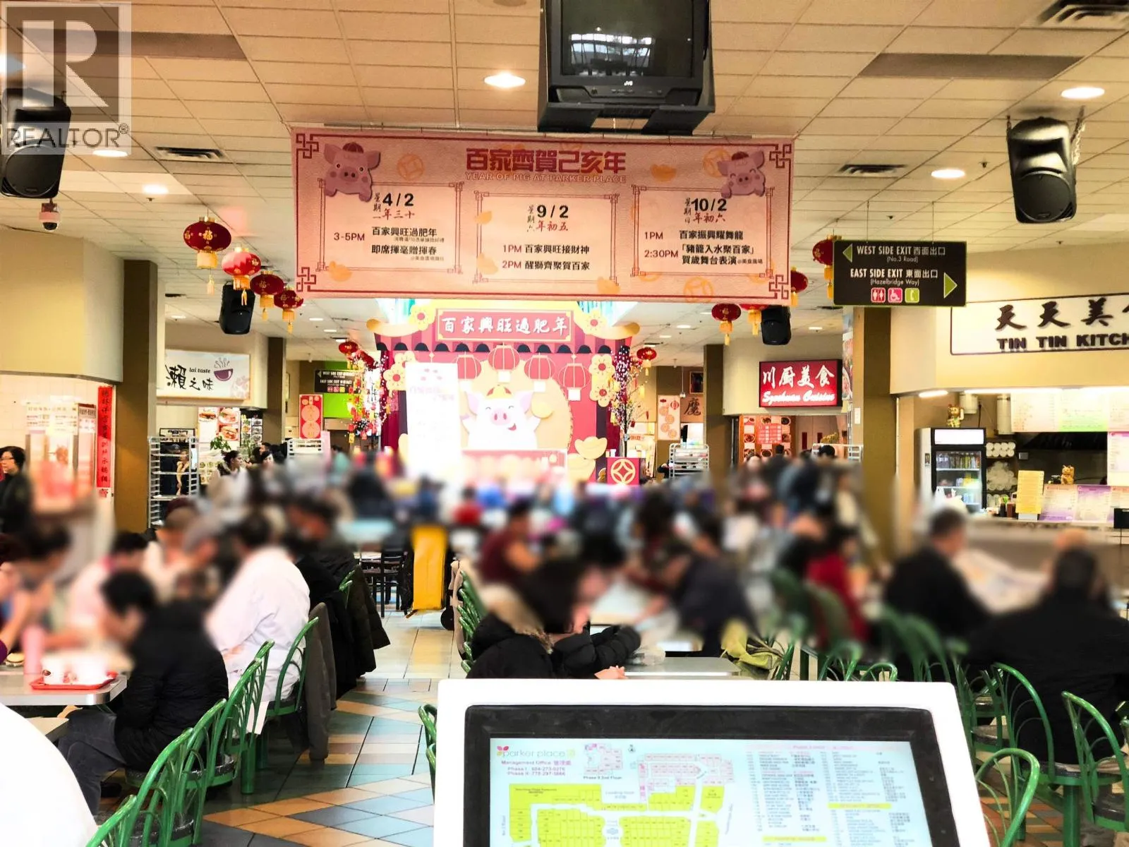*Showing by appointment only, do not disturb staff. * Richmond Food Court Unit for Sale! Located in Parker Place, one of Richmond's busiest shopping centers! High-exposure unit with excellent foot traffic, located near the SkyTrain and surrounded by popular retail stores. The unit is designated for "Light-Food Business Usage" and comes with a well-equipped setup. Plenty of parking is available for customers, ensuring a steady flow of visitors. Currently leased, offering stable rental income from day one. Please contact the listing agent for more information today! (id:27476)