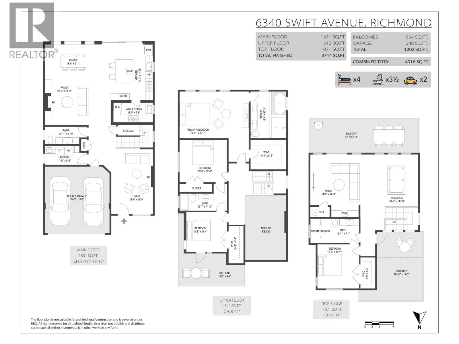 Welcome to this one of a kind three-story detached house in Richmond. Living room with 20ft ceiling height impresses from the start, with a south-facing backyard that connects the family room, dining room, and kitchen, offering all-day sunlight. This house comes with 4 bedrooms and 3.5 bathrooms, with a large media room and versatile flex space on the third floor. Other features include radiant in floor heating, central AC, and a smart home system connecting to lighting, temperature, audio, and security. Spacious outdoor area is designed on each floor, making this home a perfect blend of comfort and modern living. School catchment: McKinney Elementary & Steveston-London Secondary. Virtual tour: https://youtu.be/M9axNDoxcrM. Private showing only. (id:27476)