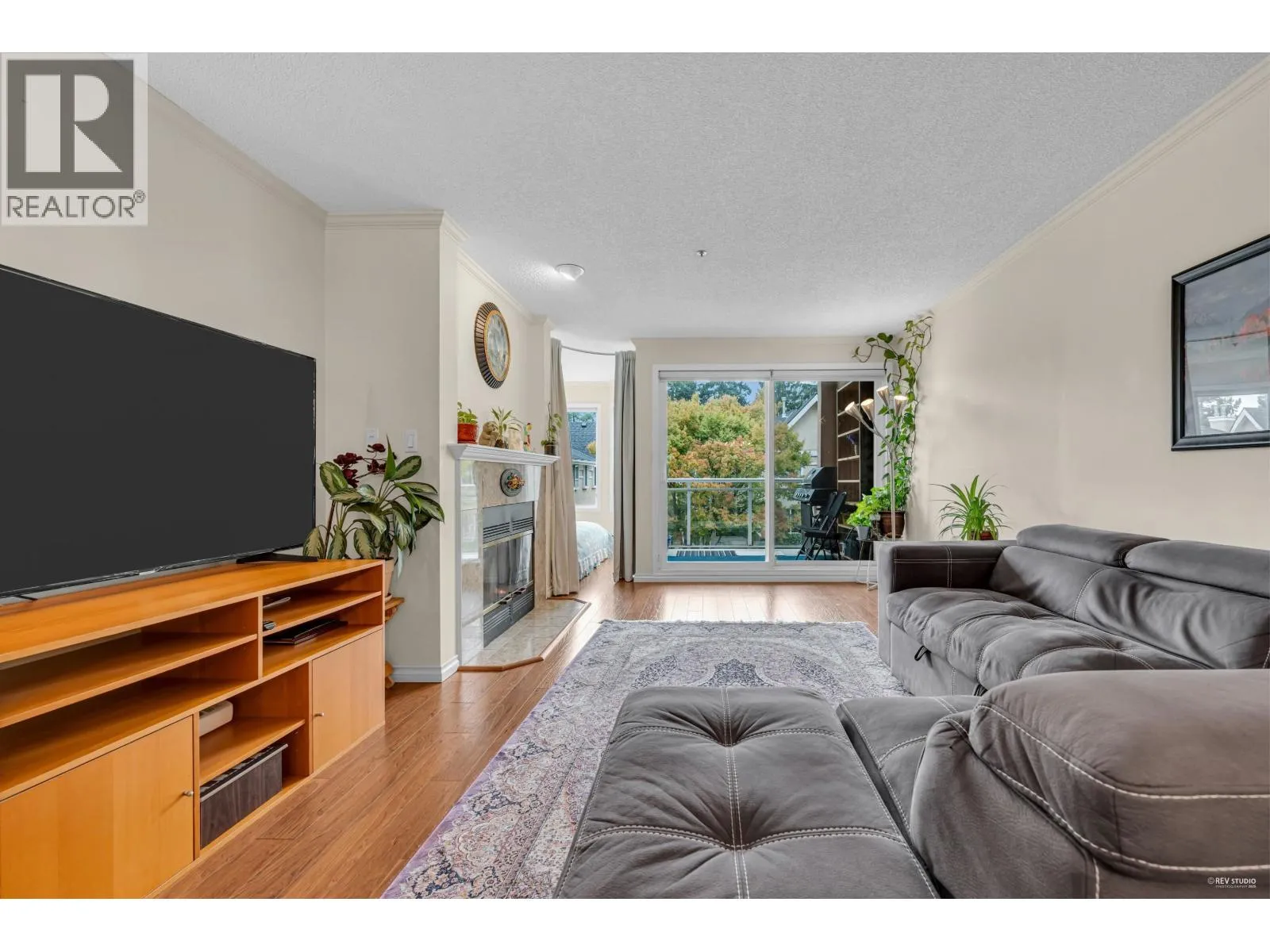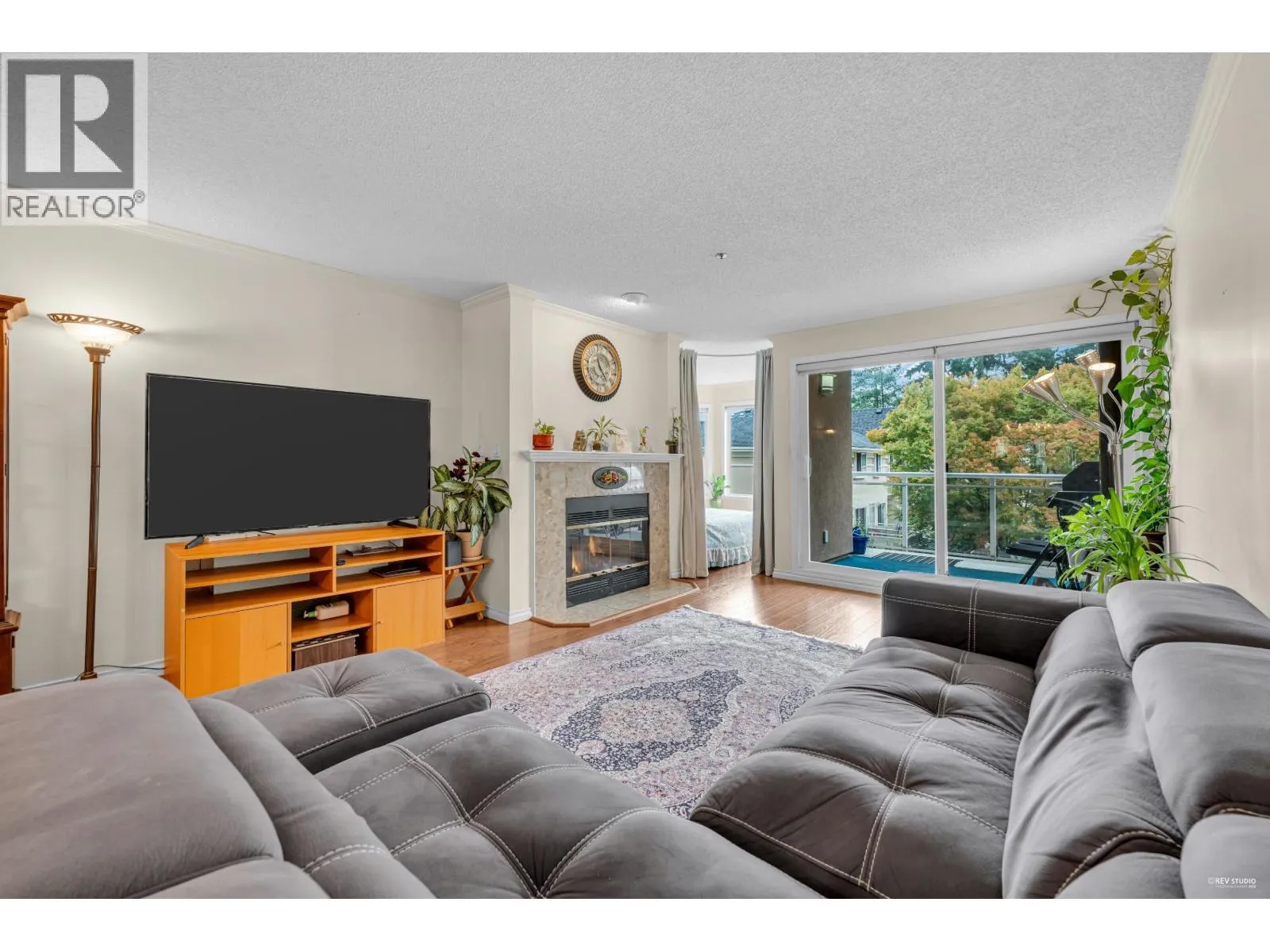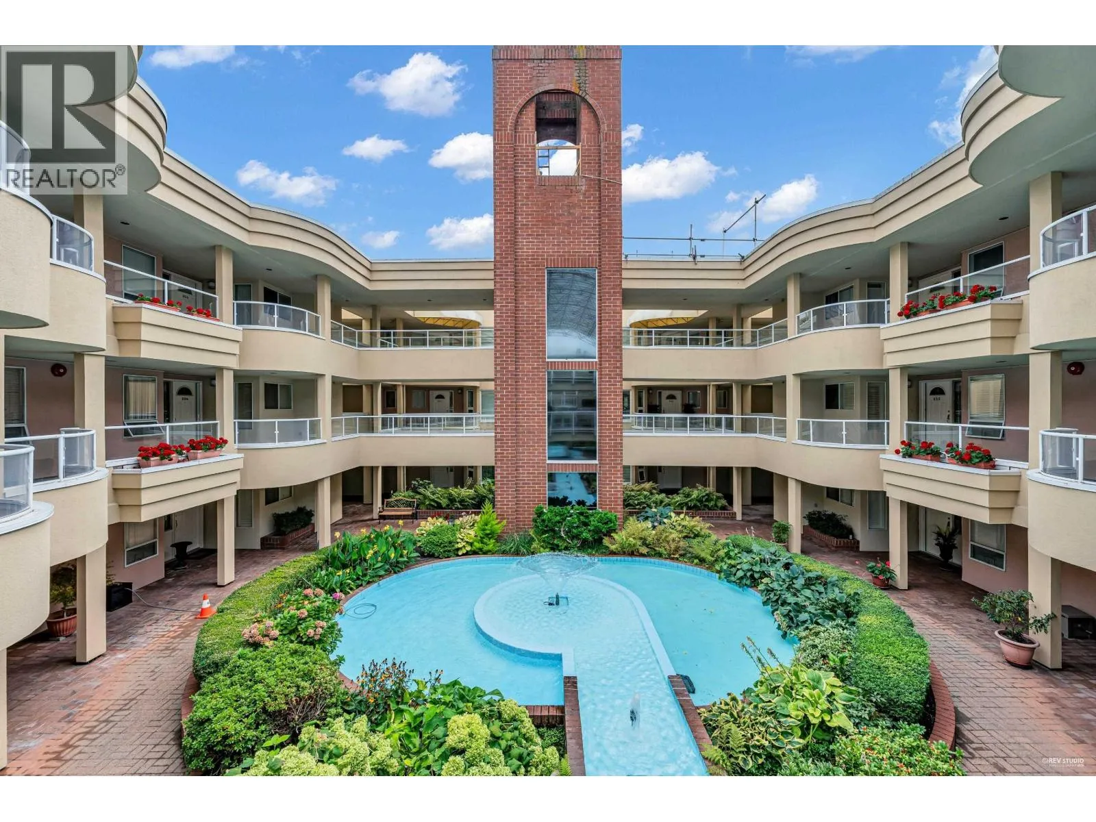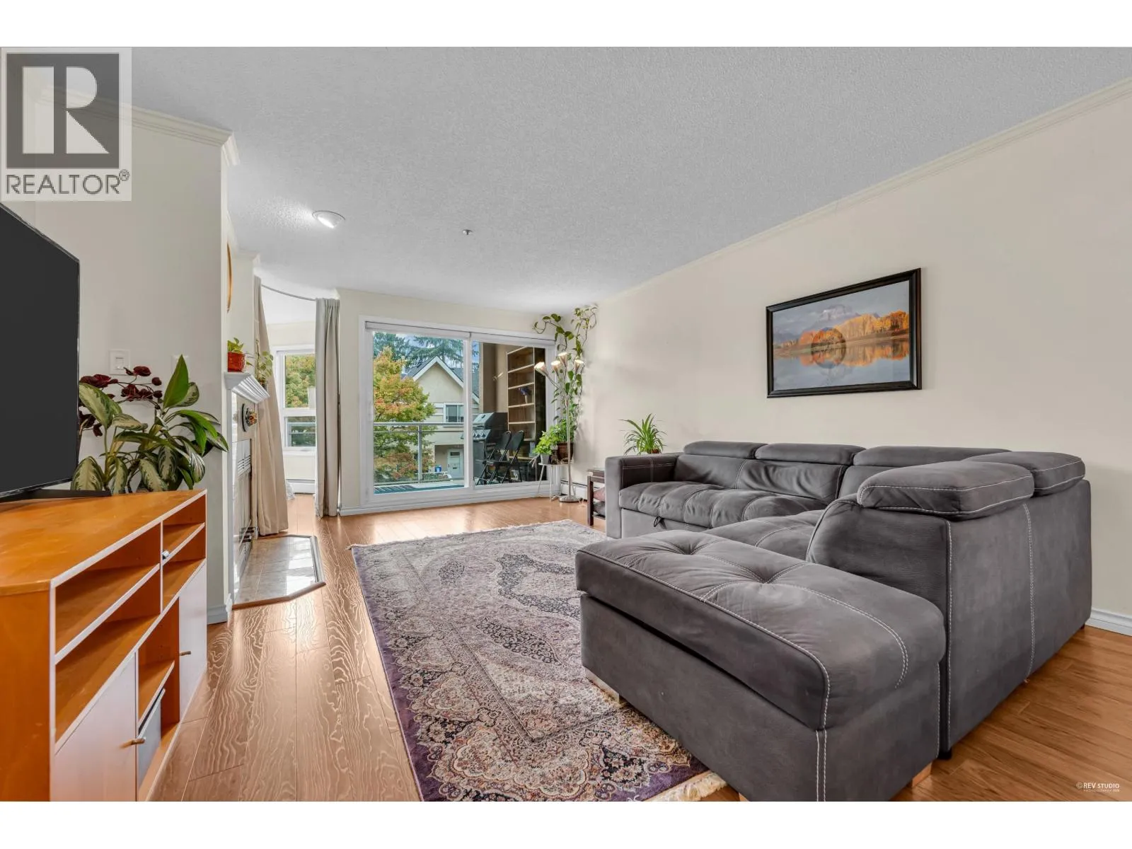 Prestigious "Renaissance" in the heart of Richmond, next to Richmond High (has IB program). Walk to Minoru Park & Pool, Richmond Centre Mall, City´s Centre for Active Living, Library, Senior Centre, Canada Line, etc. Quiet inside south facing 2-bdrm + den 1,285 sf spacious & bright unit. 80sf covered balcony looking onto greenbelt. Den is big enough to be the 3rd bedroom. Kitchen has eating area, entertainment sized living & dining area. Gas F/P. Wood flooring except tiled kitchen & bath. Efficient hot water heating. Unit has been lovingly cared for & shows very well. Complex has beautiful water fountain feature, exercise pool/hot tub, sauna & party/meeting room. One secured parking. In-suite laundry & storage. (id:27476)