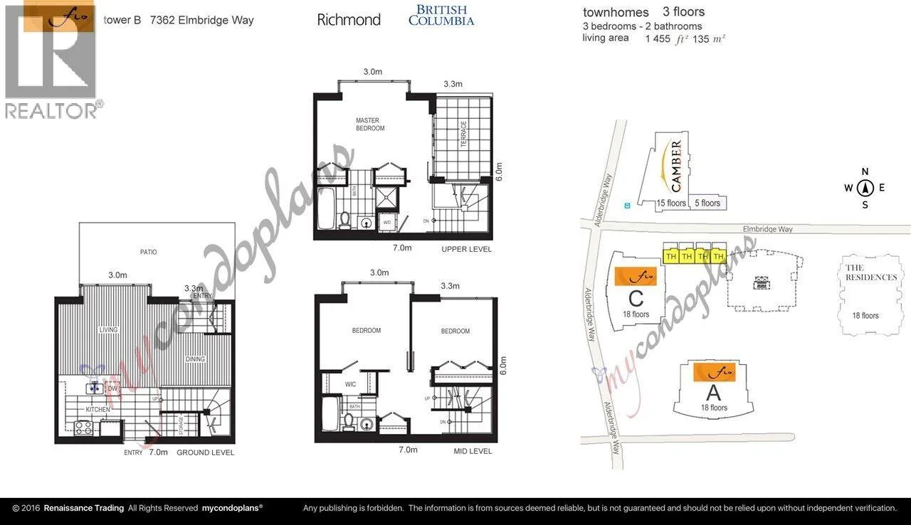 Welcome to your new home at FLO richmond! This three level concrete townhouse has 1451 sqft of living space, bright and spacious, open concept kitchen with SS appliance, granite coutertops and plenty of cabinets. About the main, there are two large bedrooms with a three-piece bathroom. The master bedroom is on the top floor features a four-piece ensuite bath and a huge balcony for your outdoor entertainment. Two parkings and one locker. Building including luxury amenities such as a Media room, Sauna, Outdoor Pool, GYM and Clubhouse. Walking distance to Minoru Park, Richmond Center, Oval, T&T and Skytrain. Must see! (id:27476)