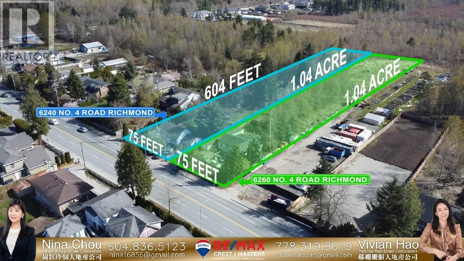1.04 acre lot, located at No.4 Rd and Westminster Hwy. Central location, close to McNeil Secondary, Daycare centers, Garden City Lands Park and Walmart. Being sold together with 6260 No.4 Rd, which is the adjoining land on the south side. Great investment opportunity! Great value to hold or to build your dream home. (id:27476)