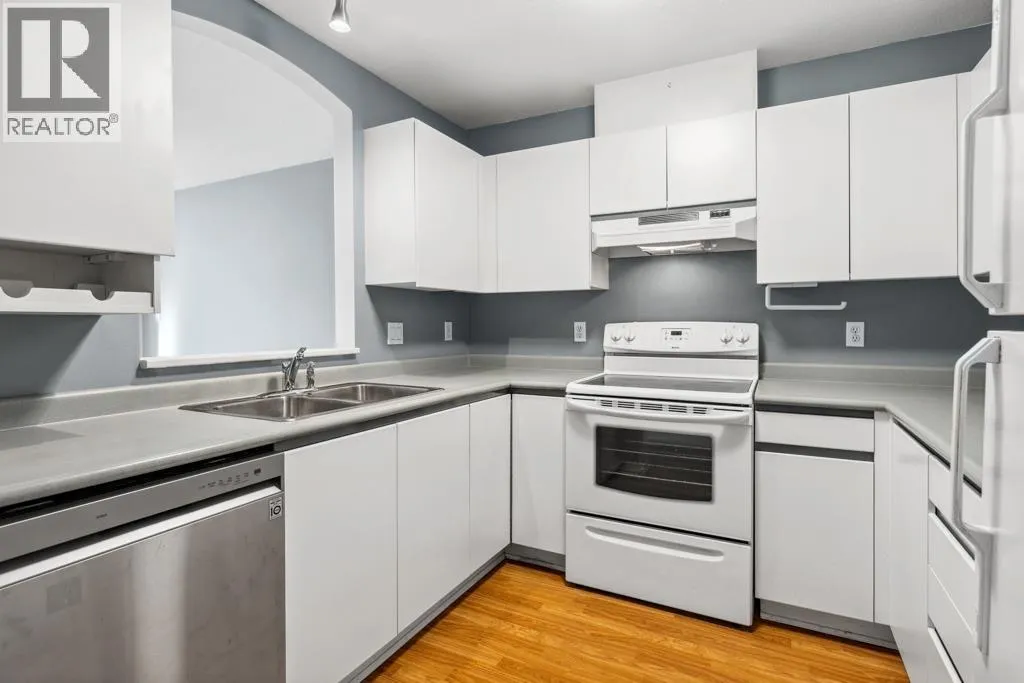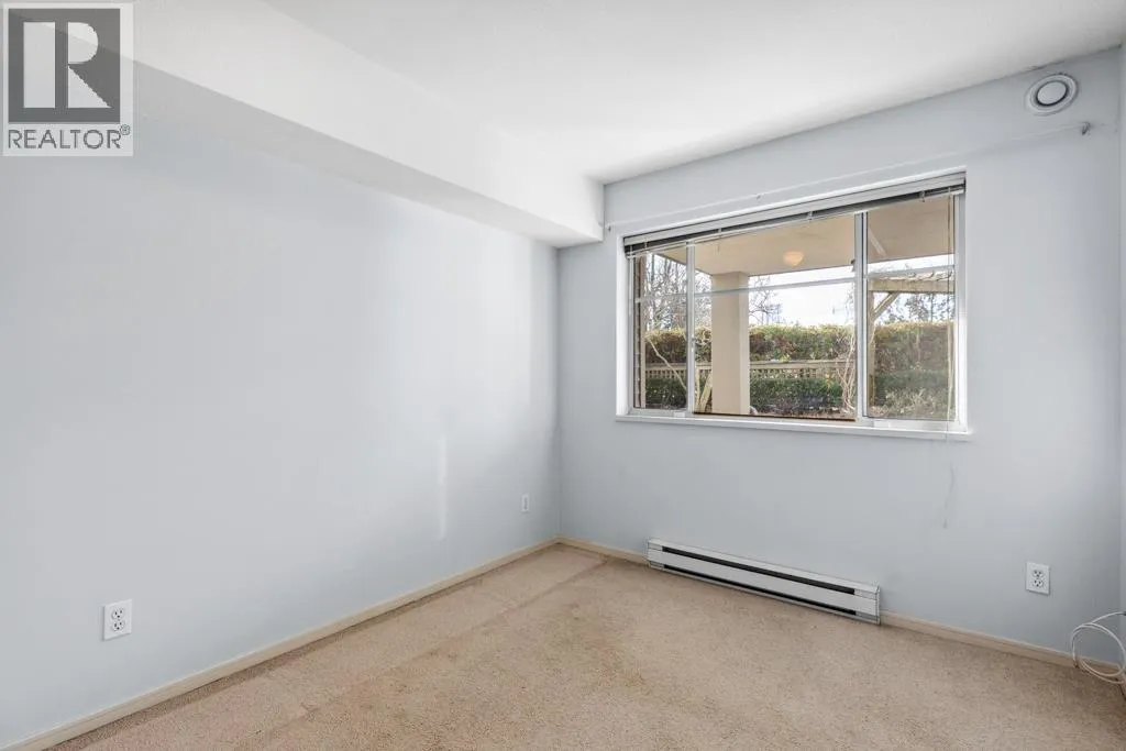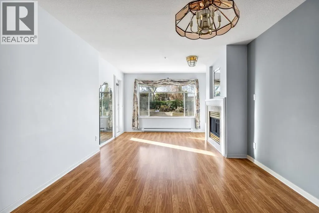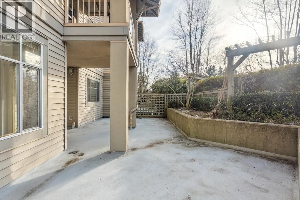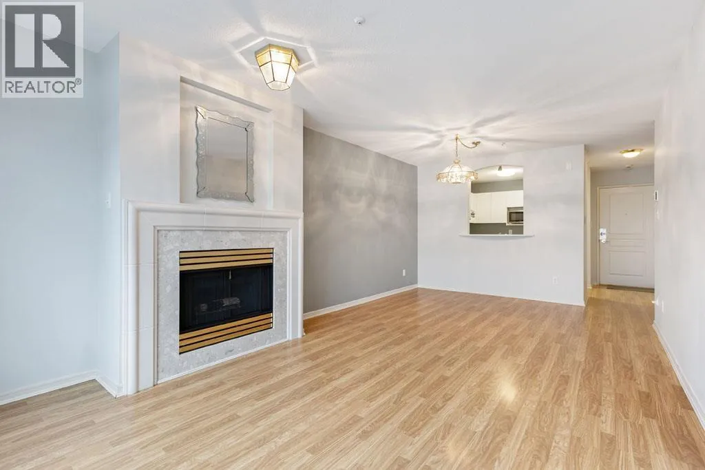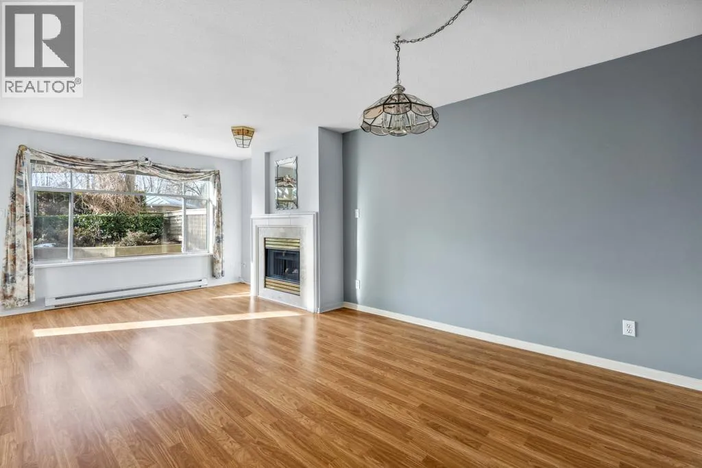 Laguna is a quiet, well-maintained gated community surrounded by mature trees and shrubs. This spacious 977sf garden-level unit offers 2 bedrooms and 2 bathrooms with laminate floors in most areas and a massive 465sf paved patio bordered by planters. The rectangular living room features a gas fireplace, ceiling light, and a large window facing the patio. The dining area has a classy chandelier, while the kitchen offers three rows of white cabinets and a pass-through window. The primary bedroom fits a king-size bed, overlooks the patio, and includes a walk-in closet with mirrored doors plus a 4-piece ensuite. The second bedroom also overlooks the patio, with another 4-piece bathroom. Rent includes one parking stall and a hanging locker. (id:27476)