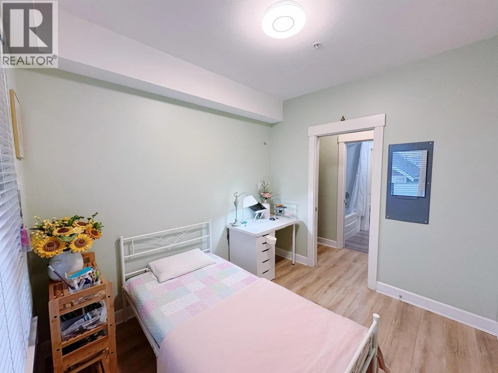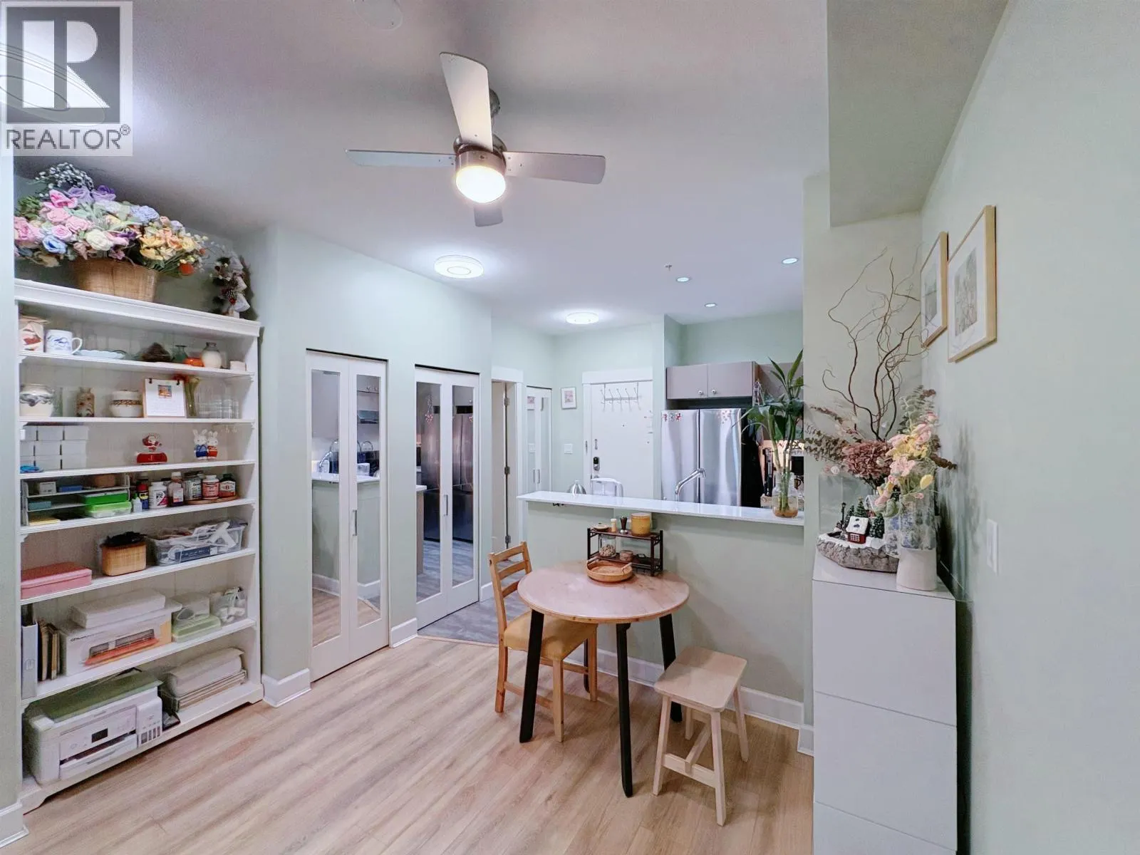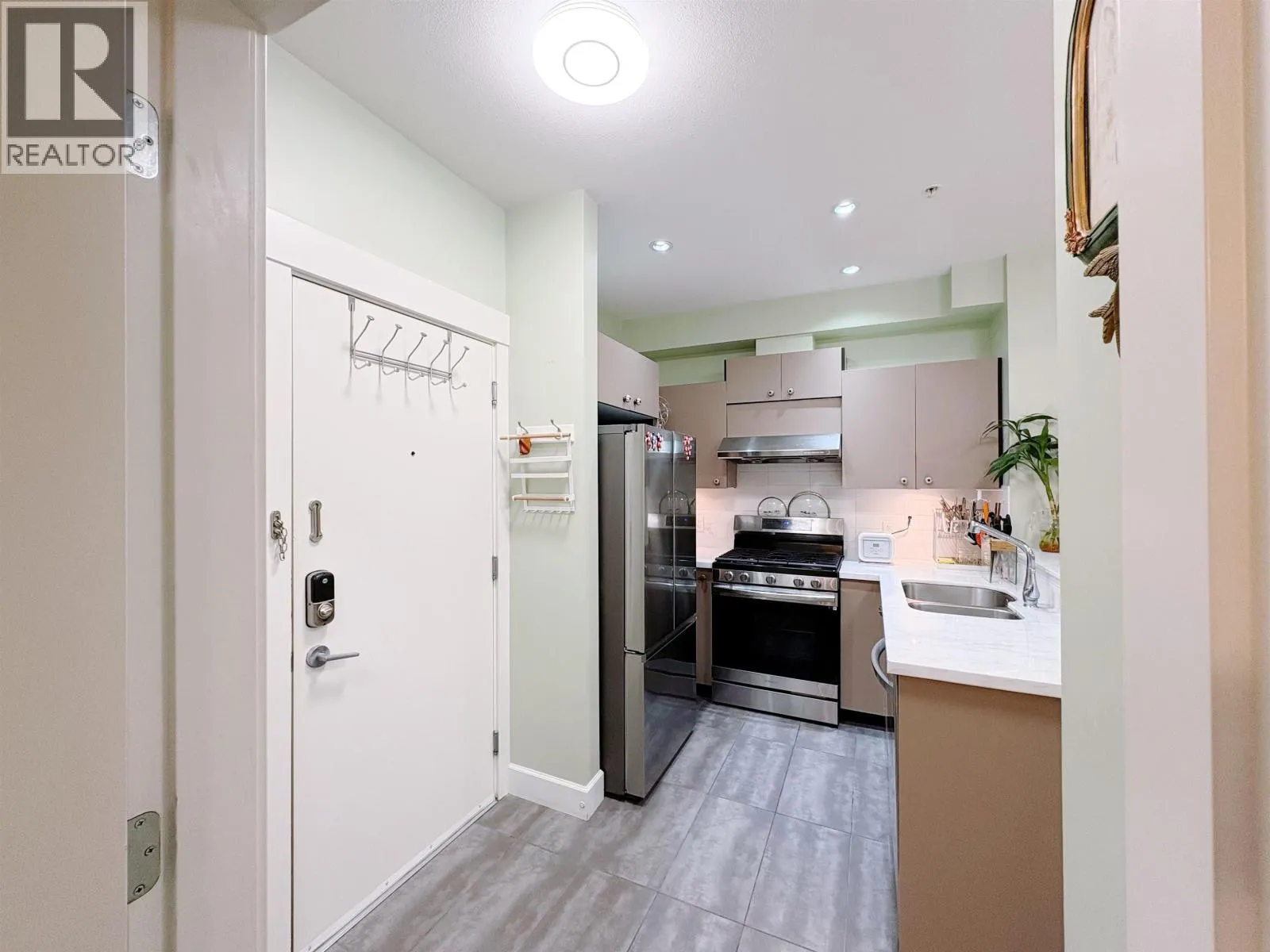 This beautifully upgraded 581 sq.ft, home offers both serenity and convenience one block from Richmond Centre, yet quietly tucked away from the main streets. The layout is efficient and inviting: a bright open kitchen connects to the living area, while the Den fits a double bed and desk with built-in shelves and lush green views. The bedroom accommodates a queen bed and desk comfortably. Large windows fill the home with soft, natural light throughout the day, creating a calm and private atmosphere. Located across from Cook Road Elementary with its playground and a nearby Community Garden, this home offers a perfect balance of urban accessibility and peaceful living - ideal for singles, couples, or small families. (id:27476)