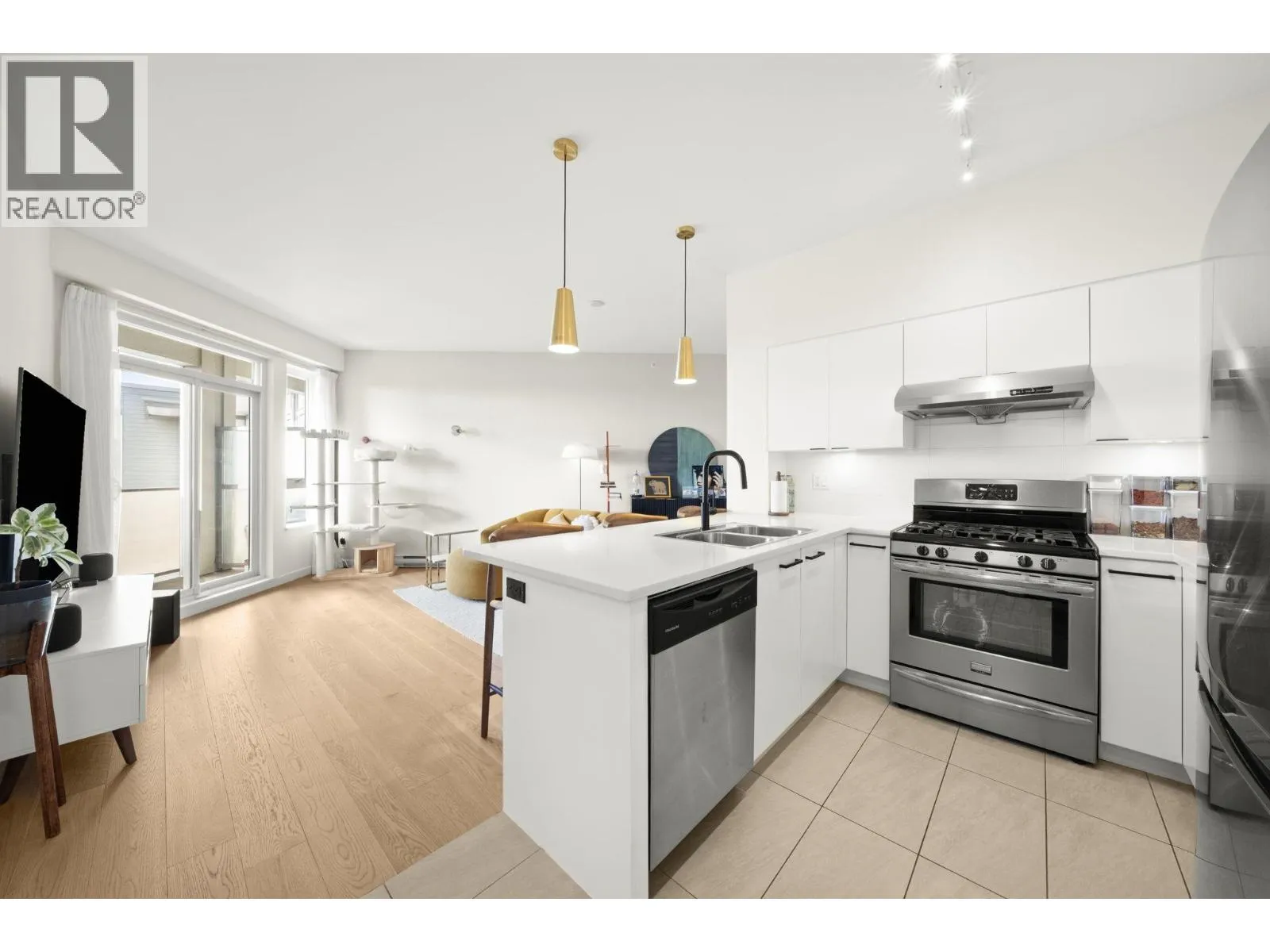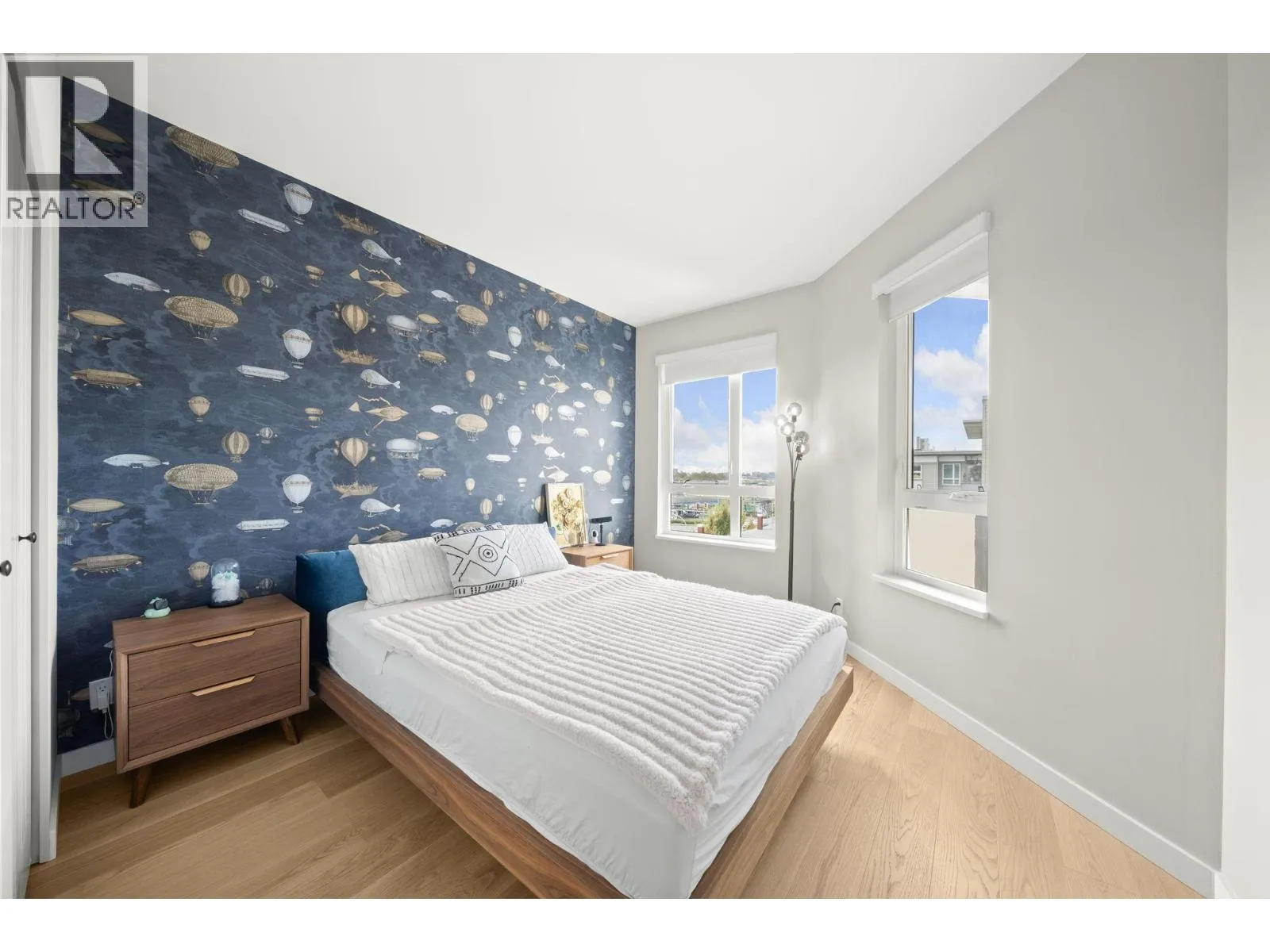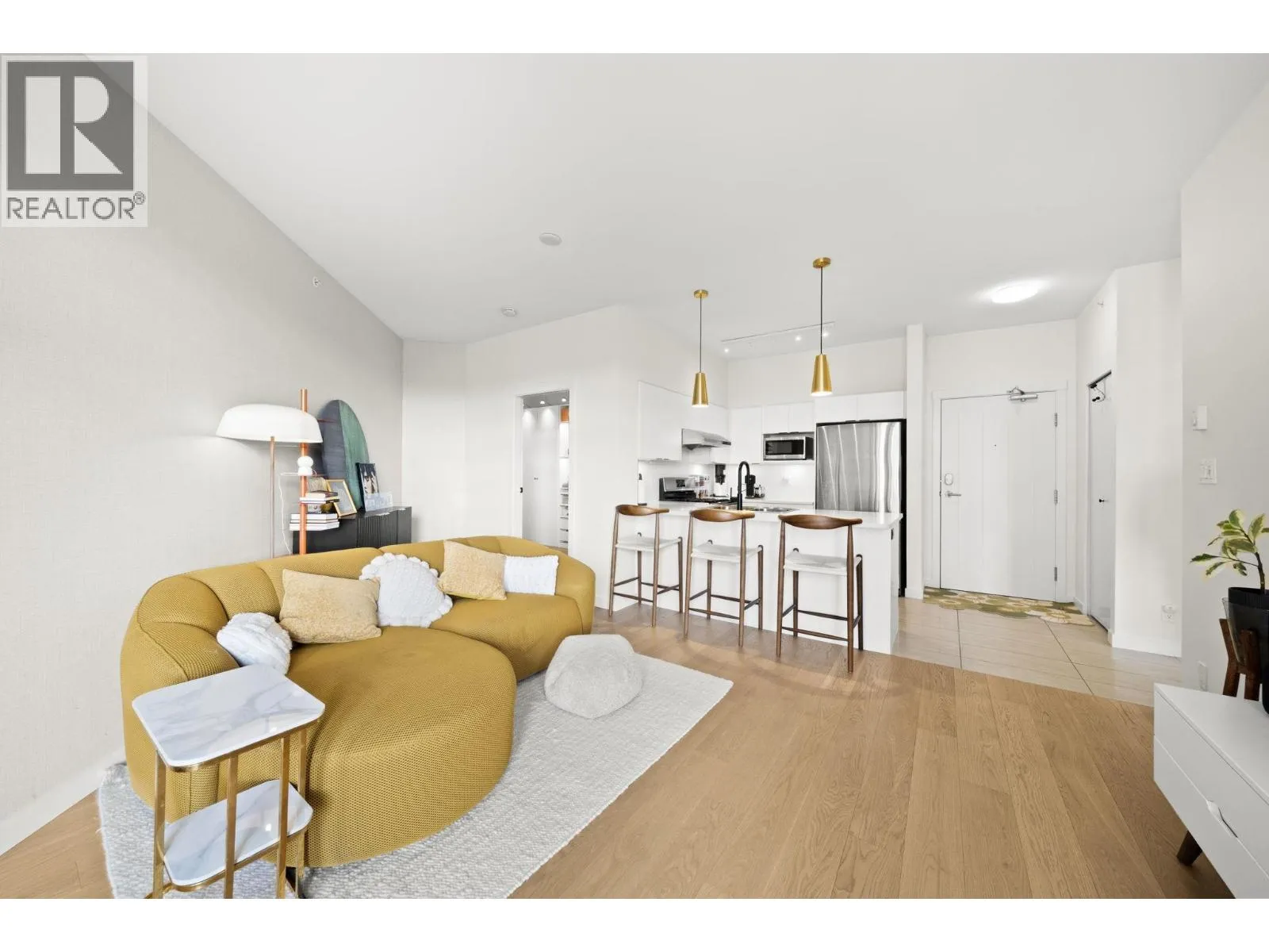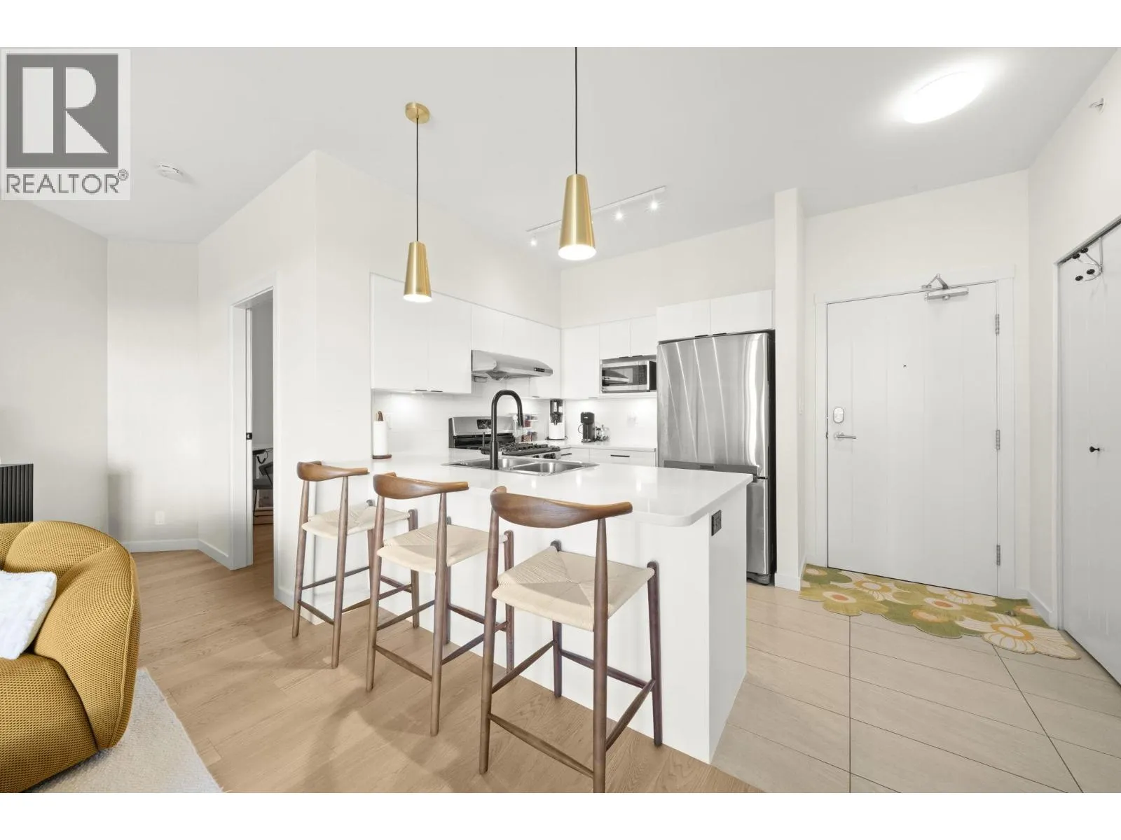 Proud to preset the BEST Jr.2 Bedroom home in Richmond UNDER $550k. Renovated in 2022 with completely new Engineer Hardwood Floor, new LG smart full-size washer and dryer, new window blinds and sheer covering, all LED lights upgrade, new faucets, designer wallpaper and fresh new paint of the entire unit including door trim and baseboard. This home is filled with love with lot of warmth, positive good vibe and home sweet home moment. This Penthouse comes with Extra High Ceiling, draws in tons of natural light, blue sky and the beautiful courtyard view from every window. Comes with TWO side-by-side parkings. (id:27476)