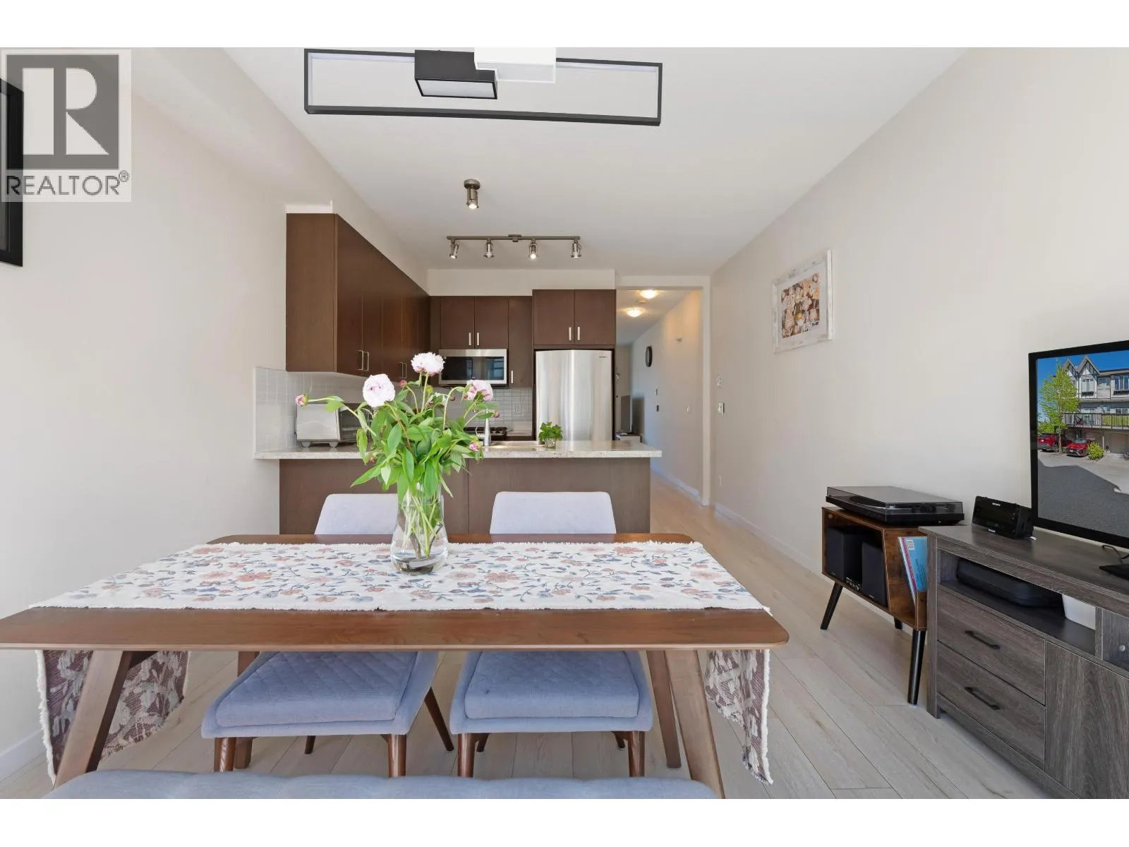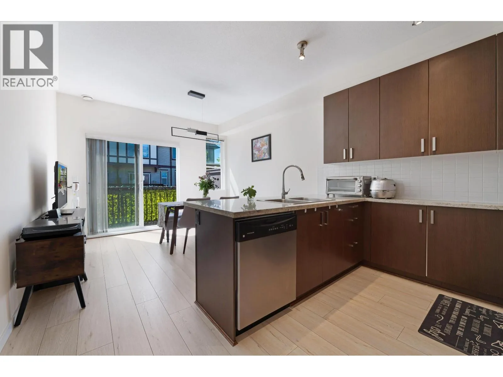 Welcome to Wishing Tree by Polygon, a perfect home for families in central Richmond. This inviting 3-bed, 2-bath townhouse features 9' ceilings, new laminate flooring, and ceiling fans for comfort and fresh air all year. The modern kitchen with granite counters and stainless steel appliances makes family meals a joy. Upstairs are two spacious bedrooms and a full bath, plus a versatile ground-floor bedroom ideal for guests or a home office. Enjoy a fenced yard, a single garage with extra storage, and a second parking spot. The community offers a clubhouse, gym, lounge, and playground-just steps from great schools, parks, shops, and transit. (id:27476)