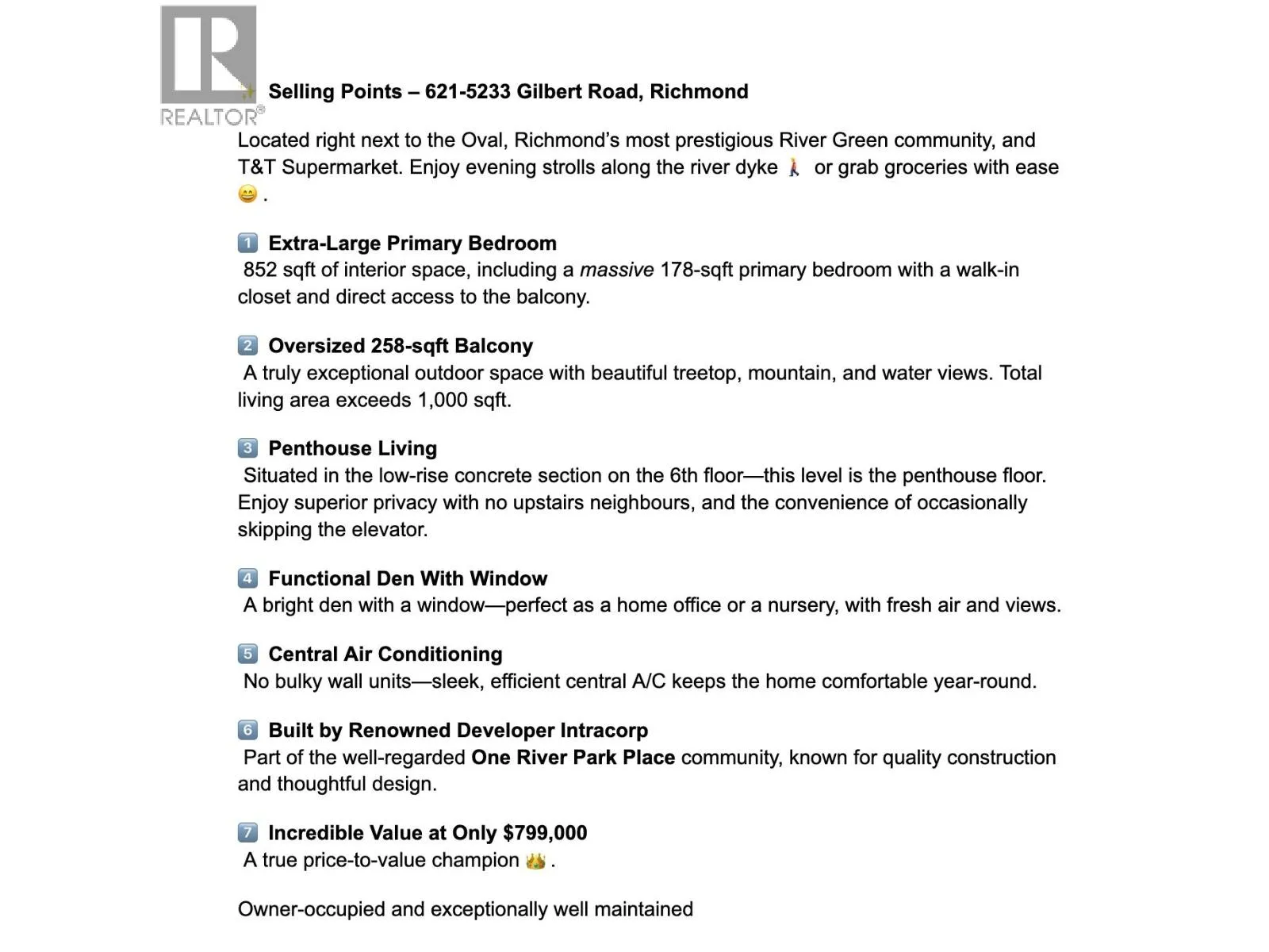 Penthouse Unit on low-rise concrete section! Excellent central Richmond location! Steps to the Olympic Oval, T&T, restaurants, banks, River Green and the river dyke-super convenient and perfect for daily walks. One River Park Place by Intracorp with an excellent floor plan: an extra-large primary bedroom, a den with window ideal for office or nursery, and a huge 258 sq.ft. balcony with beautiful river & mountain views. 2 Separated bedrooms offer great privacy. Features European s/s appliances, marble counters, stone backsplash, and central air conditioning with heating & cooling. Amenities include concierge, basketball court, gym, yoga, music/study/media rooms and a courtyard garden. (id:27476)