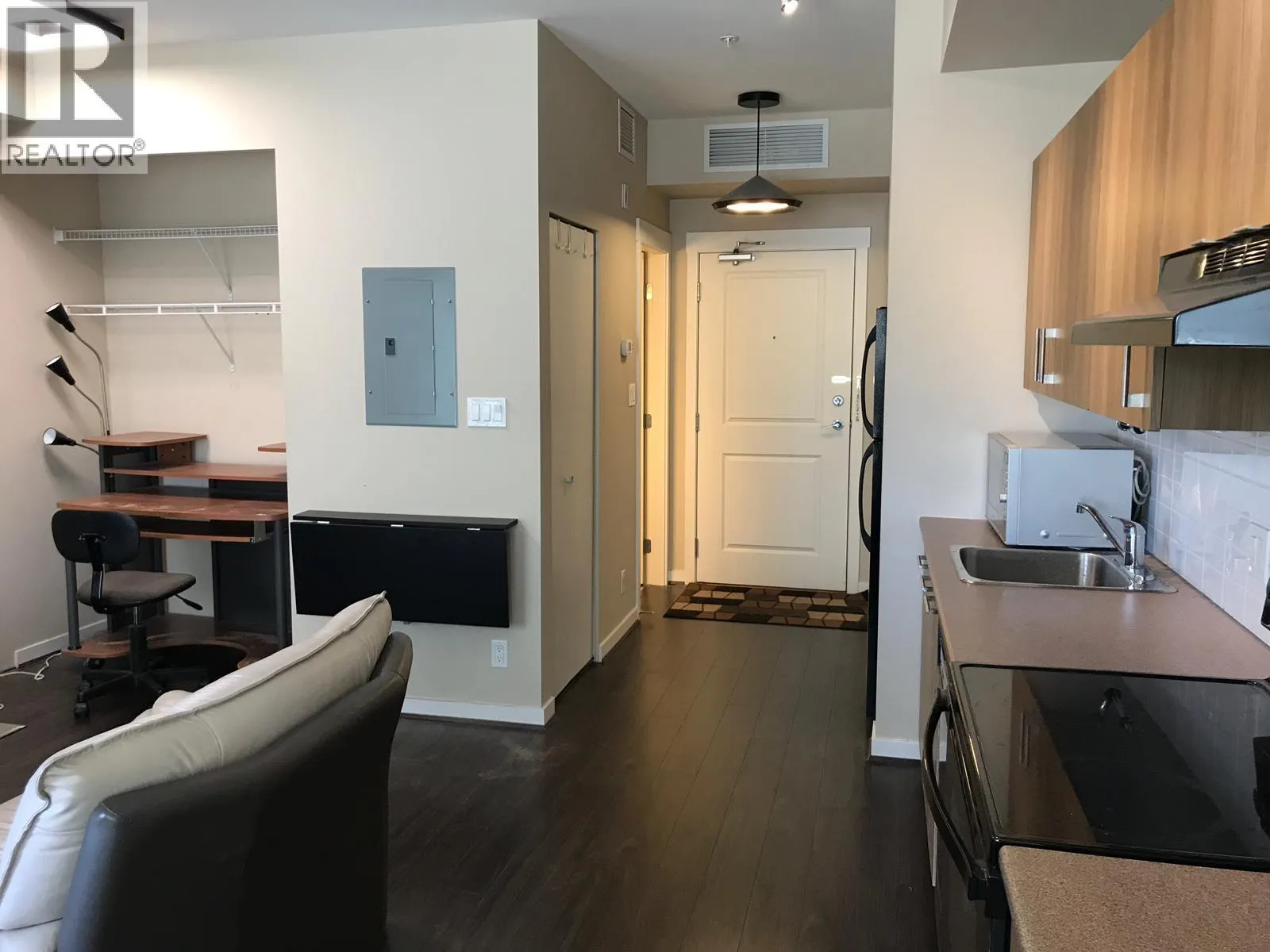 Top-floor studio at Remy in Richmond City Centre. Approx. 400 sq.ft. with bright south exposure, efficient open layout, modern kitchen with stone counters and stainless-steel appliances, air conditioning with geothermal heating, and in-suite laundry. Includes 1 secured parking. Concrete building with gym, clubhouse, courtyard, and bike storage. Steps to Aberdeen Centre, SkyTrain, restaurants, and major routes. Minimum 1-year lease; tenant pays utilities; no smoking or subletting; pets by approval; move-in fees apply. Background/credit/reference checks and tenant insurance required. When inquiring, include occupants, start date, pets, reason for move, and contact info. Presented by Randal Kung PREC, RE/MAX Crest Realty. (id:27476)