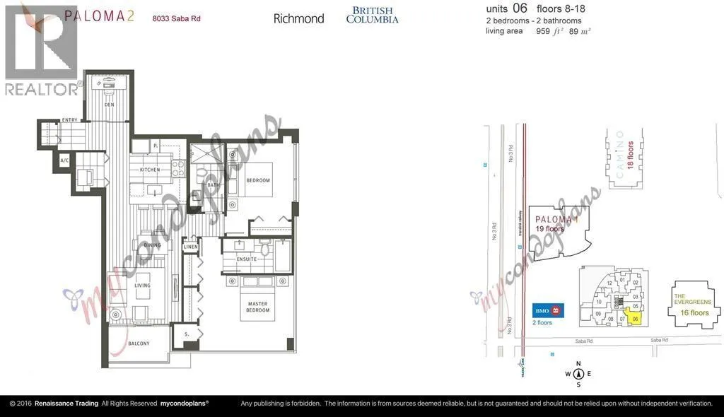 Welcome to Paloma 2, a luxury concrete high-rise ideally located in the heart of downtown Richmond. This bright and spacious 2-bedroom + large den home offers nearly 960 sq.ft. of well-designed living space, featuring: - Central air conditioning - Gourmet kitchen with stainless steel appliances and granite countertops - Open-concept living and dining area, perfect for entertaining - Two spacious bedrooms, including a primary with walk-in closet and ensuite - Den ideal for a home office or study - Private balcony with city views Building Amenities - Fitness centre - Party lounge - Rooftop garden - Secure parking and visitor parking Location Highlights Steps away from Richmond Centre, SkyTrain, restaurants, banks, and shops. Convenient access to YVR Airport and Vancouver via Canada Line (id:27476)