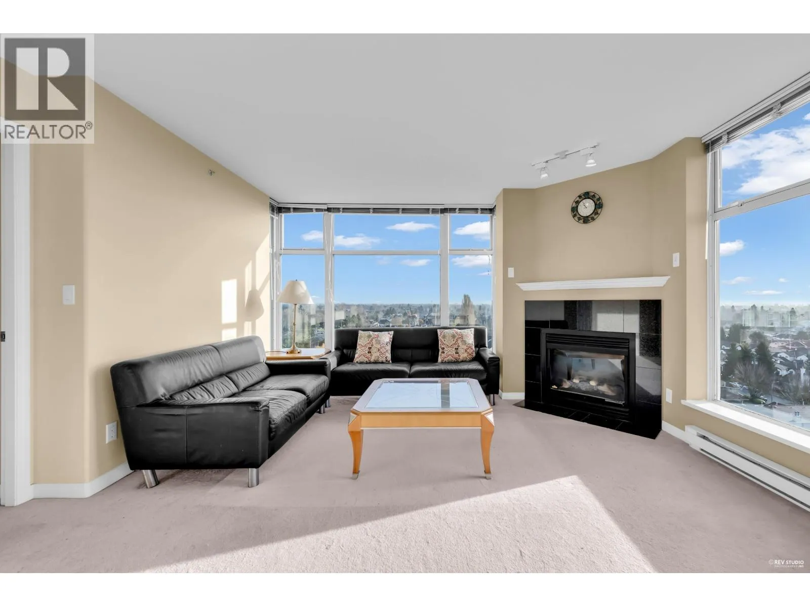 Monaco at The Palms, a stunning southeast corner home perched on the 15th floor with 3 bedrooms, 2 baths, and 1205sqft of bright, well-maintained living space. Original owner, pride of ownership throughout. Floor-to-ceiling windows and a cozy fireplace highlight the spacious living room, French door opens to a covered balcony with breathtaking 270° panoramic views of the city and beyond. Enclosed kitchen with sliding doors and gas stove is perfect for chefs. Primary suite offers ample closet space and ensuite, with two additional bedrooms providing flexibility for family, guests, or office. Two elevators serve only six units per level, ensuring privacy. Amenities include clubhouse, gym, steam room, hot tub, workshop, and gardens. Steps to Richmond Centre, Minoru Park, SkyTrain and schools. (id:27476)