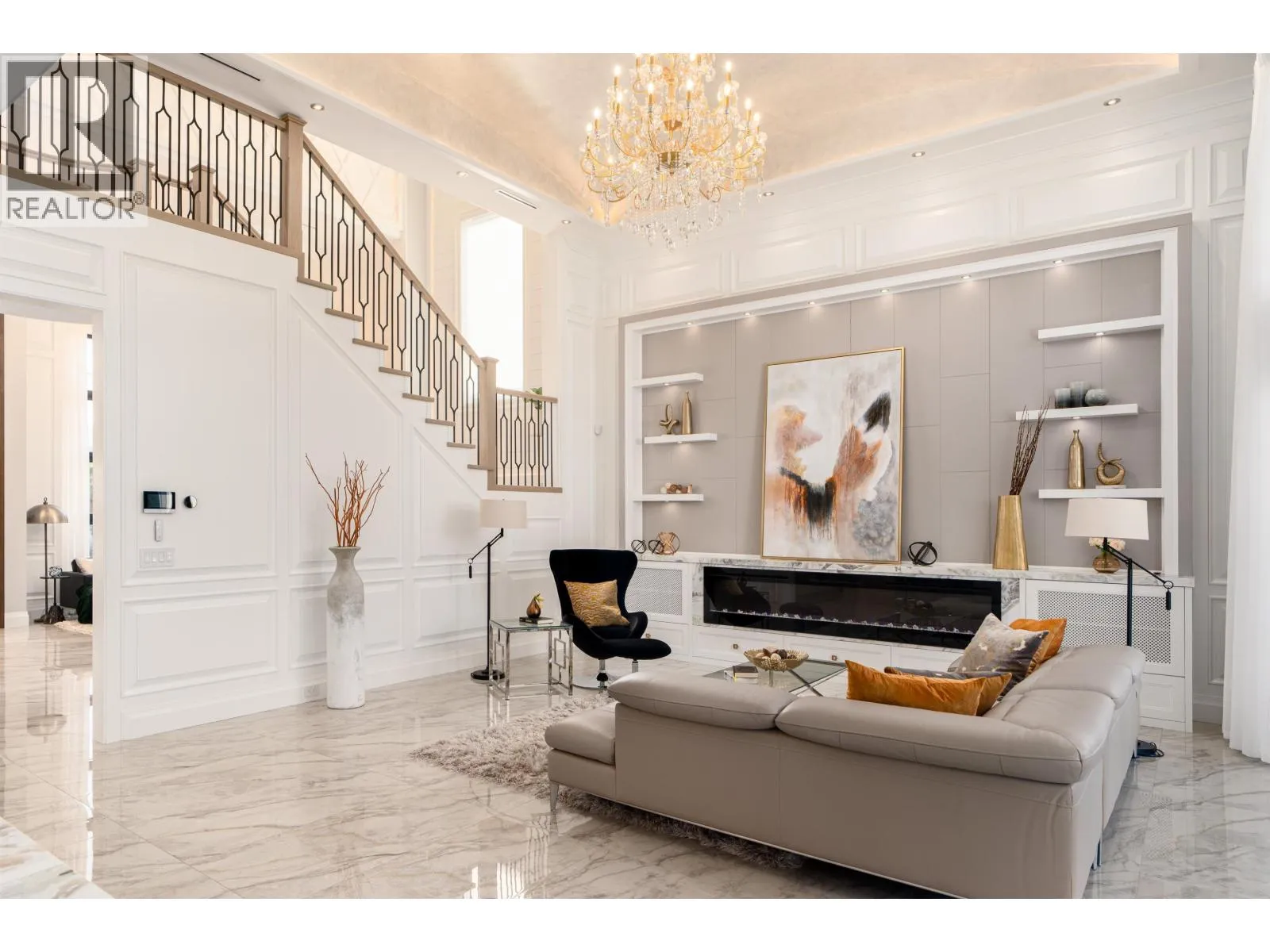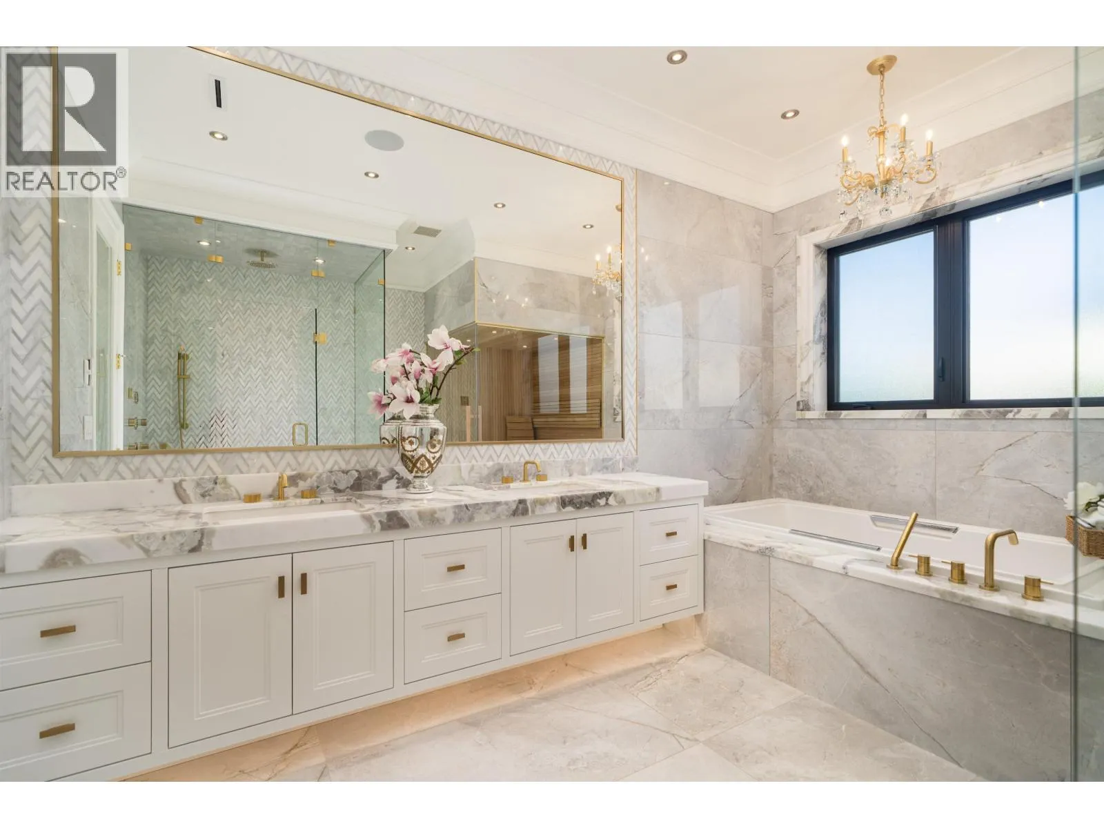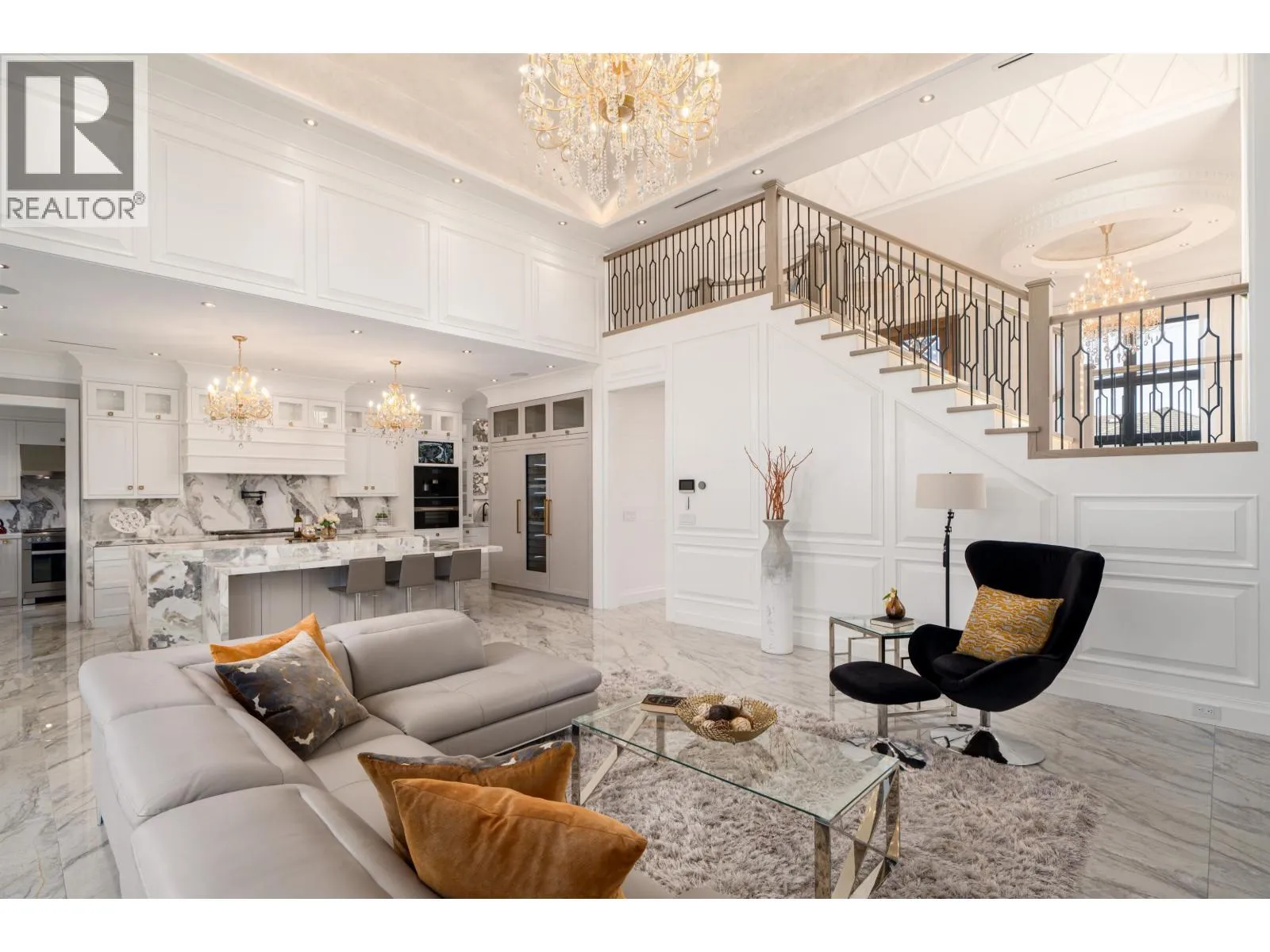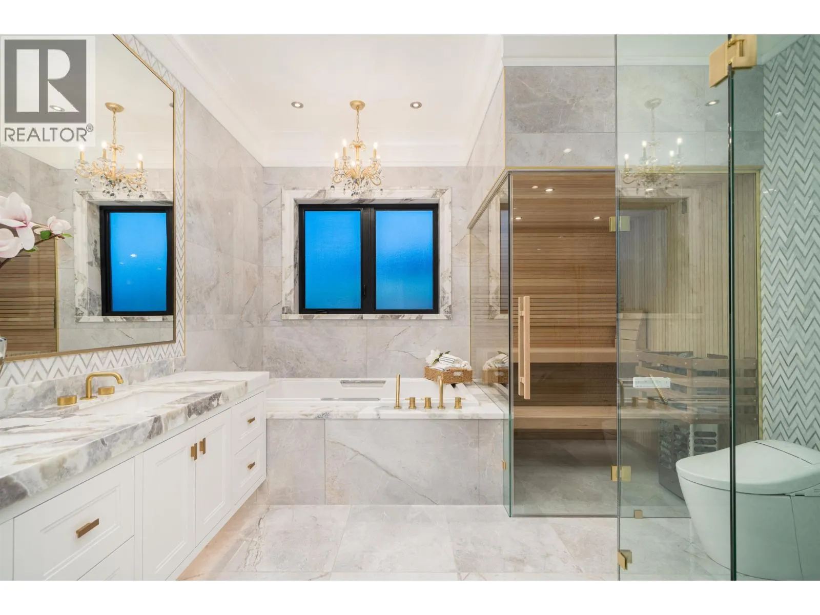 Elegant and luxurious custom home in prestigious Granville area! North-South facing with a grand foyer featuring a stunning circular ceiling design and artistic wall accents. Italian marble flooring throughout, adorned with dazzling chandeliers. Spacious family room boasts a soaring vaulted ceiling, custom marble wall panel, and a warm fireplace. Gourmet kitchen with European marble countertops, top-tier Miele appliances, and premium cabinetry. Two master bedrooms, one with an expansive sundeck; all four upstairs bedrooms include walk-in closets. Legal suite below. Smart home system with motorized curtains, A/C, HRV, Hikvision intercom. Enjoy a fully equipped media room with wet bar, plus a private sauna. A true masterpiece for the discerning buyer! (id:27476)