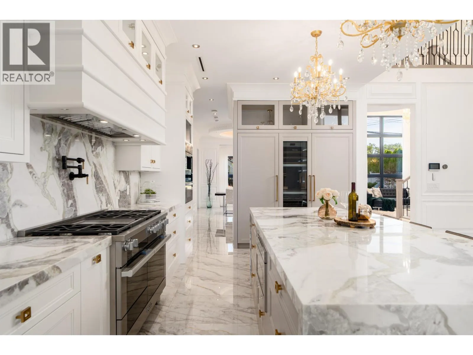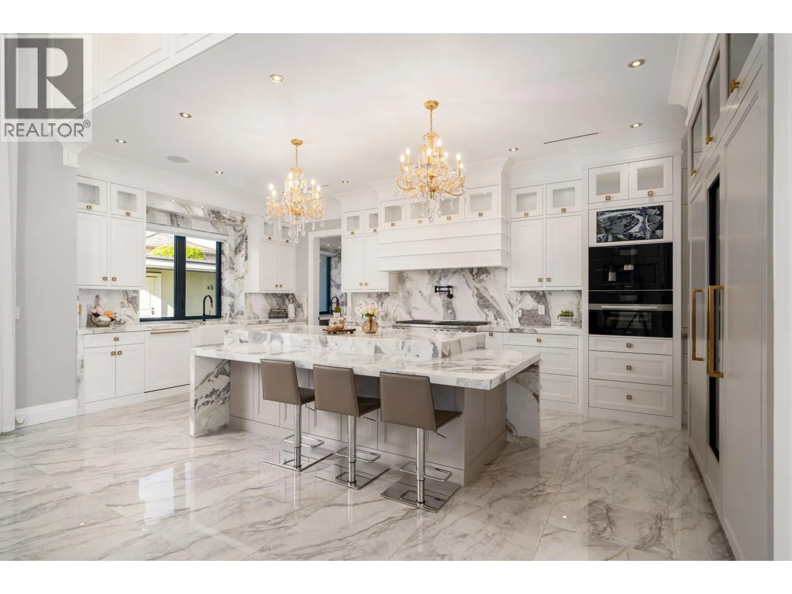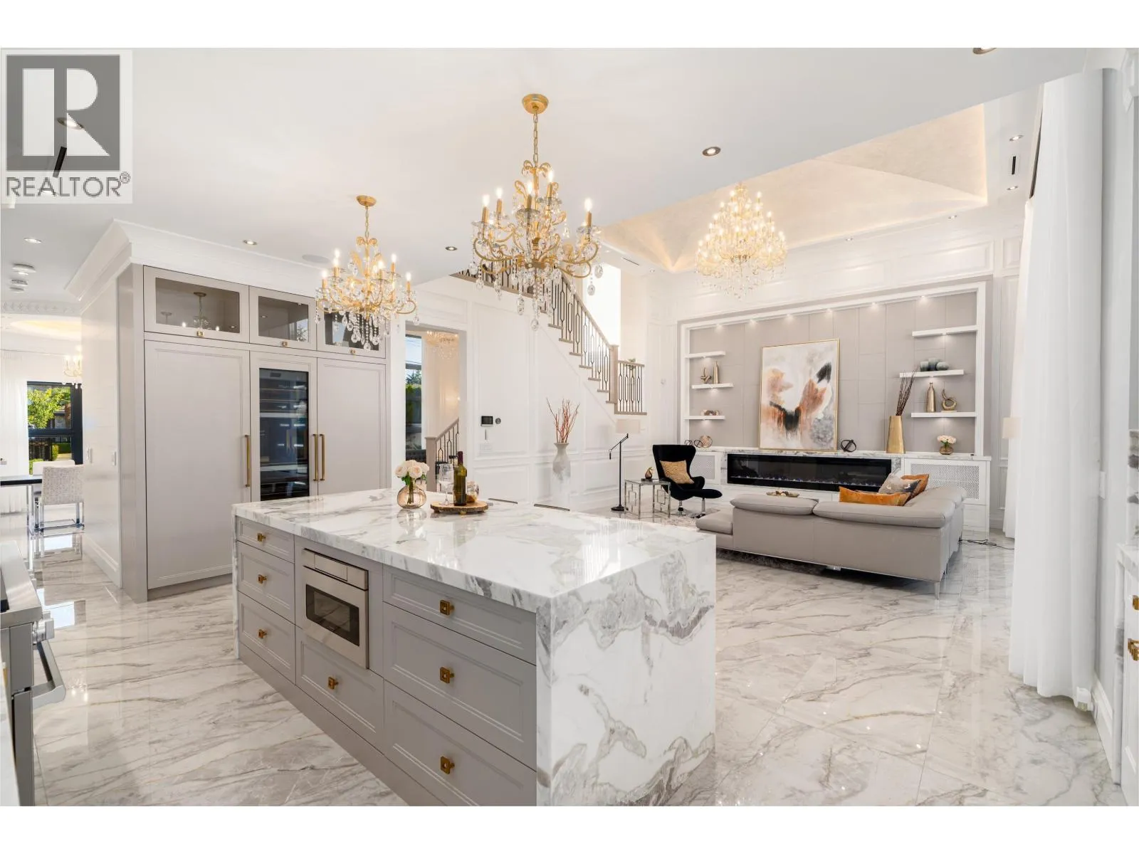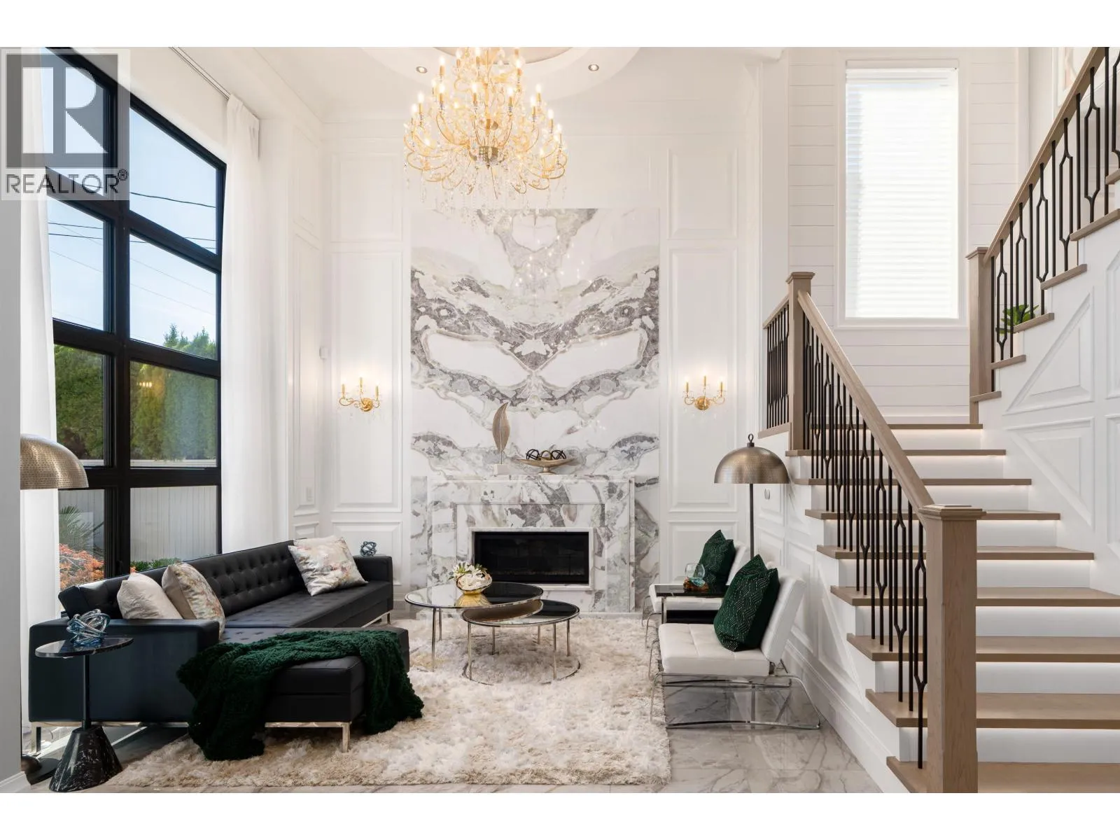 Elegant and luxurious custom home in prestigious Granville area! North-South facing with a grand foyer featuring a stunning circular ceiling design and artistic wall accents. Italian marble flooring throughout, adorned with dazzling chandeliers. Spacious family room boasts a soaring vaulted ceiling, custom marble wall panel, and a warm fireplace. Gourmet kitchen with European marble countertops, top-tier Miele appliances, and premium cabinetry. Two master bedrooms, one with an expansive sundeck; all four upstairs bedrooms include walk-in closets. Legal suite below. Smart home system with motorized curtains, A/C, HRV, Hikvision intercom. Enjoy a fully equipped media room with wet bar, plus a private sauna. A true masterpiece for the discerning buyer! (id:27476)