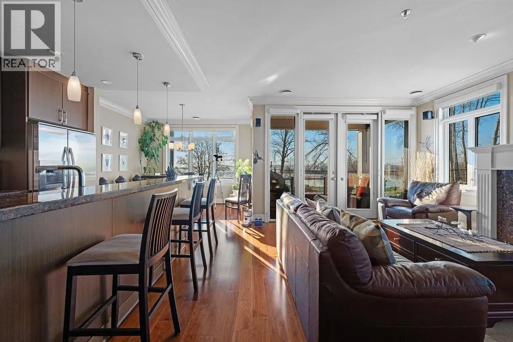 Waterfront living at its best! This rarely available luxury waterfront single level home offers unobstructed views of the Fraser River. This home features engineered hardwood floors, a gourmet kitchen with high-end appliances, a 6-burner stove, wine fridge and warming drawer. Enjoy sunsets and water views from the South-West facing patio, creating seamless indoor-outdoor living. Includes geothermal heating/cooling, built-in surround speakers, a custom walk-in closet, and a spa-inspired bathroom with a steam shower and heated floors. Enjoy your own private double car garage and storage locker. This is a rare opportunity to enjoy premium waterfront living in one of Richmond´s most sought after communities. (id:27476)