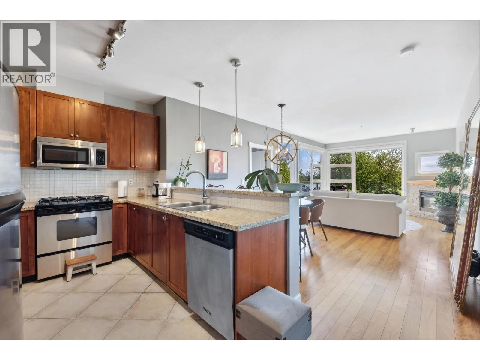 Welcome to Copper Sky, a coastal retreat nestled in beautiful Steveston. Offering modern elegance & comfort. This stunning 2 Bed, 2 Bath + Den condo spans over 1,000 sqft of thoughtfully designed space, featuring high ceilings & large windows that flood the home with natural light. The open-concept gourmet kitchen boasts SS appliances & granite countertops perfect for hosting family & friends. Relax in the spacious living area with a cozy fireplace & direct access to your private balcony, ideal for enjoying serene views of the waterfront. Retreat to the master bedroom with a walk-in closet & an ensuite bath. Enjoy access to amenities such as a fitness center & a rec room. Located in a coveted neighbourhood, you're just steps away from the scenic boardwalk, shops & highly rated restaurants. (id:27476)