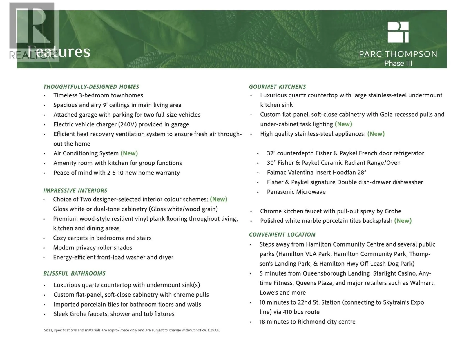 Welcome to Parc Thompson - Phase 3, the newest release in this established East Richmond townhouse community, featuring comprehensive upgrades throughout compared to earlier phases. This modern home offers an open-concept layout with a fully upgraded HVAC system providing whole-home air conditioning, enhanced appliances, upgraded flooring and wall finishes, and improved overall build quality and craftsmanship. The gourmet kitchen features stainless steel appliances, while expansive windows bring in abundant natural light. Designed for comfortable, contemporary living, the home delivers a noticeably higher level of finish and quality. Quiet yet convenient location just minutes to Queensborough Landing, parks, schools, and easy highway access. (id:27476)