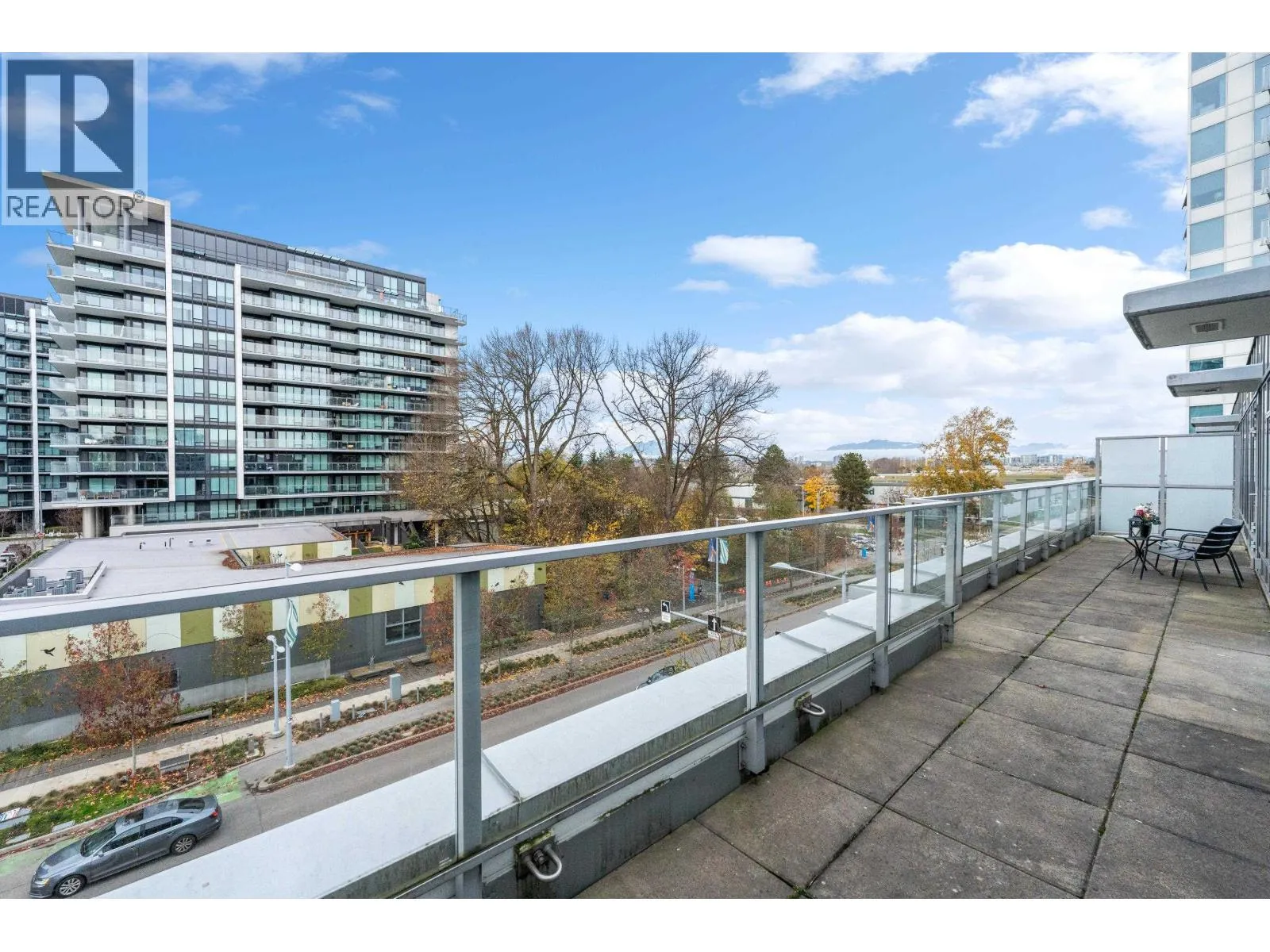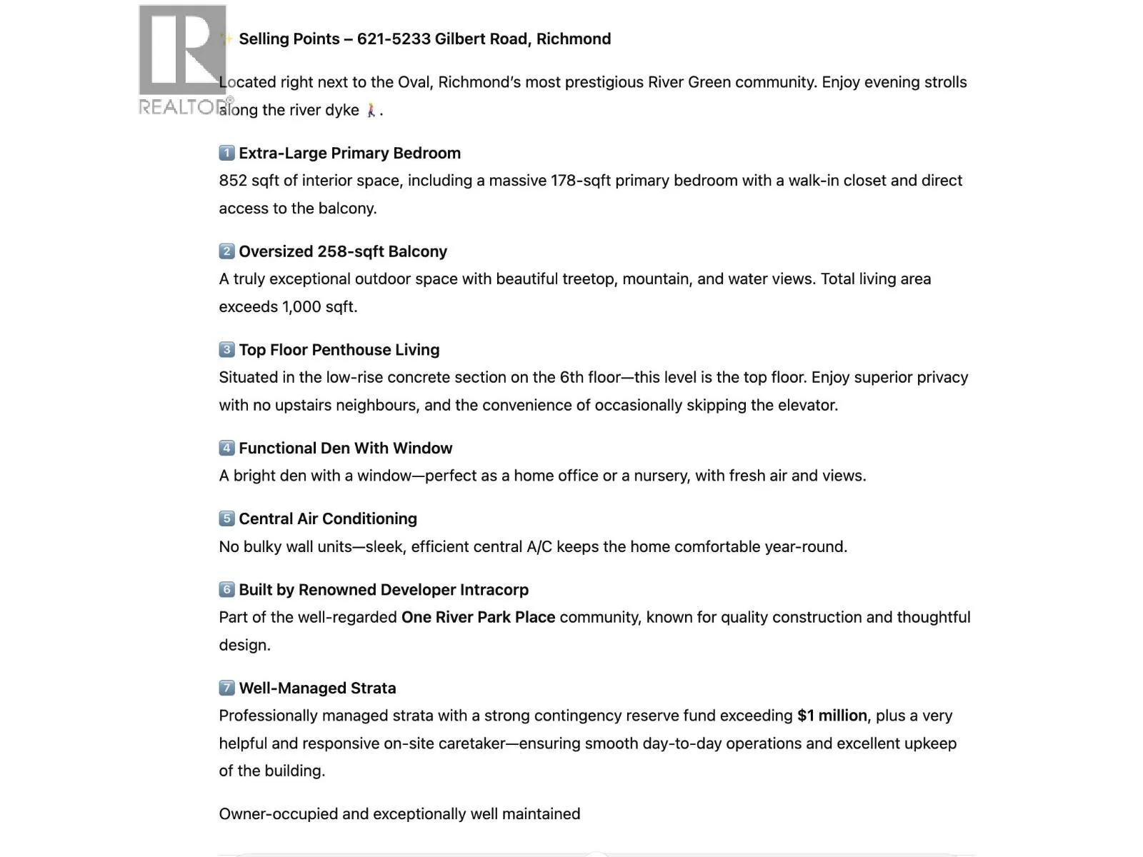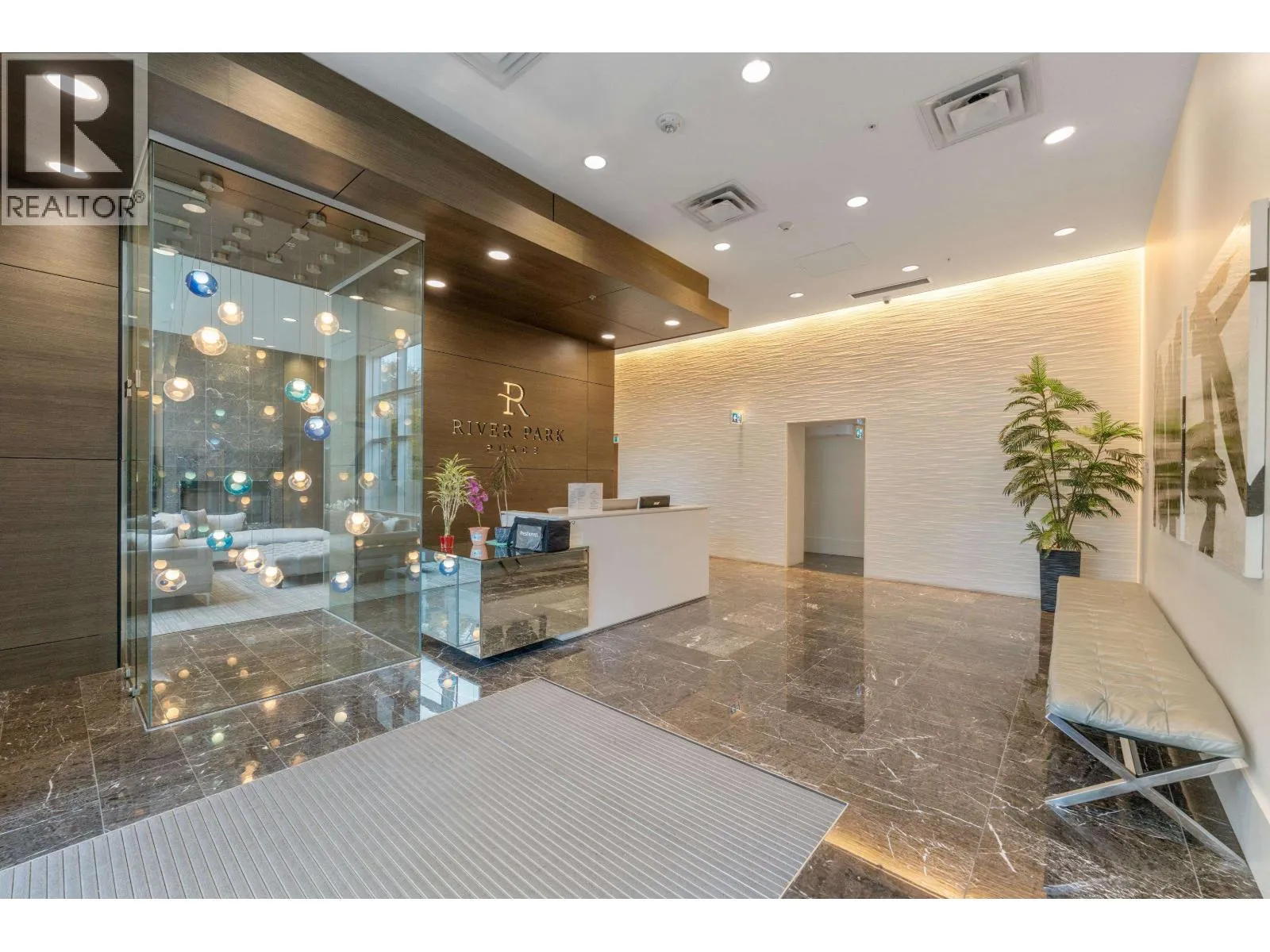 Top floor unit on low-rise concrete section! Steps to the Olympic Oval, restaurants, banks, River Green and the river dyke-super convenient and perfect for daily walks. One River Park Place by Intracorp with an excellent floor plan: an extra-large primary bedroom, a den with window ideal for office or nursery, and a huge 258 sq.ft. balcony with beautiful river & mountain views. 2 Separated bedrooms offer great privacy and each has an ensuite bathroom. Features European s/s appliances, marble counters, stone backsplash, and central A/C with heating & cooling. Amenities include concierge, basketball court, gym, yoga, music/study rooms and a courtyard garden. 1 Parking 1 Locker. Well managed strata with CRF 1.1 million (id:27476)