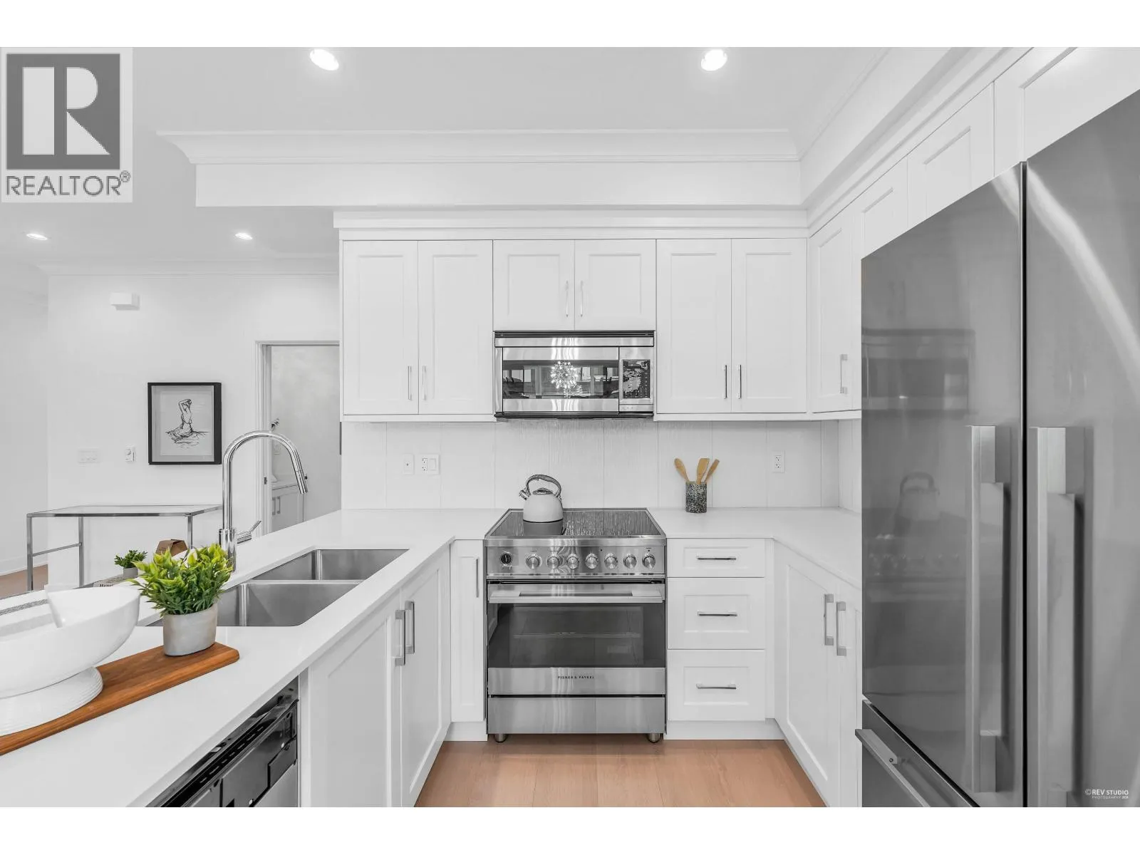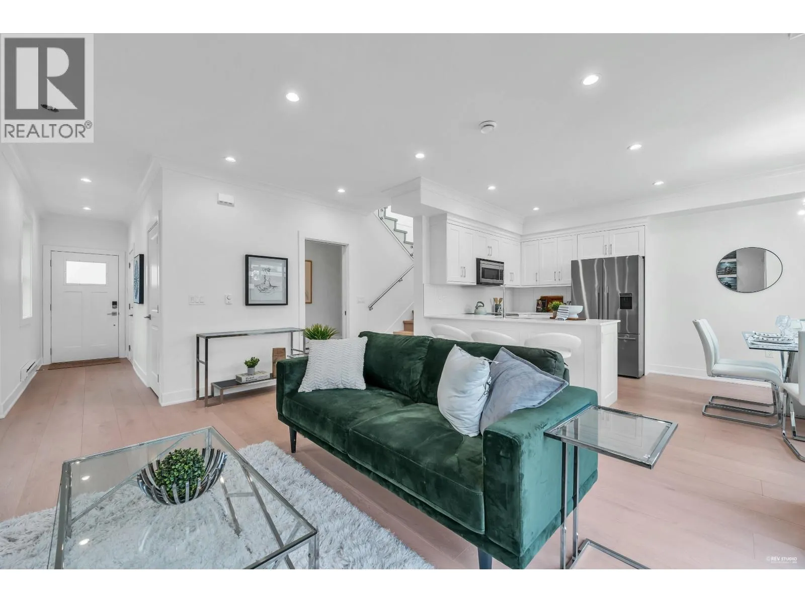 Stylish 2-story townhome showcasing modern design, high-end finishes, and abundant natural light. Gourmet kitchen with stainless appliances, quartz counters, and island seating open to a bright dining area and inviting living room with custom built-ins, underlit shelving, and a sleek electric fireplace. Features 3 full baths including a lower-level bedroom with cheater ensuite, perfect for guests or home office. Primary suite offers a spa-inspired ensuite retreat. Comfort living year-round with A/C, HRV, and heat pump. Enjoy a 2 car tandem garage with EV outlet and a large, fully landscaped private side yard for outdoor living. Steps to South Arm Community Centre, tennis & pickleball courts, outdoor pool, parks, and top schools James Whiteside Elementary and Hugh McRoberts Secondary. (id:27476)