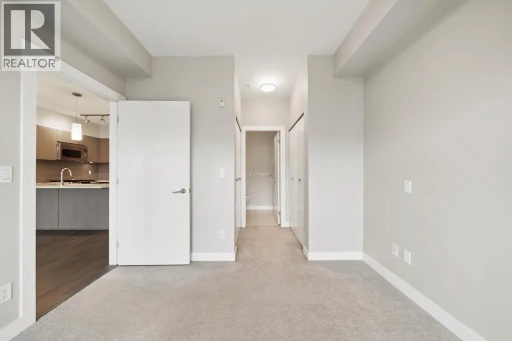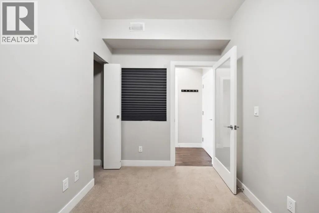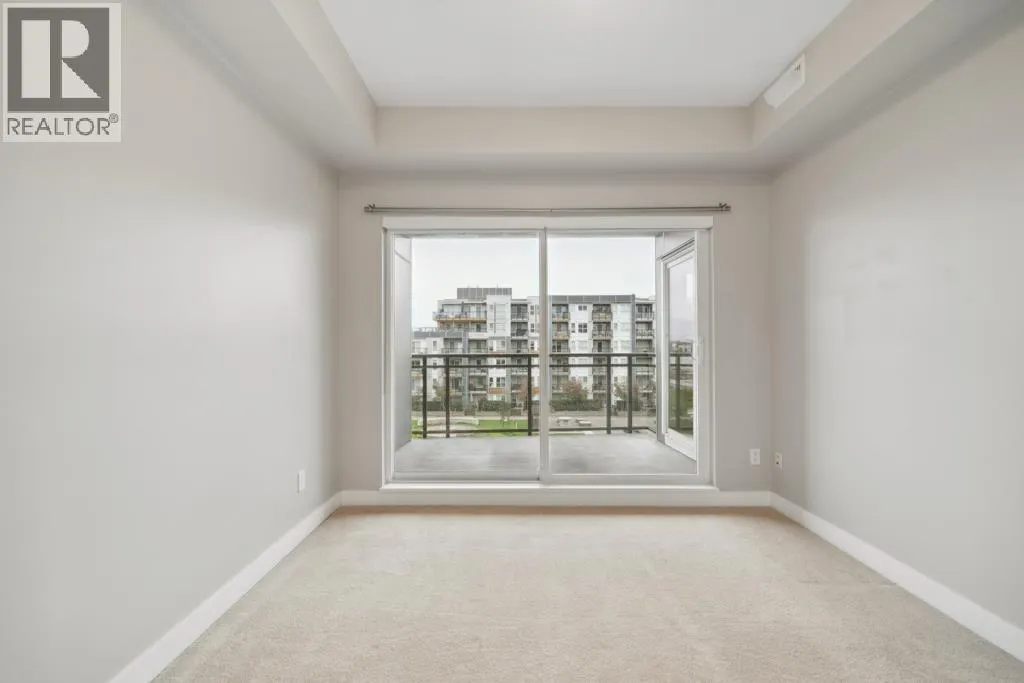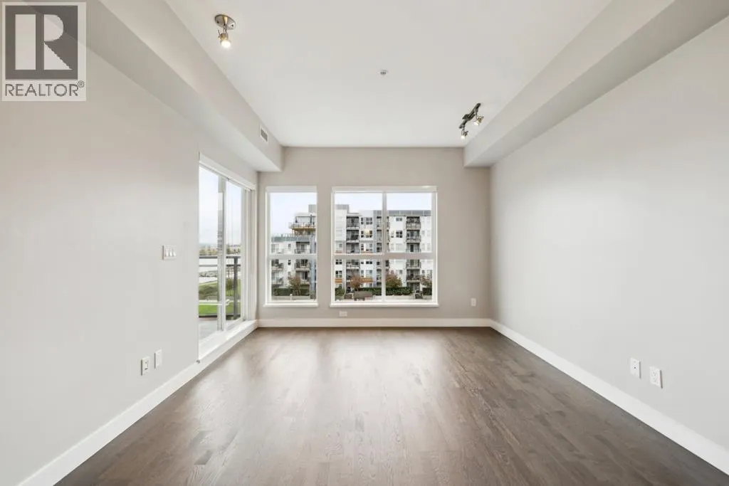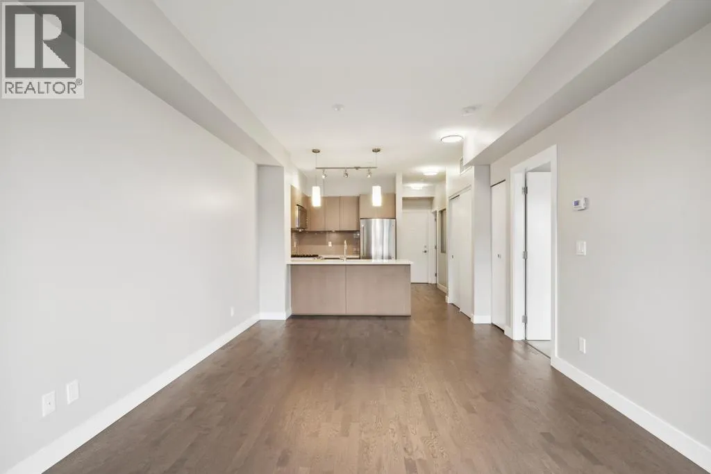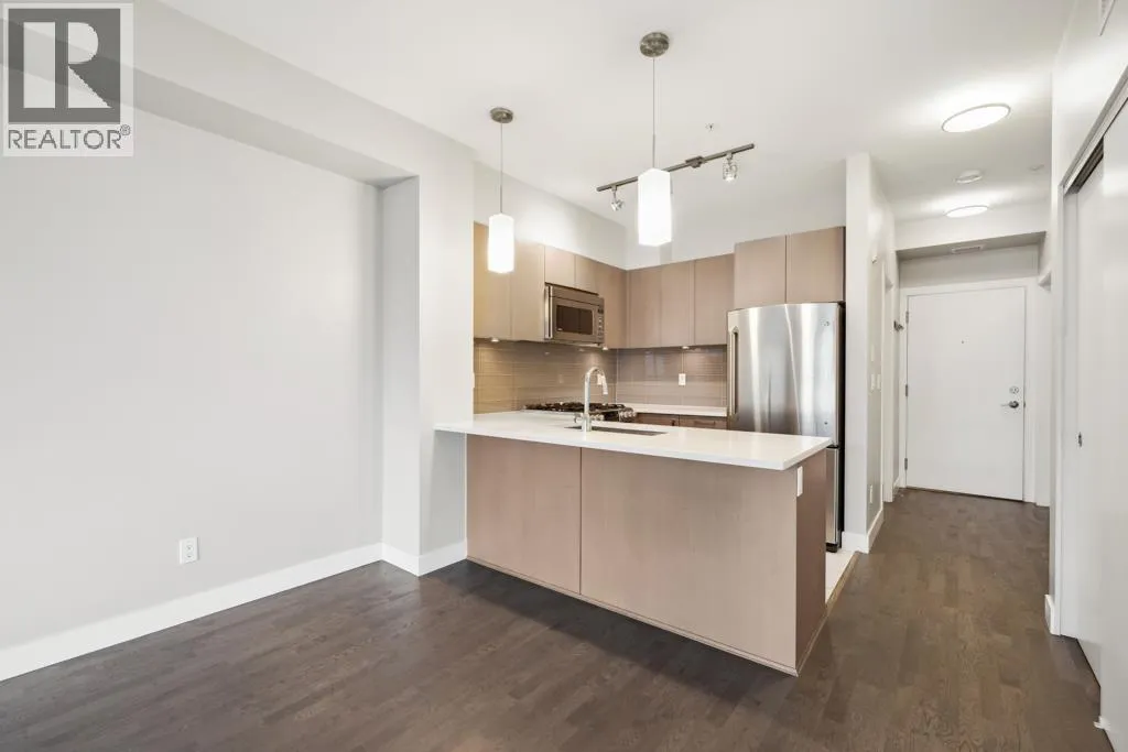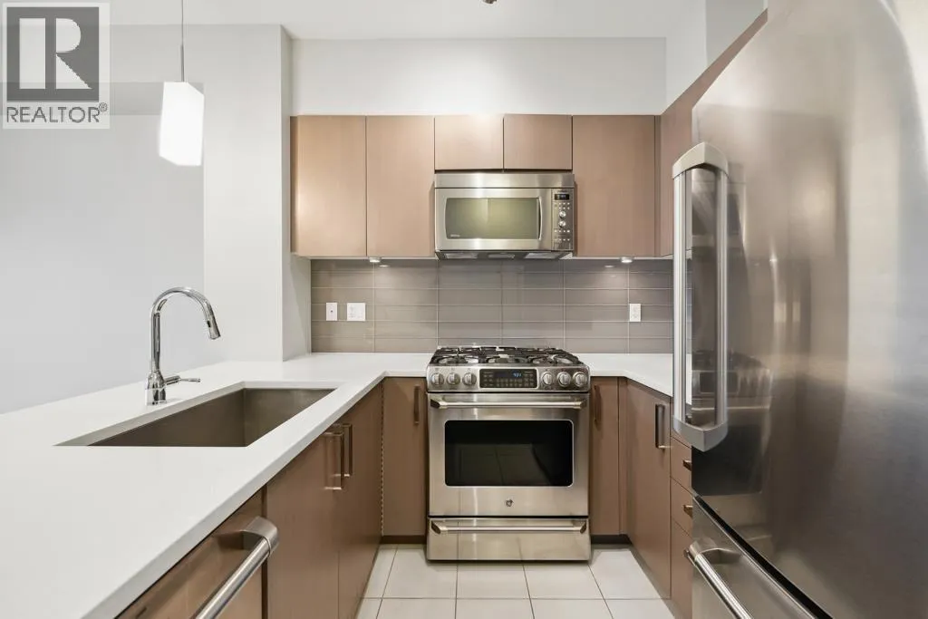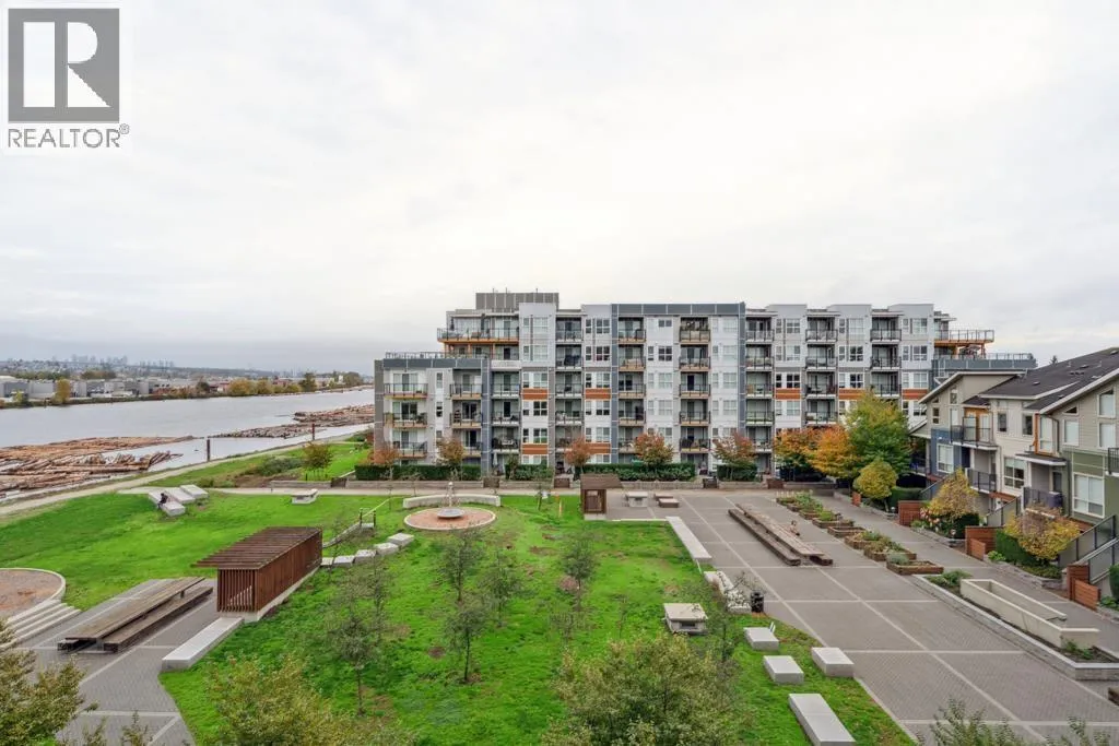 This 751sf 2 bedrooms, 2 bathrooms upper unit overlooks the community park with a water view. Efficient use of space maximizes use of interior square footage. The foyer has a 4 pcs second bathroom to the right and the second bedroom to the left. The second bedroom has a small closet, glass wall facing the hallway, but no exterior window. The open kitchen features 3 sides of cabinets, quartz countertops, Bosch stainless steel appliances including a 4-burner gas cooktop, Fisher & Paykel fridge, and glass tile backsplash. Beside the kitchen is the formal dining room and living featuring engineered wood flooring with access to the covered balcony. Primary bedroom has double closets and a 4 pcs ensuite. Unit also features geothermal heating and air conditioning throughout and one parking. (id:27476)