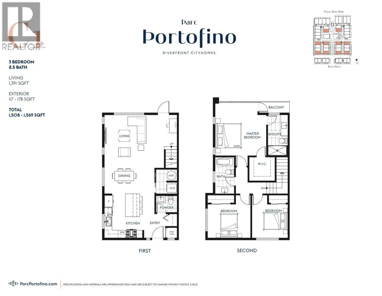 Parc Portofino by Dava Developments, an award winning developer. This stunning two storey townhouse has modern design featuring 1392 sqft of living space, 3 bedrooms and 2.5 bathrooms, highlighted by an open-concept kitchen with sleek quartz countertops, high-end appliances, and a gas cooktop. This end-unit is ideally positioned in the center of the complex, offering extra privacy and quietness. Includes two parking stalls. (id:27476)