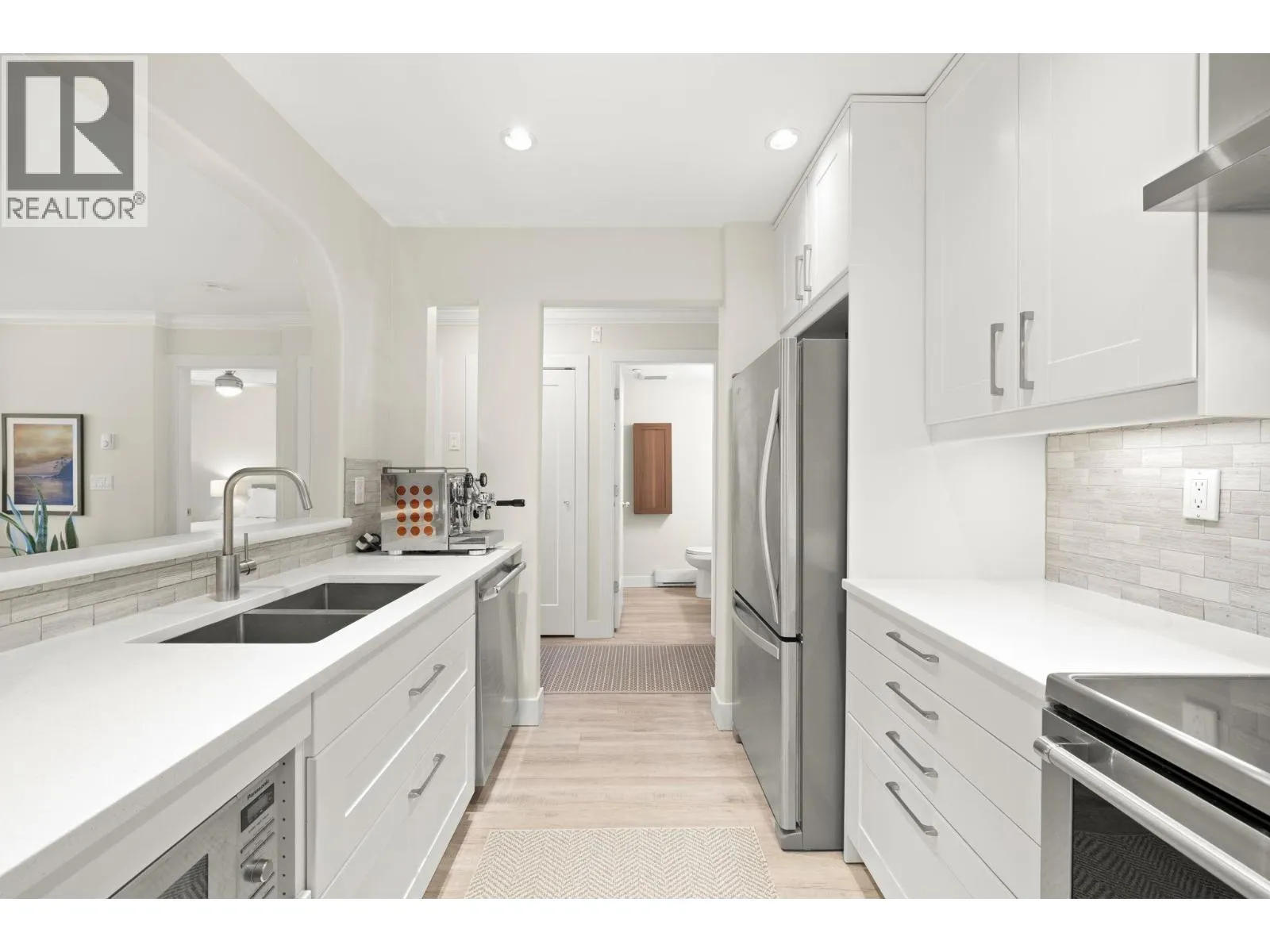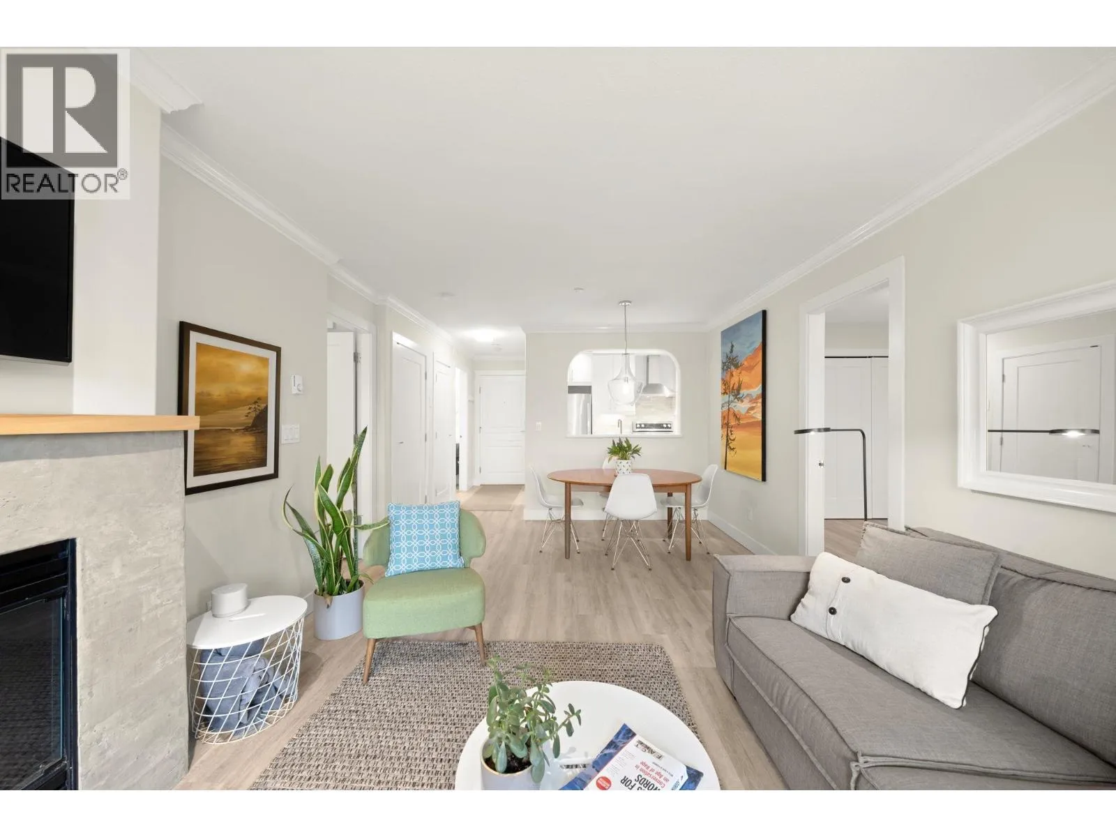 NAUTICA NORTH-gorgeous, 2 bdrm, 2 bath unit featuring a WALK OUT WEST FACING PATIO that opens onto the serene courtyard in this spectacular Steveston location. Beautifully updated kitchen w/quartz counters, stainless appliances, tile backsplash with walk in pantry/laundry area. Neutral paint, updated light fixtures, vinyl plank flrs & stacked stone fireplace surround give the unit a fresh designer feel. Spacious primary bedroom w/views to the green space has ensuite with tub. Huge second bed (perfect for kids) & second bathroom with tiled shower. 2 parking (tandem). Well maintained complex, close to walking paths, beautifully landscaped grounds, lagoons, the West Dyke Trails, Marina & Steveston Village. Pets are welcome, non-smoking bldg, lots of visitor parking! (id:27476)