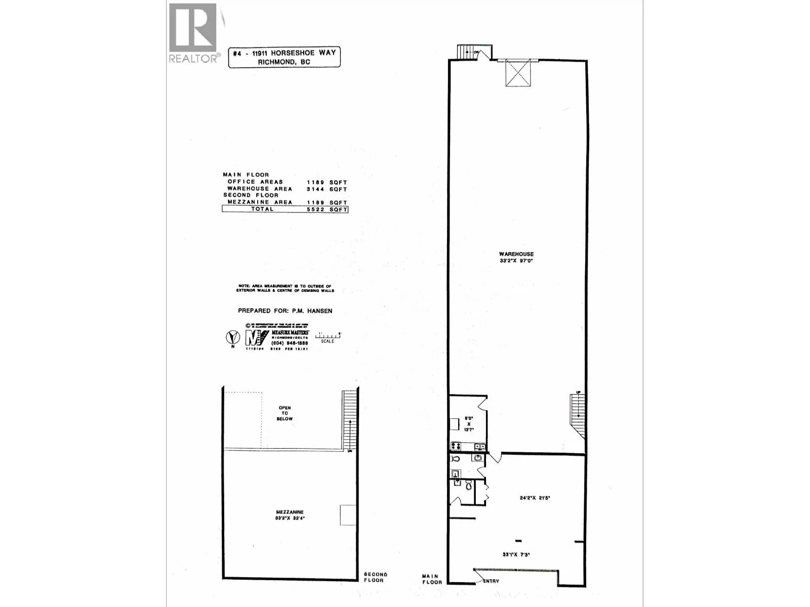 Flexible, functional, and strategically located, position your business in the heart of Riverside Industrial Park at 4-11191 Horseshoe Way. This IB1-zoned strata warehouse offers 5,522 SF total, including 1,189 SF of improved office space with two bathrooms, 3,144 SF of clear-span warehouse with 20' ceilings, full loading dock and above grade-level bay with dock leveler, plus kitchen/meeting area, and 1,189 SF of second-floor mezzanine space. Four parking stalls included with additional visitor parking available. IB1 zoning permits 25+ uses, providing exceptional flexibility for a broad range of businesses. Currently a vacant tenanted property offering versatility for both owner-users and investors. The existing tenant is open to early lease termination, presenting a strong opportunity for an owner-occupier seeking near-term possession. Alternatively, investors can secure stable income of $7,822.83 per month through February 2028, increasing to $8,052.92 per month until 2031. Easy to show! (id:27476)
